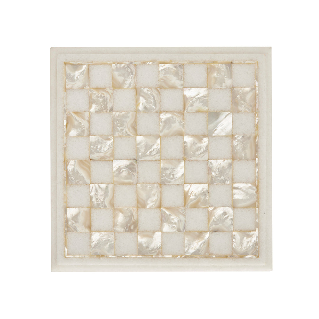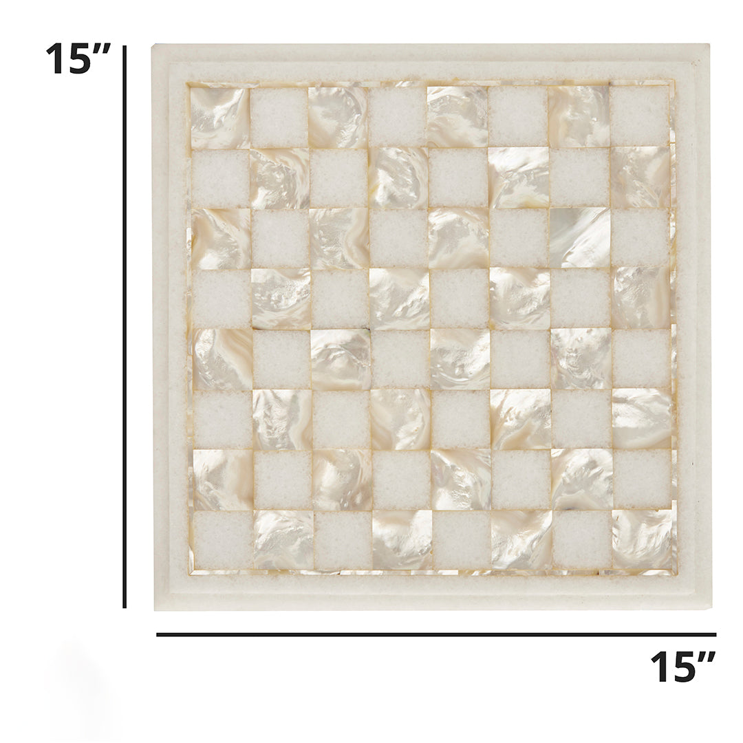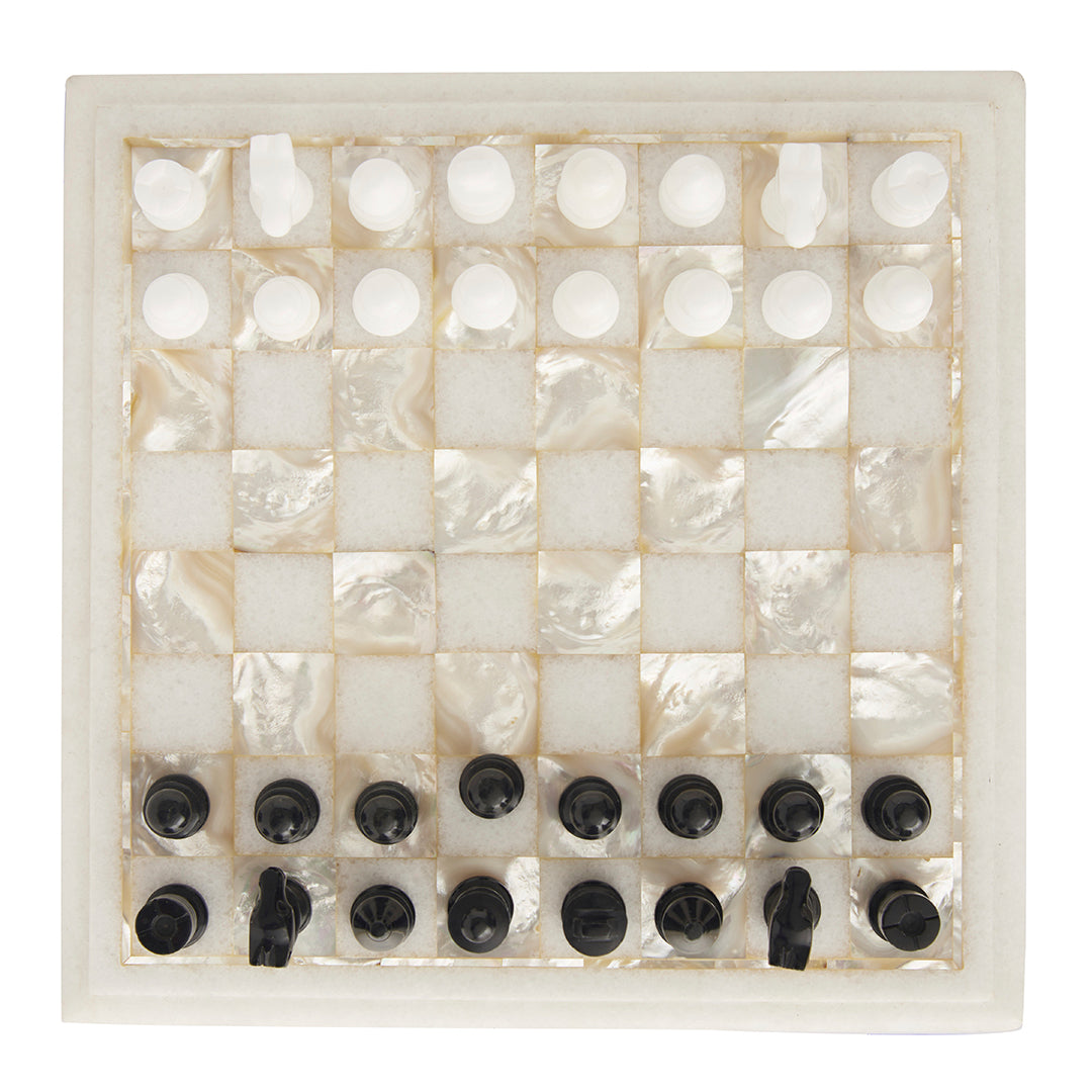 Material: White marble board + Mother of Pearl inlay checks + marble chess pieces