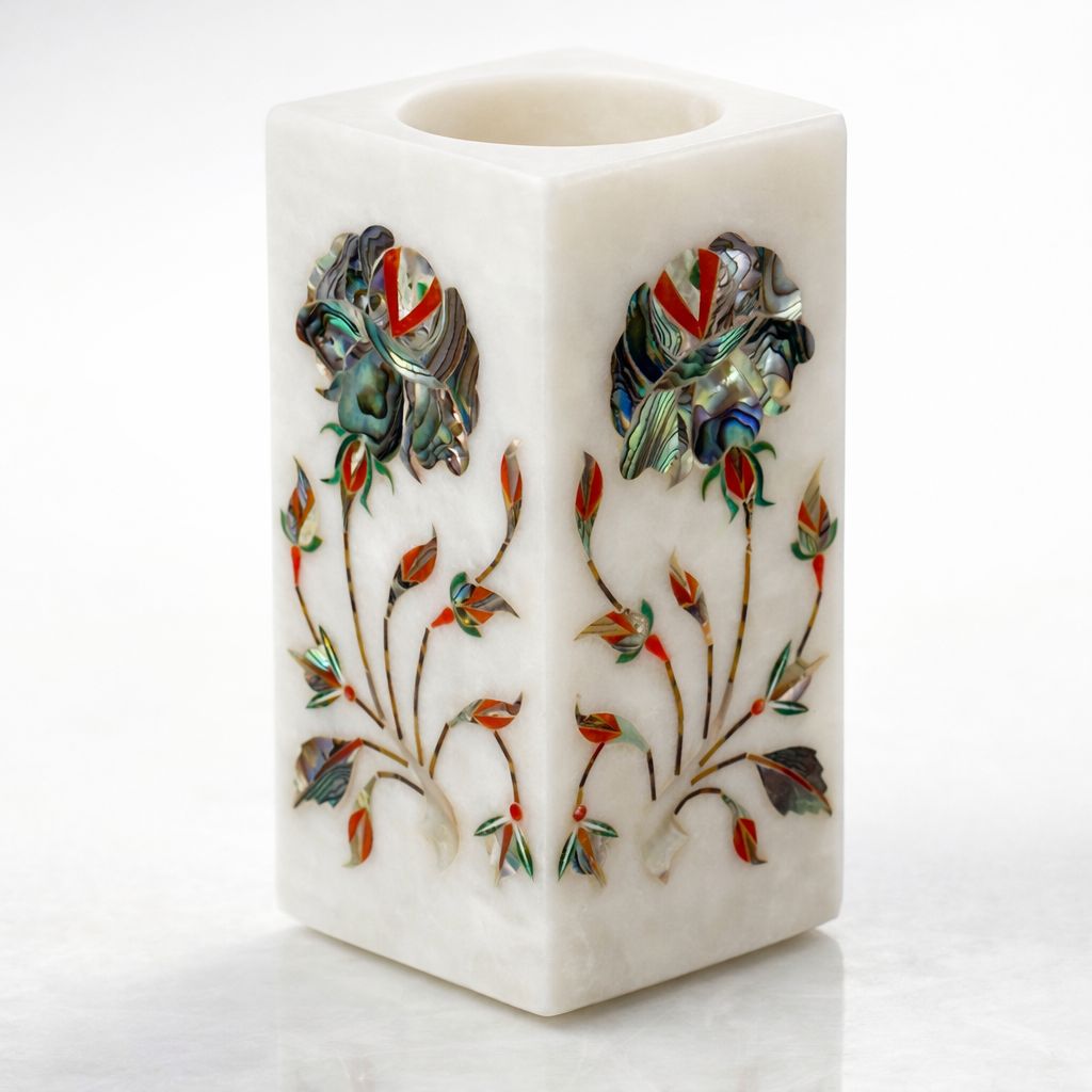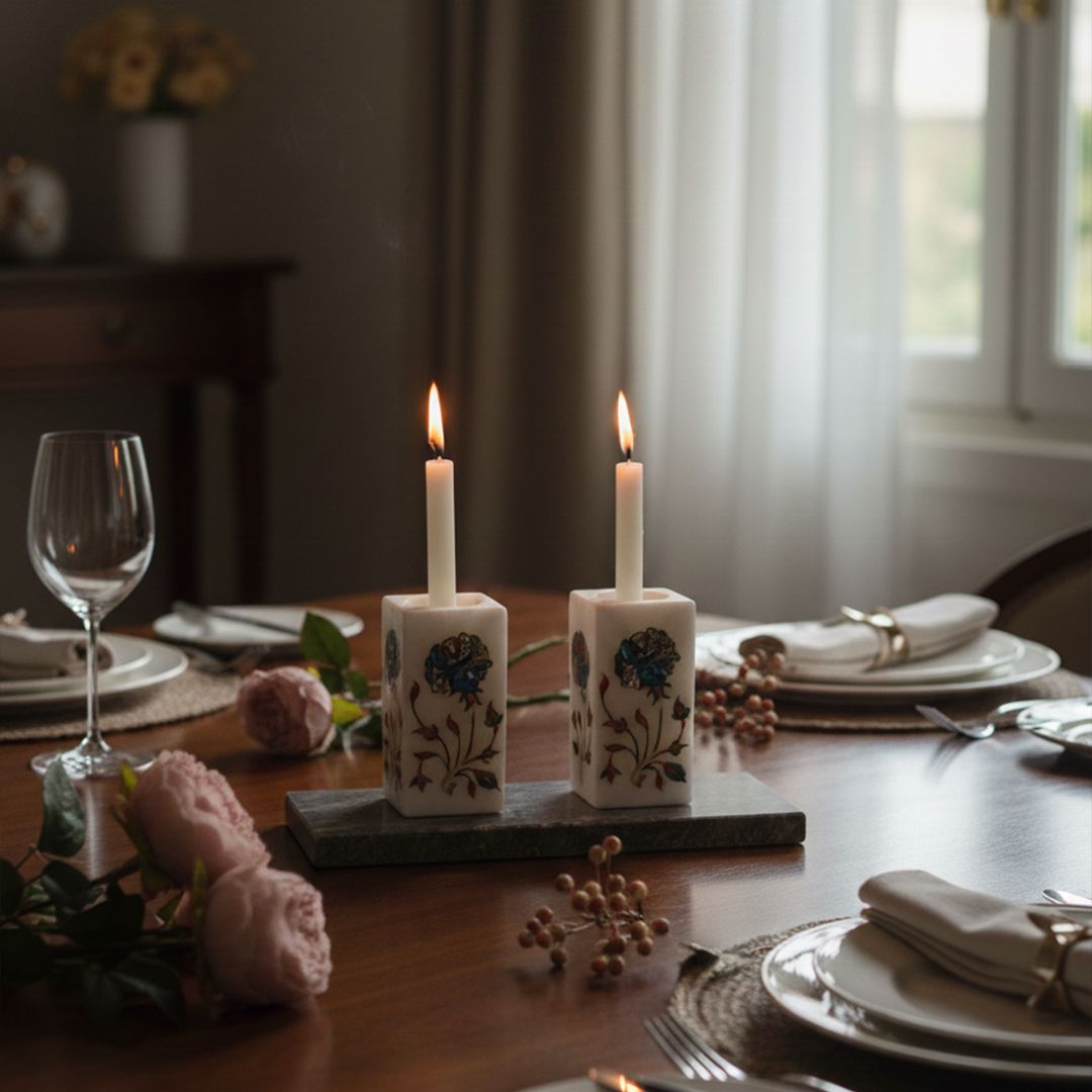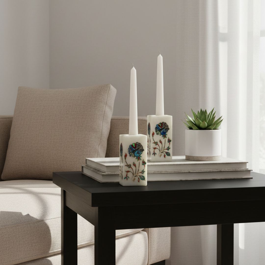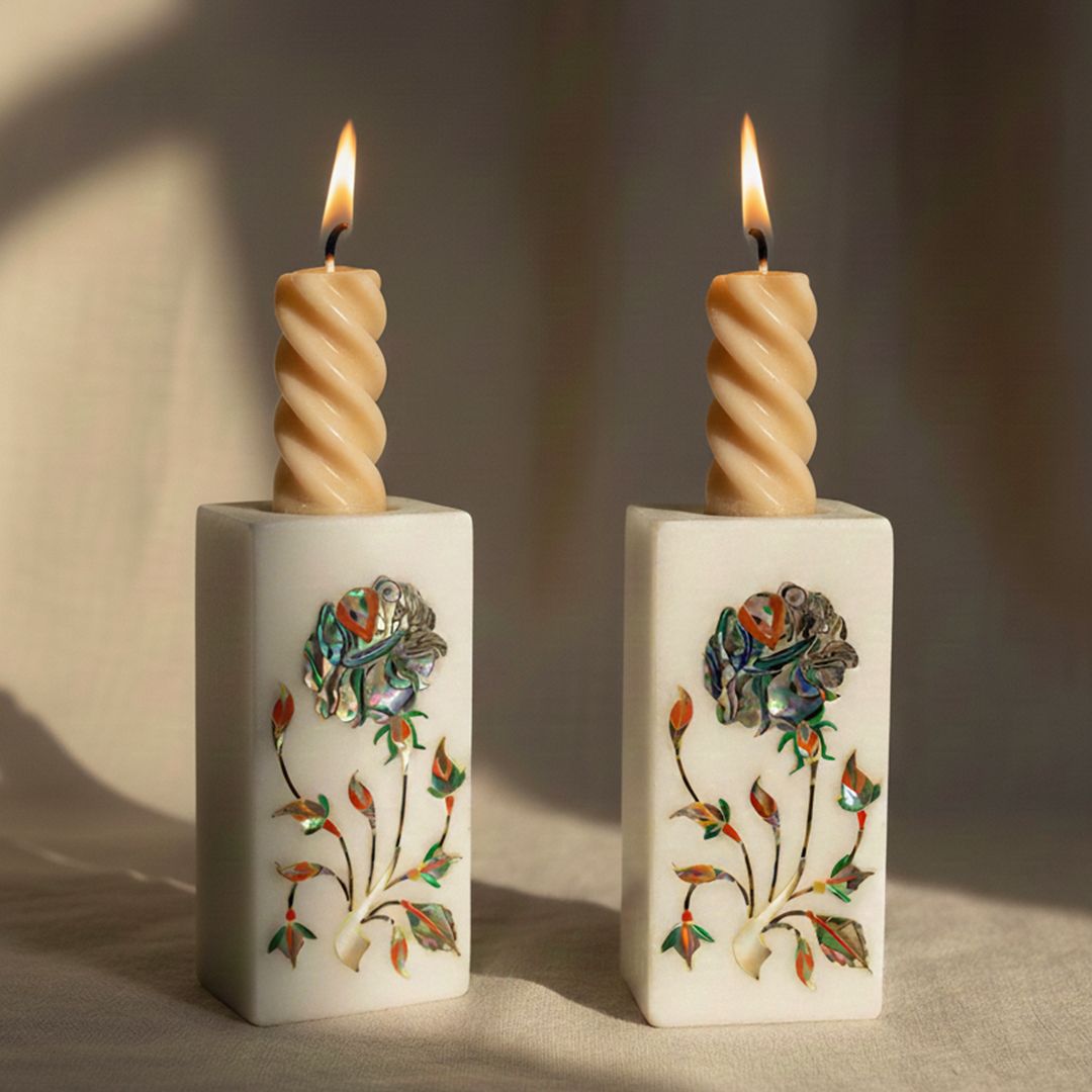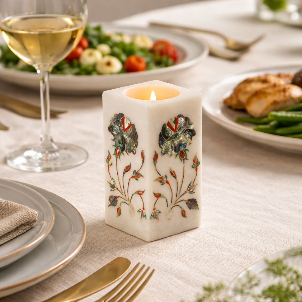 Transform your space with this exquisite handcrafted white marble candle holder, featuring stunning floral pietra dura inlay work. Each piece is a unique work of art, meticulously crafted with genuine gemstones, including iridescent abalone shell, warm carnelian, lustrous mother-of-pearl, and rich malachite.