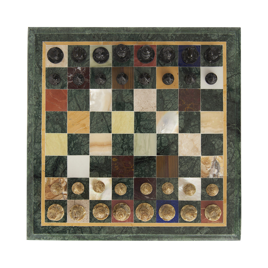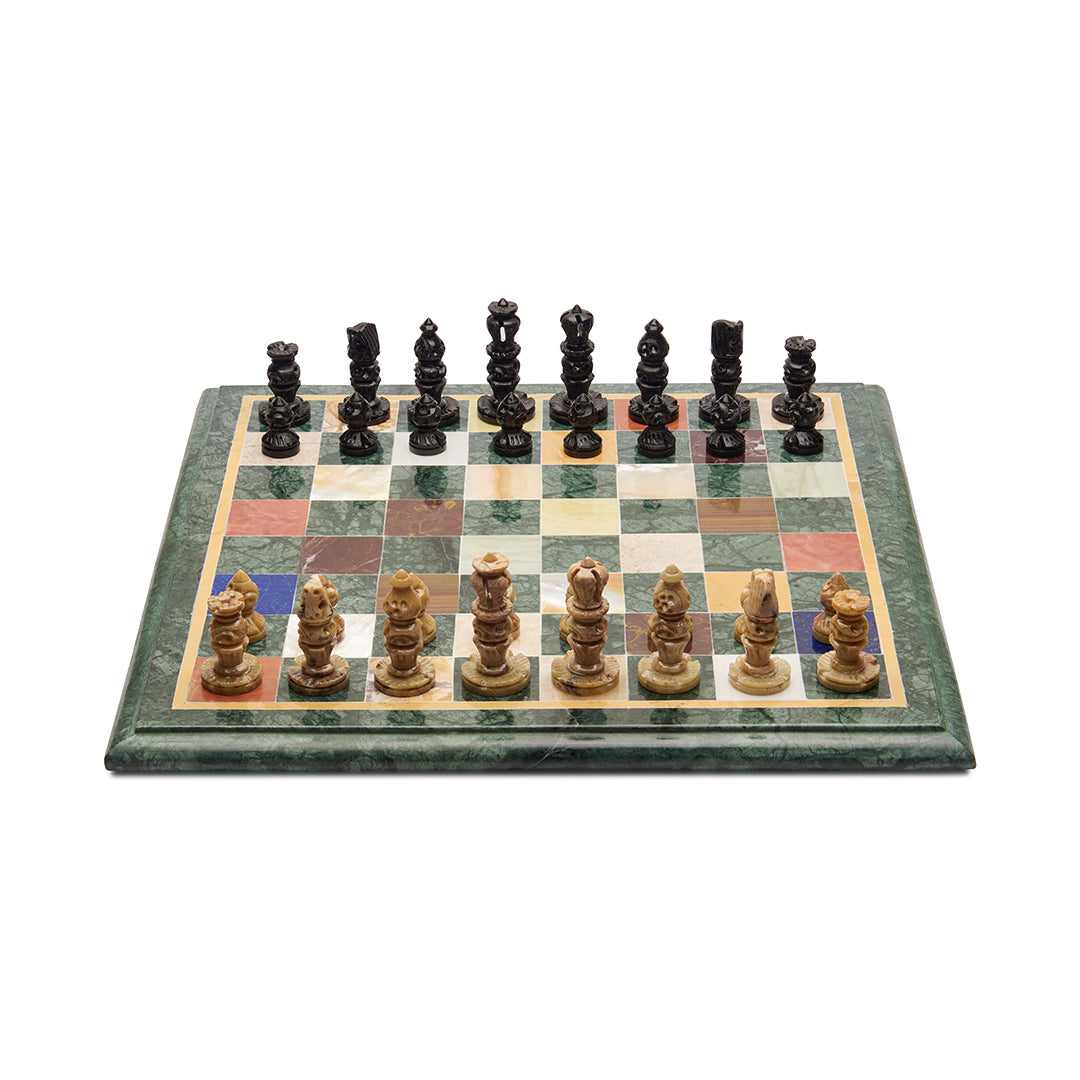 Material: Green marble board + multi semi-precious stone inlay checks + soapstone chess pieces