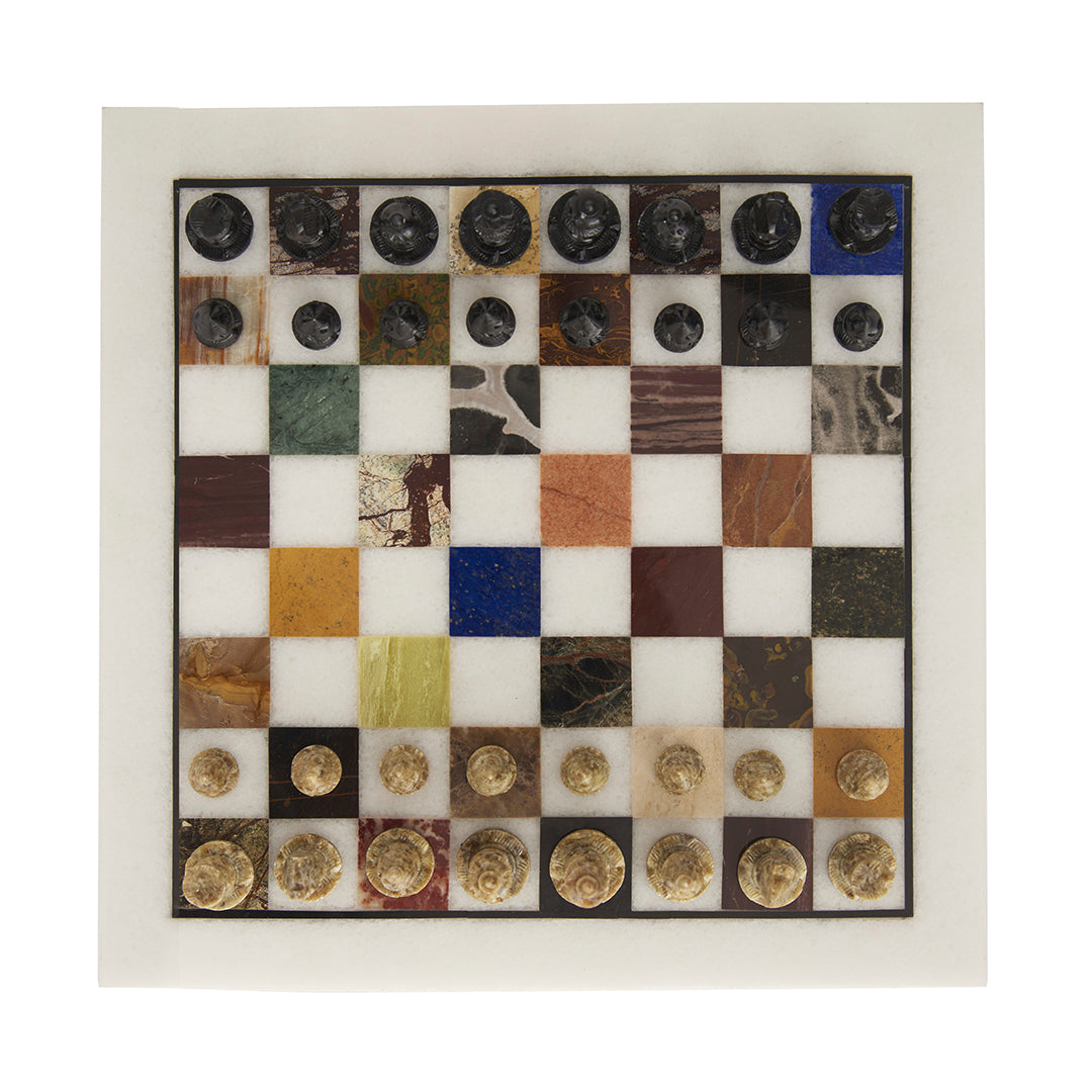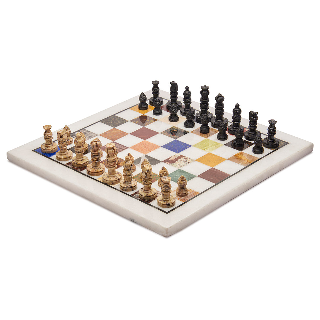 Material: White marble board + multi semi-precious stone inlay checks + soapstone chess pieces.
