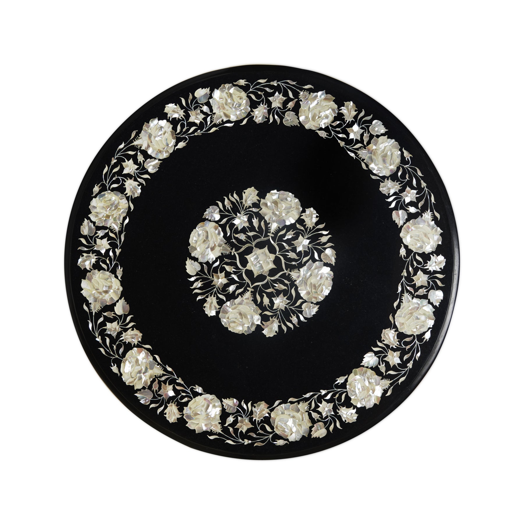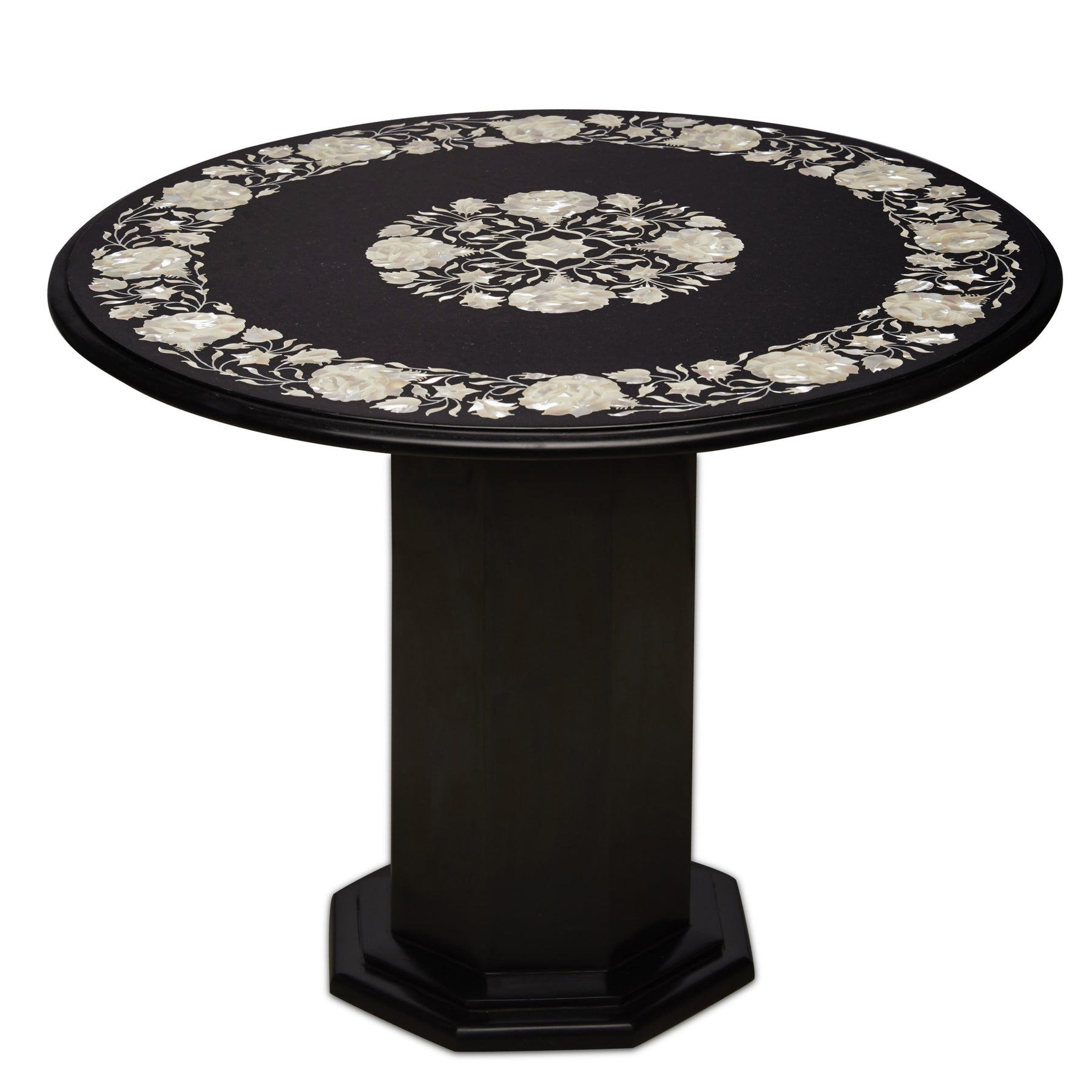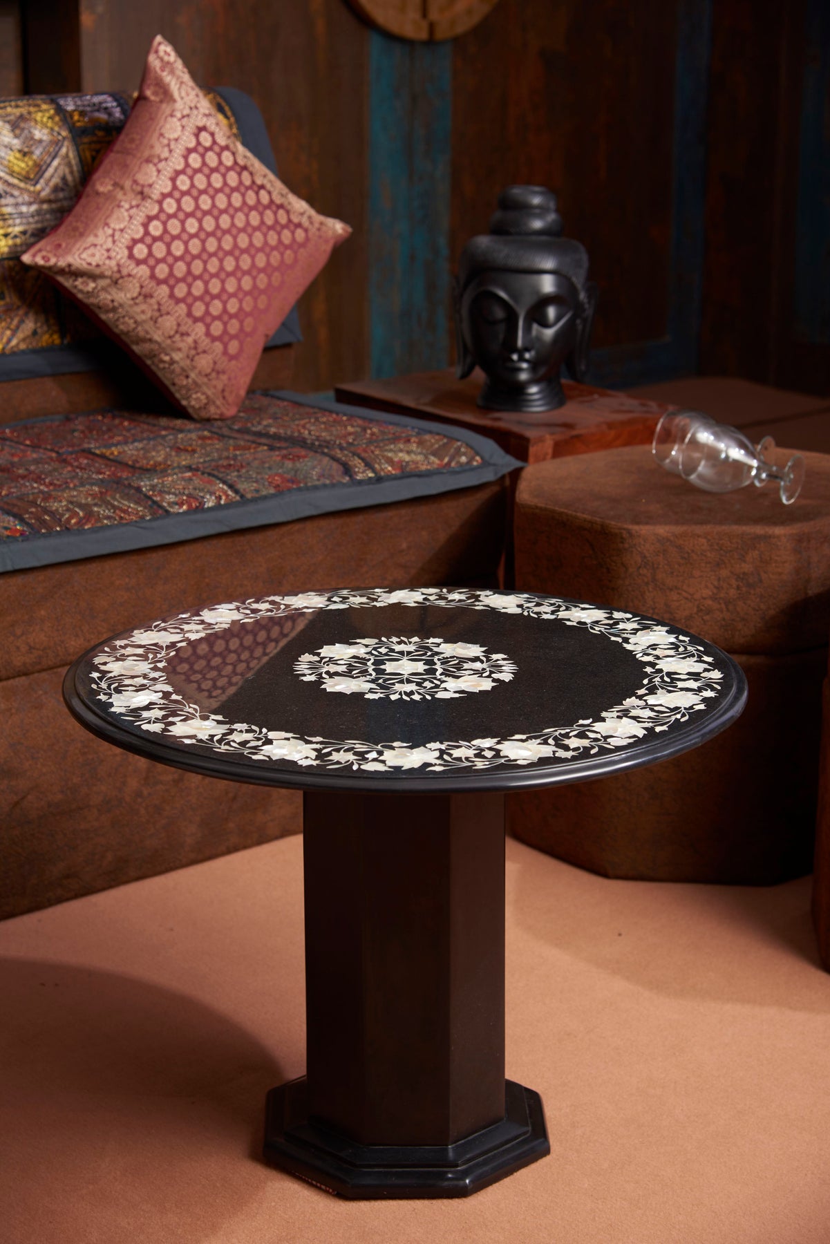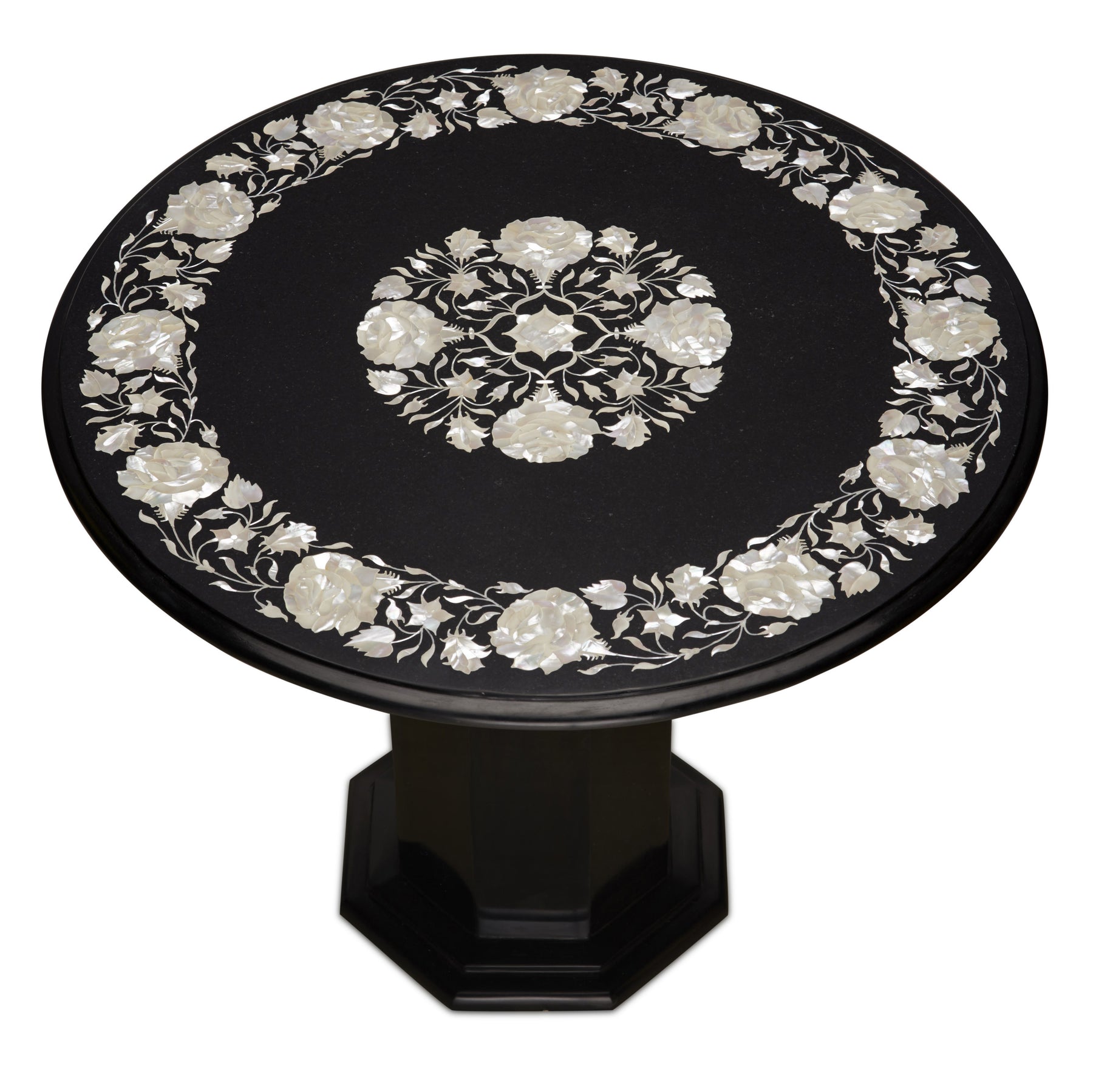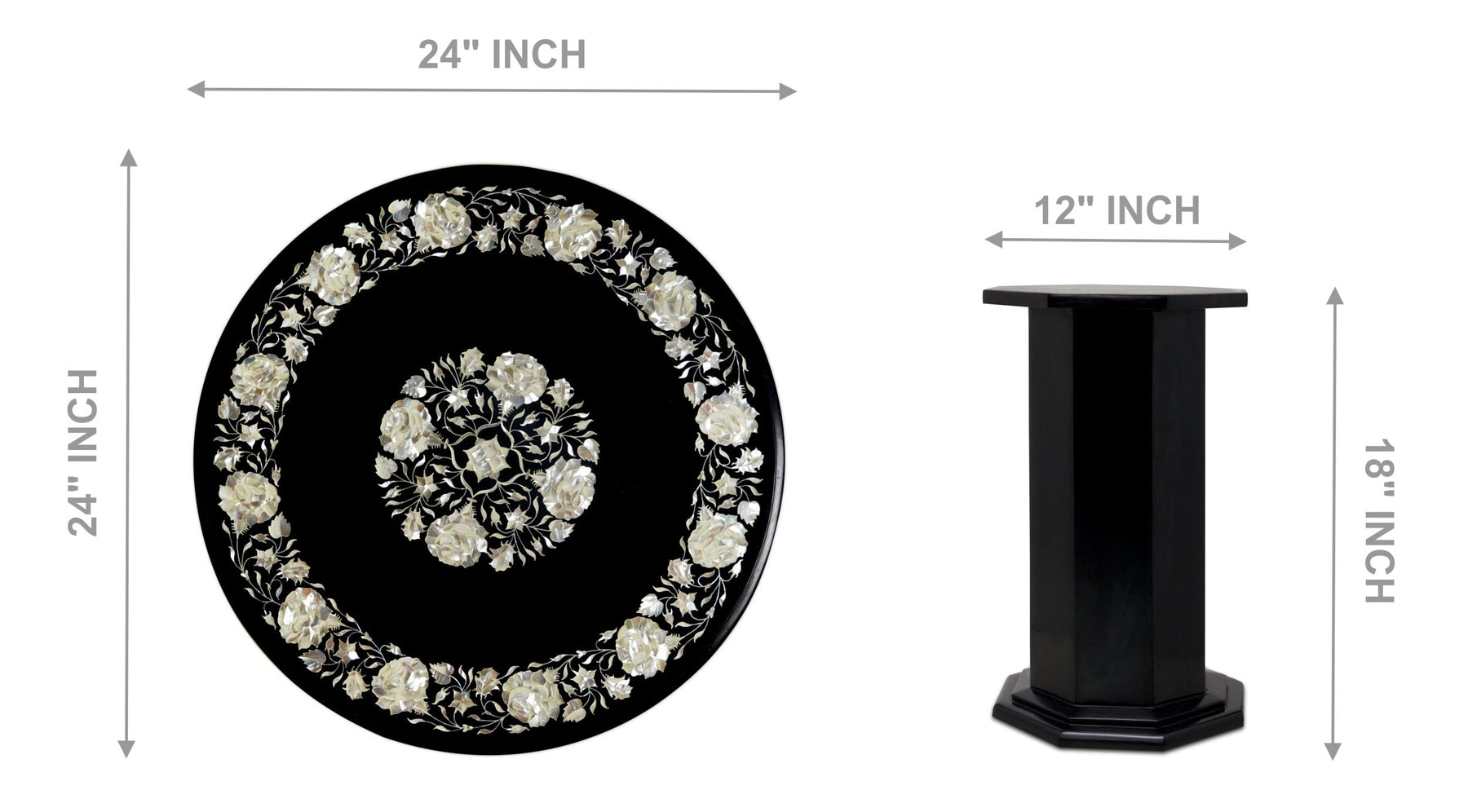 This black marble mother of pearl rose inlay table is a tribute to classic Mughal artistry and refined luxury. Crafted using the centuries-old pietra dura technique, each rose motif is meticulously hand-cut from natural mother of pearl and inlaid into premium black marble.