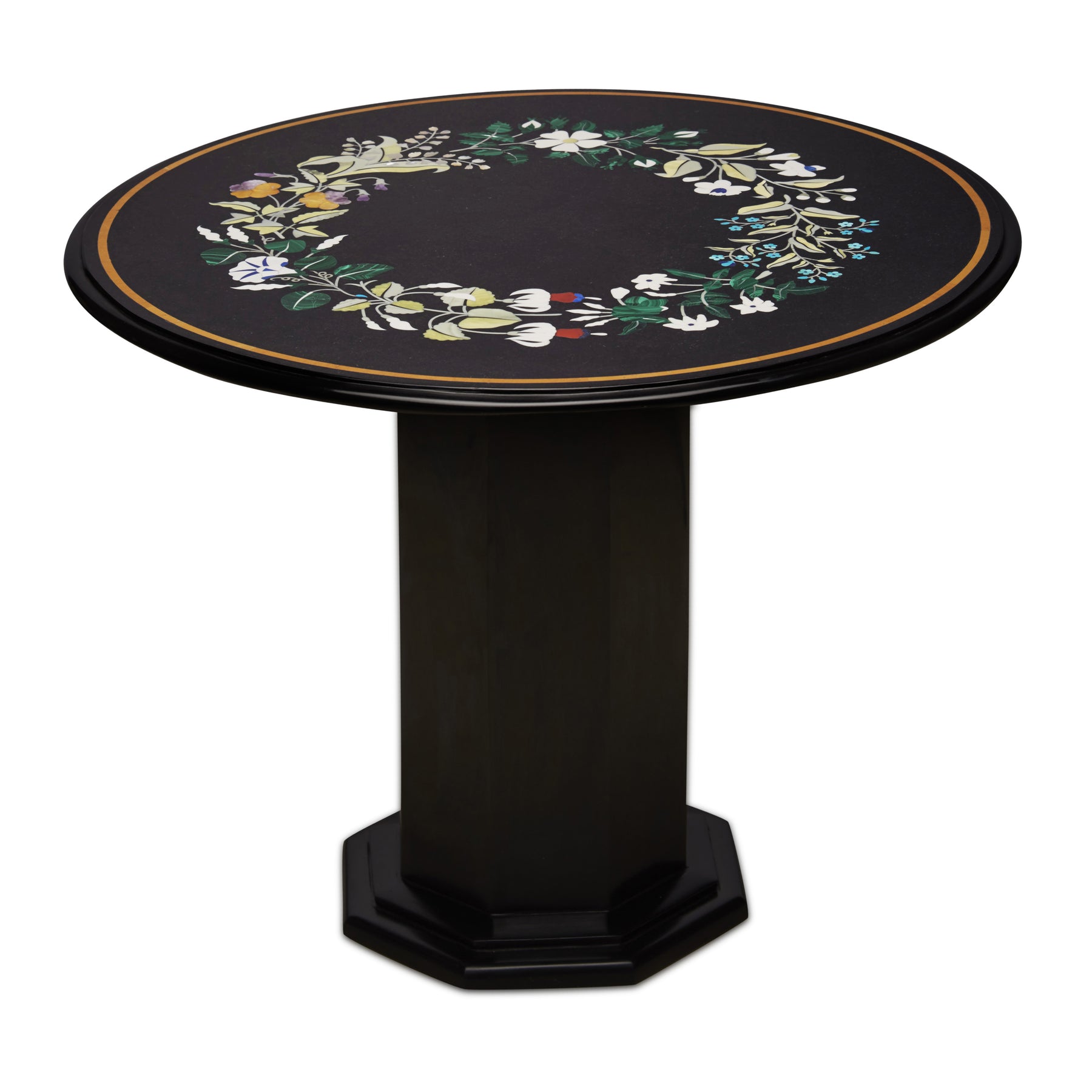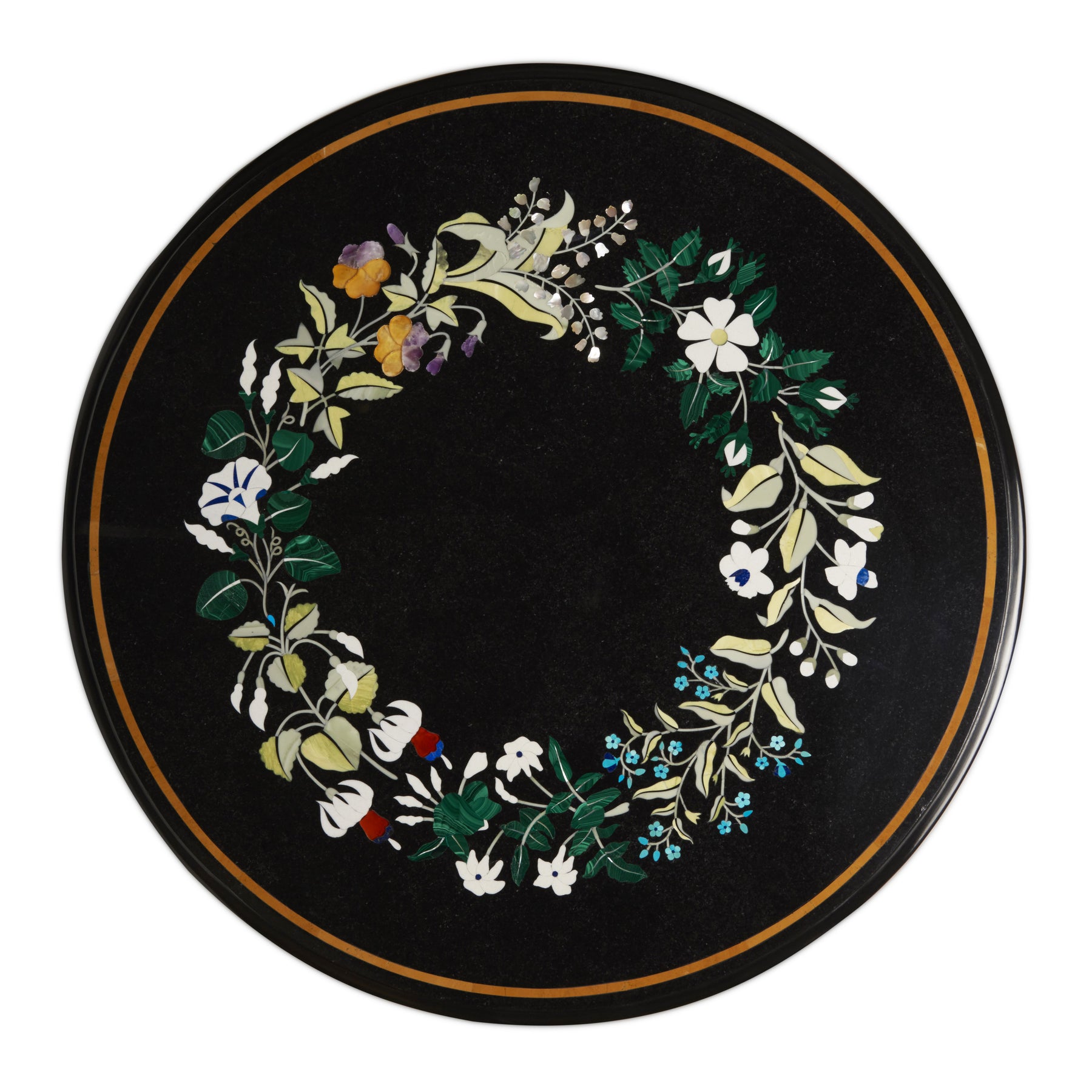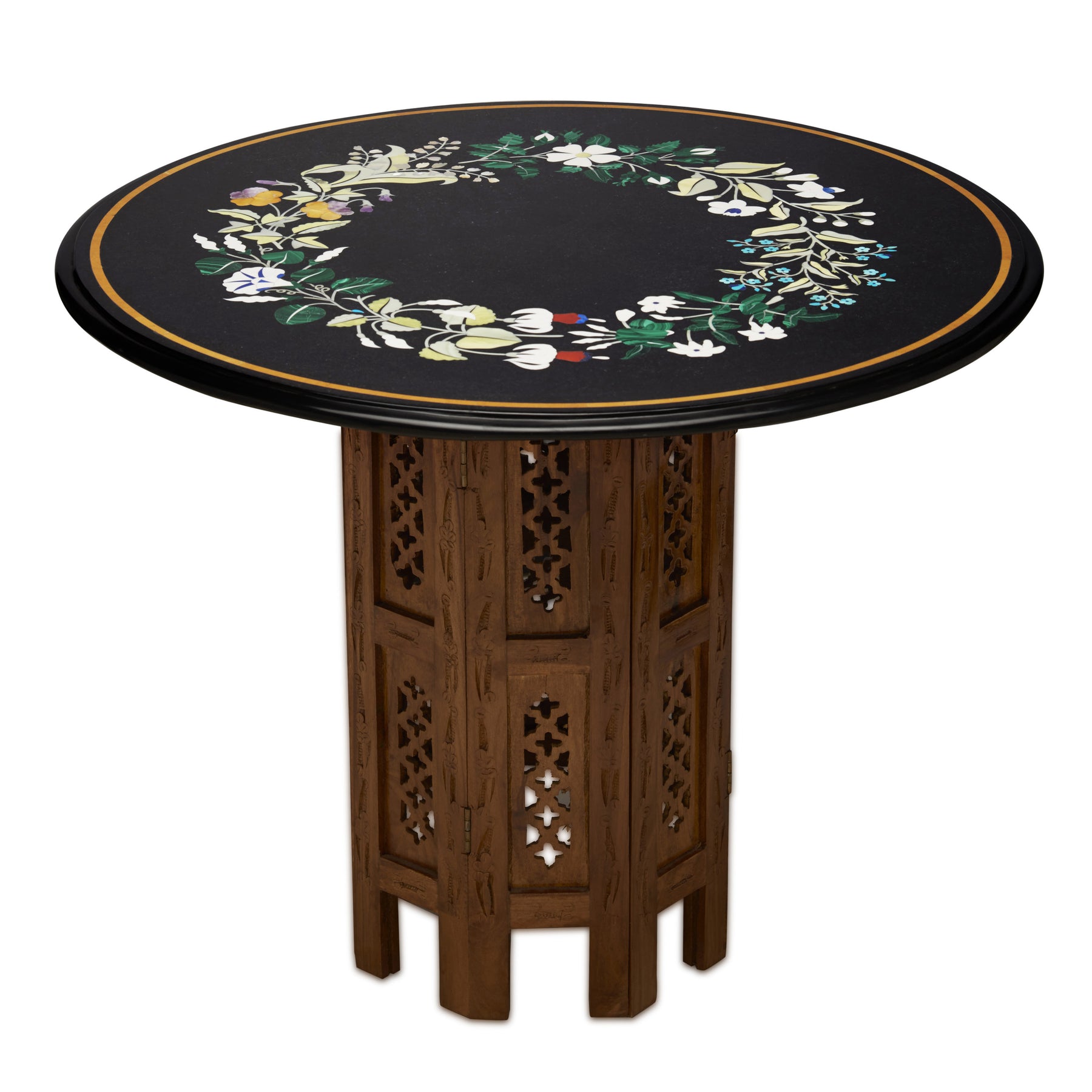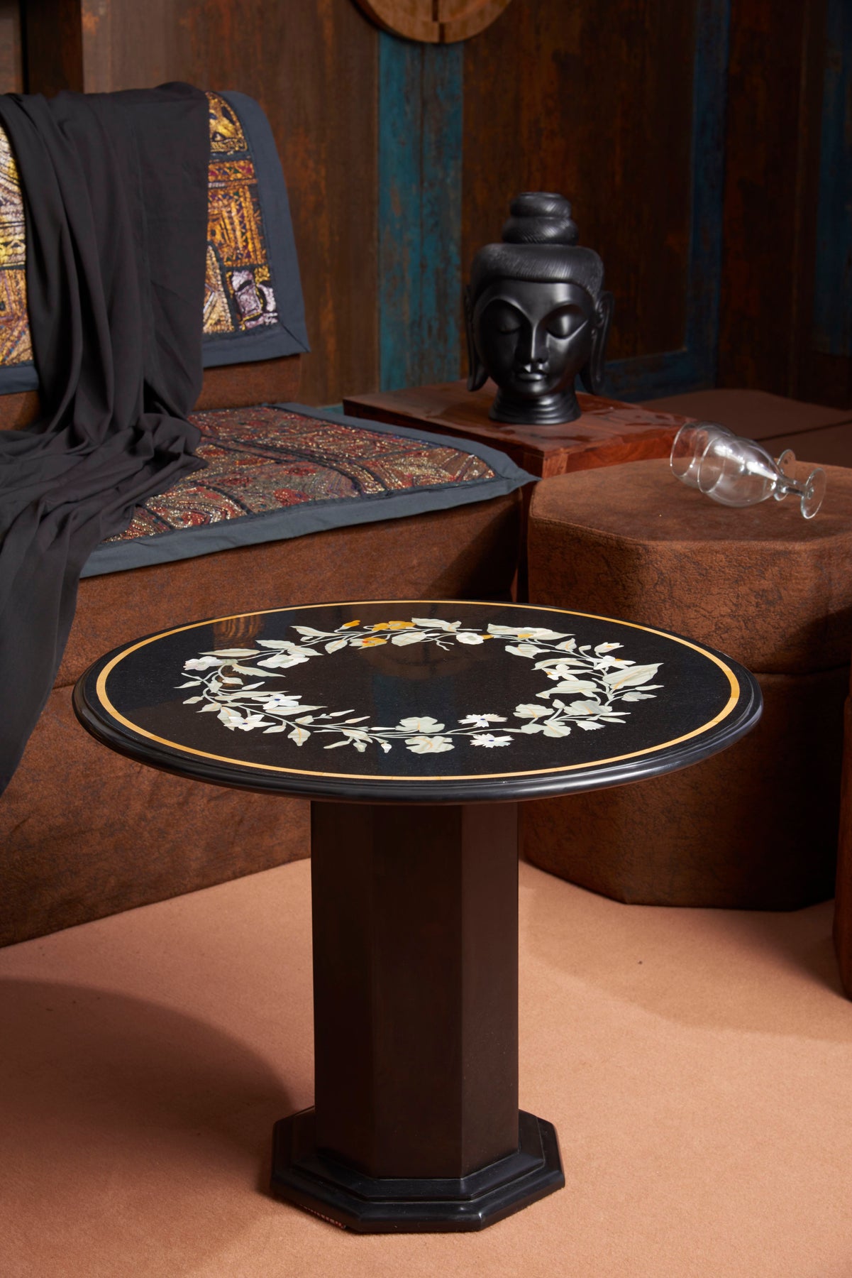 Bring timeless Mughal artistry into your living space with this handcrafted black marble floral inlay table, made using the traditional pietra dura technique. Each table features a meticulously hand-cut arrangement of semi-precious stones forming an elegant floral wreath design, set against a deep black marble base.