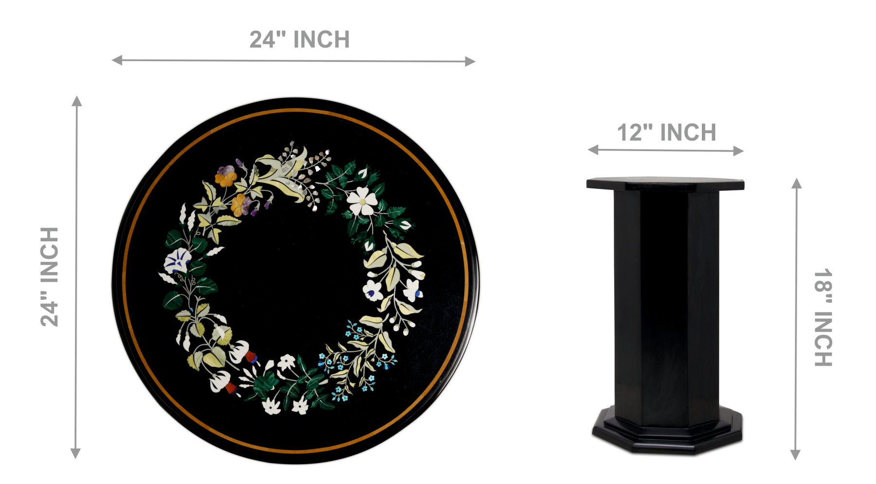 Handcrafted Black Marble Floral Inlay Side Table – 24” Pietra Dura Accent Table | Table Top Only or With Stand