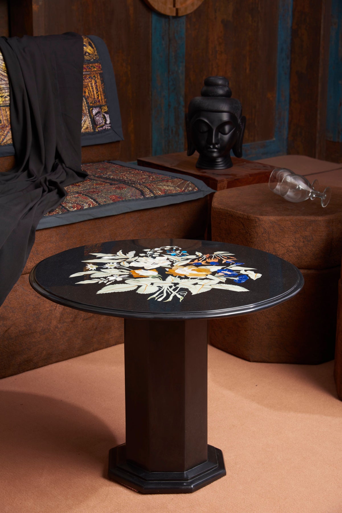 Round black marble inlay tabletop close-up