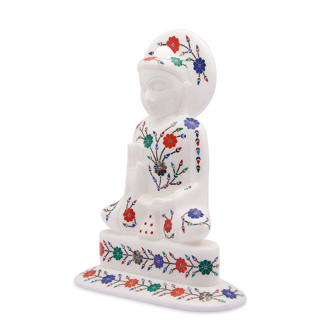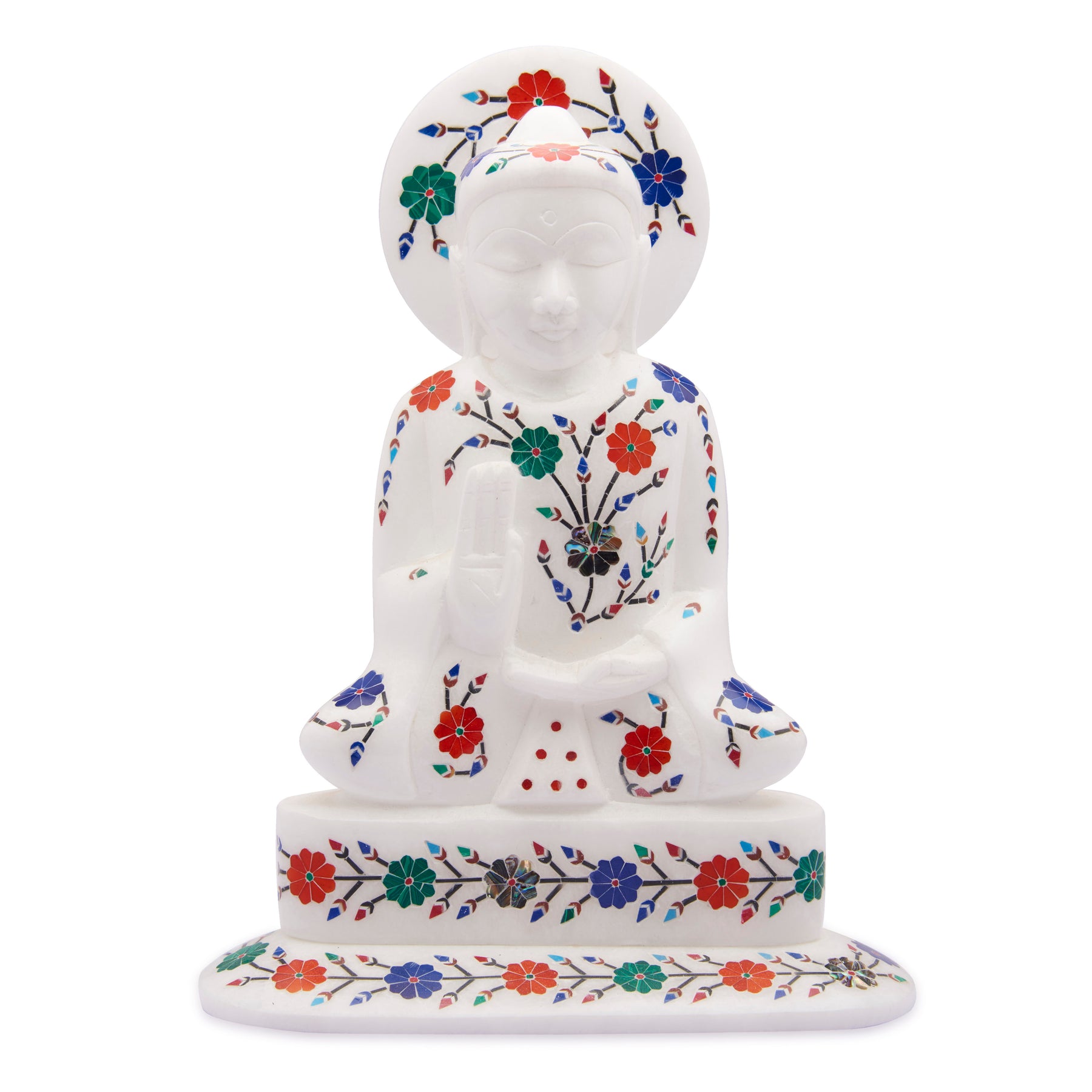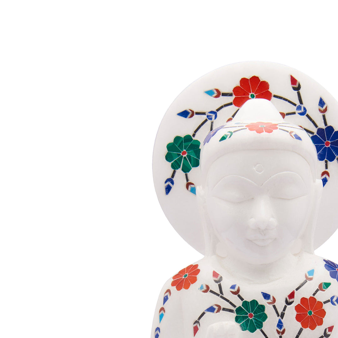A serene 6-inch Buddha statue carved from pure white marble and adorned with traditional pietra dura inlay — a centuries-old craft native to Agra. Each floral motif is set by hand using semiprecious stones such as lapis lazuli, carnelian, malachite, and abalone shell, giving the sculpture a gentle play of color against the cool marble surface.