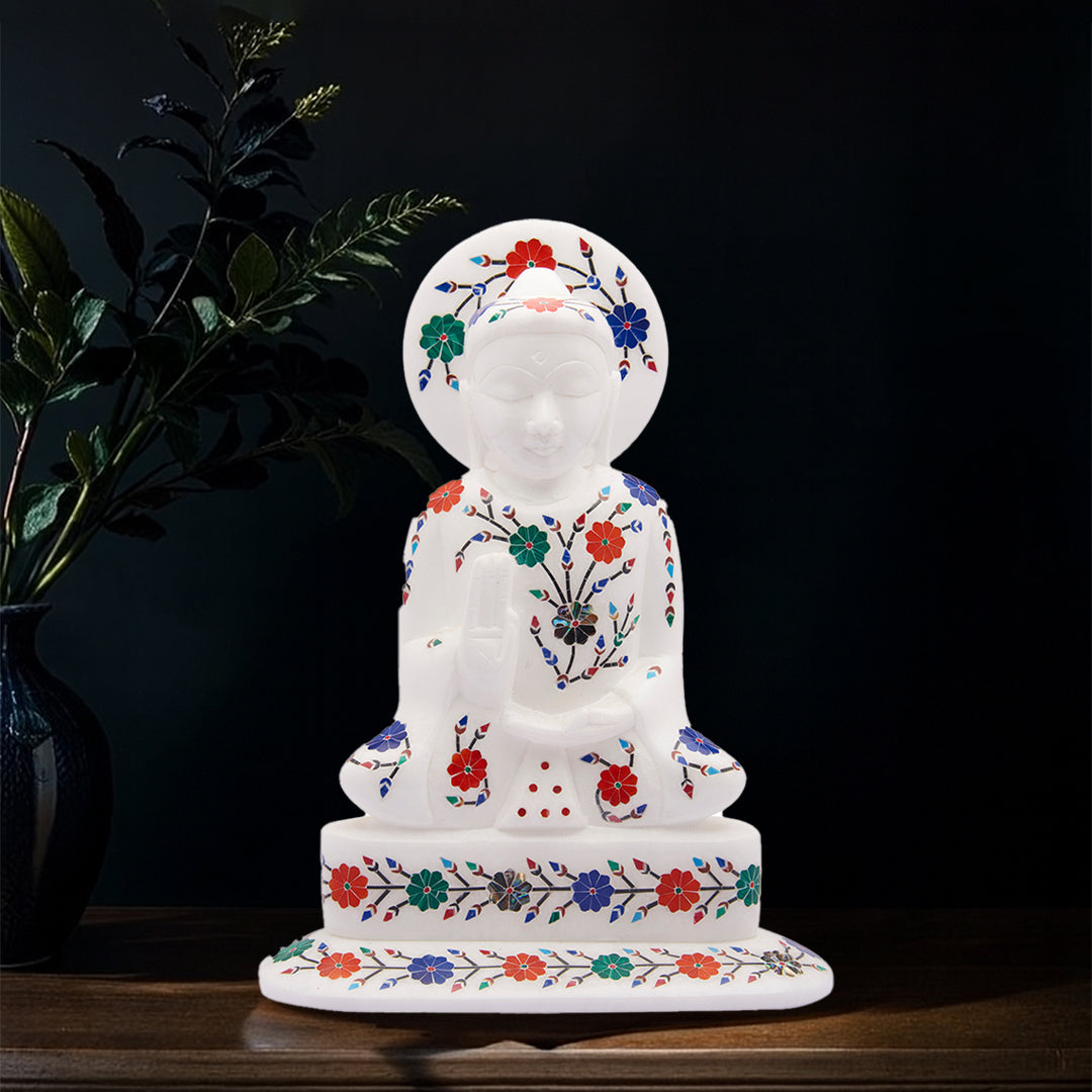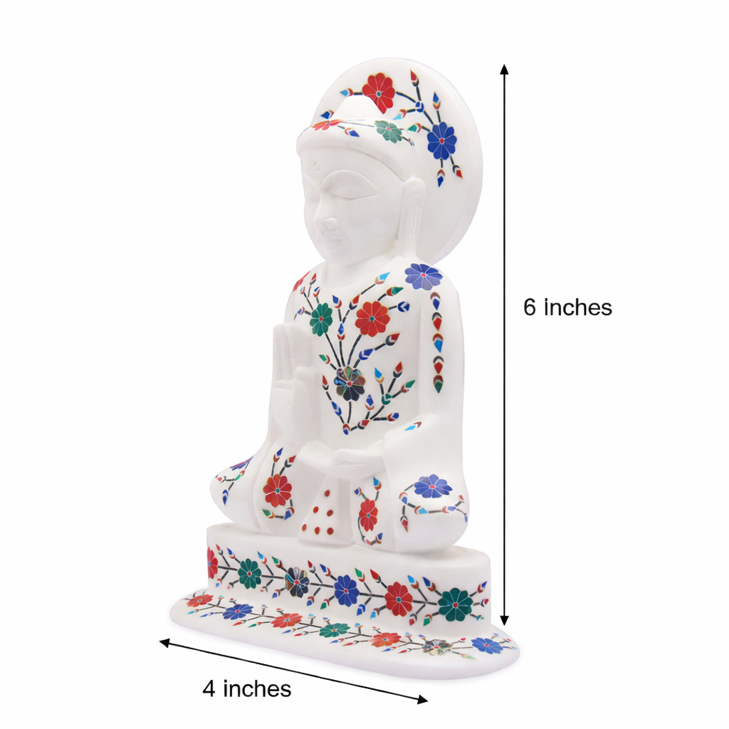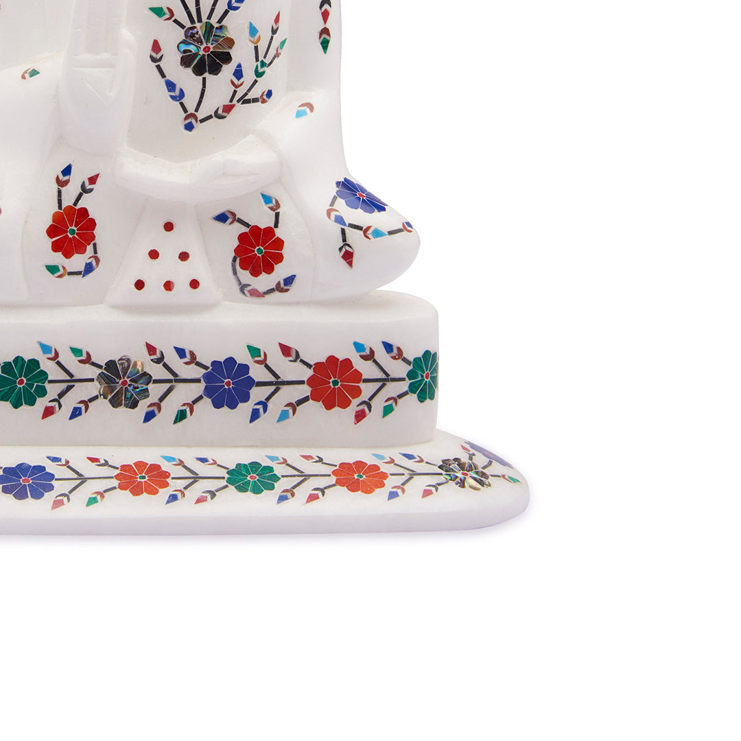 Every statue is handcrafted from a single block of white marble and detailed by artisans who specialize in Mughal-style inlay work. The gemstones are precisely cut, polished, and inlaid into the marble, resulting in a vibrant yet refined pattern. The finished piece holds both artistic and spiritual value — blending calm expression with timeless craftsmanship.