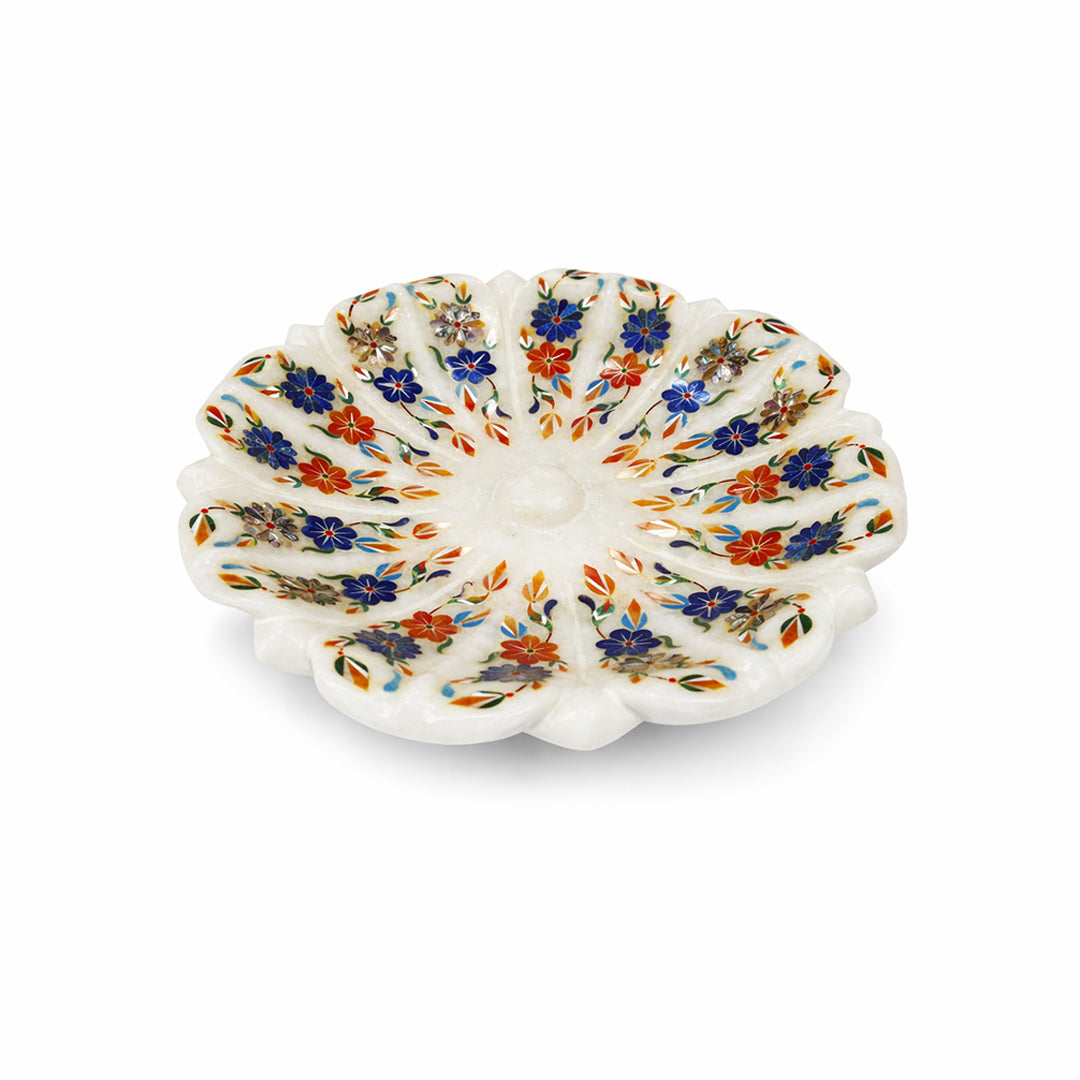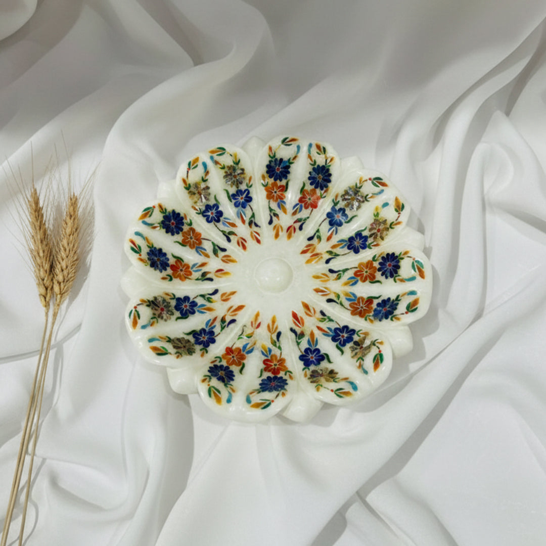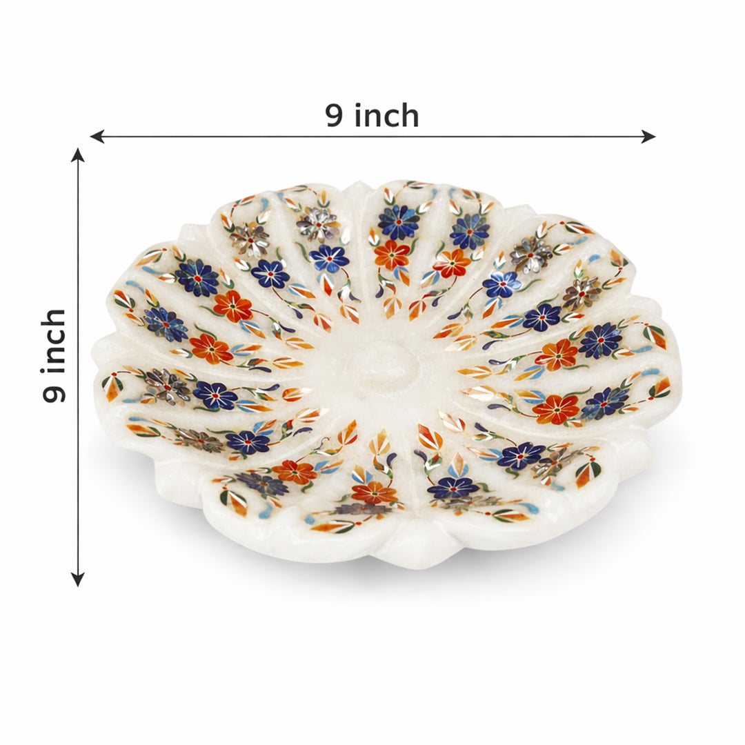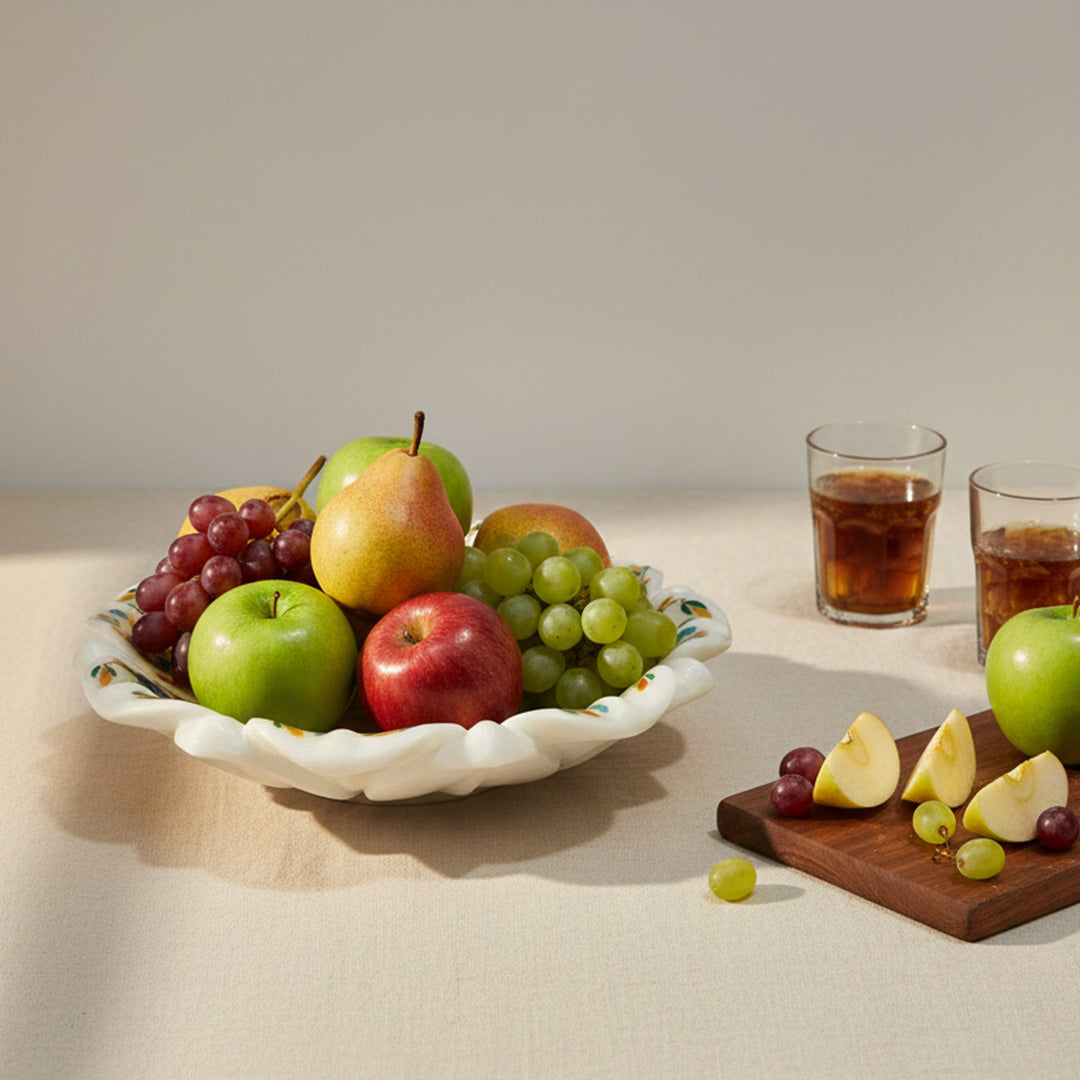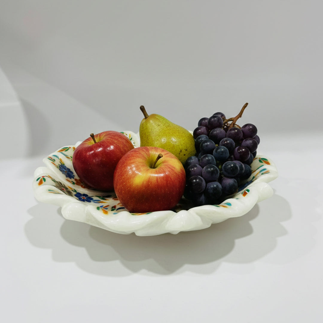 Elevate everyday serving into an artistic experience with this Handcrafted White Marble Floral Inlay Fruit Bowl. Designed using natural white marble and meticulously embedded with multicolored semi-precious stones, this bowl embodies heritage craftsmanship and contemporary sophistication. The scalloped floral form enhances its decorative appeal while remaining highly functional for serving fruits, dry snacks, or as a centerpiece accent. Whether placed on a dining table, coffee table, or console, it instantly becomes a focal point that radiates luxury and refinement. Crafted by skilled artisans, each bowl is unique — subtle variations in stone texture and color celebrate the authenticity of natural marble and hand inlay techniques.