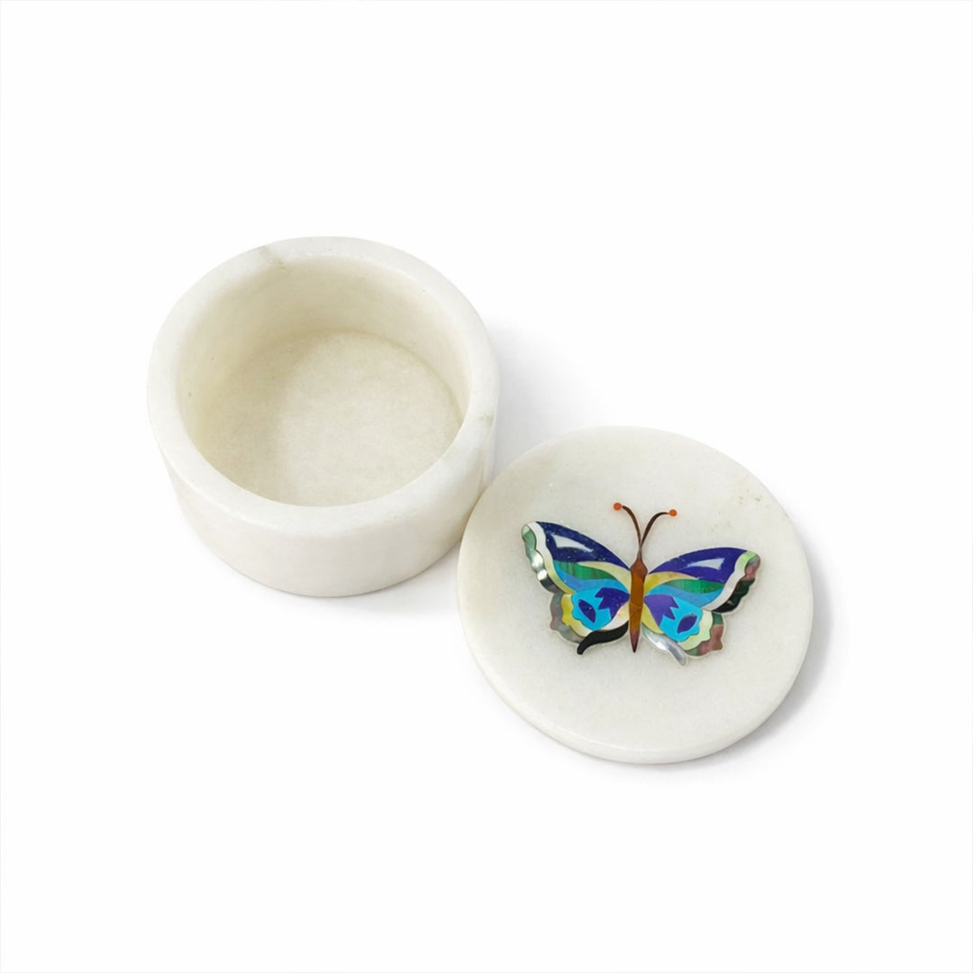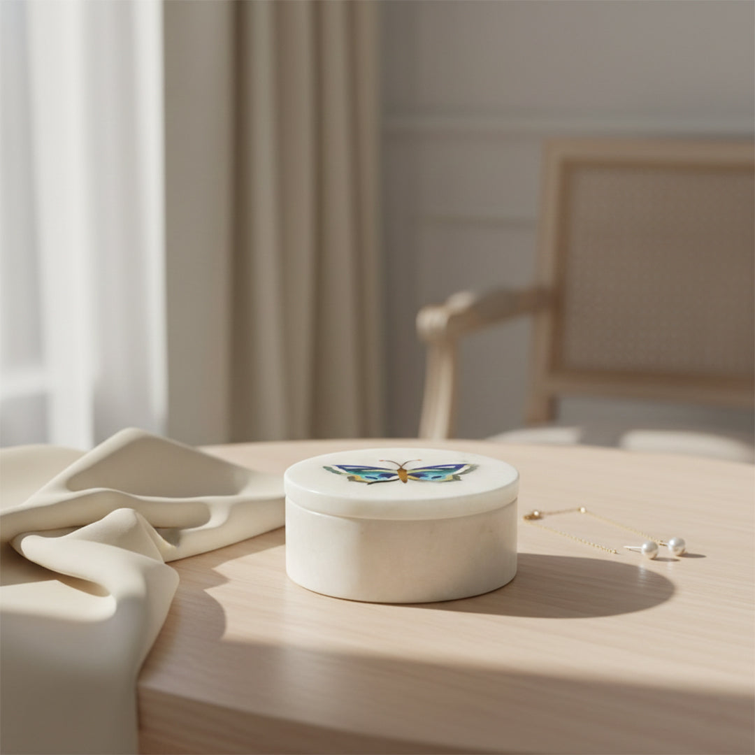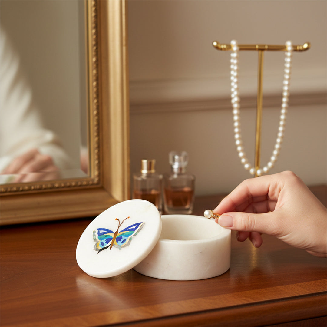 Bring refined luxury to your vanity or console with this handcrafted white marble jewelry box. Carved from natural stone and finished with a smooth polish, the box is crowned with an intricate butterfly inlay crafted using genuine semi-precious stones. Its compact size makes it ideal for rings, studs, pendants, and keepsakes, while the artistic lid transforms it into a decorative statement piece. Whether placed in a bedroom, dressing table, or living space, this marble trinket box adds sophistication without overwhelming the setting.
