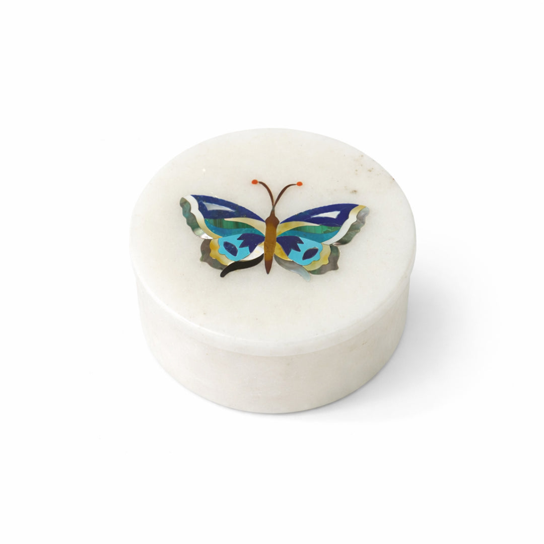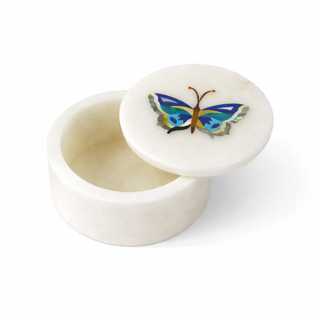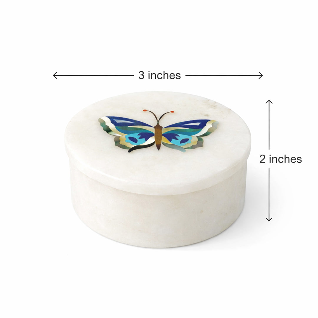 Bring refined luxury to your vanity or console with this handcrafted white marble jewelry box. Carved from natural stone and finished with a smooth polish, the box is crowned with an intricate butterfly inlay crafted using genuine semi-precious stones. Its compact size makes it ideal for rings, studs, pendants, and keepsakes, while the artistic lid transforms it into a decorative statement piece. Whether placed in a bedroom, dressing table, or living space, this marble trinket box adds sophistication without overwhelming the setting.