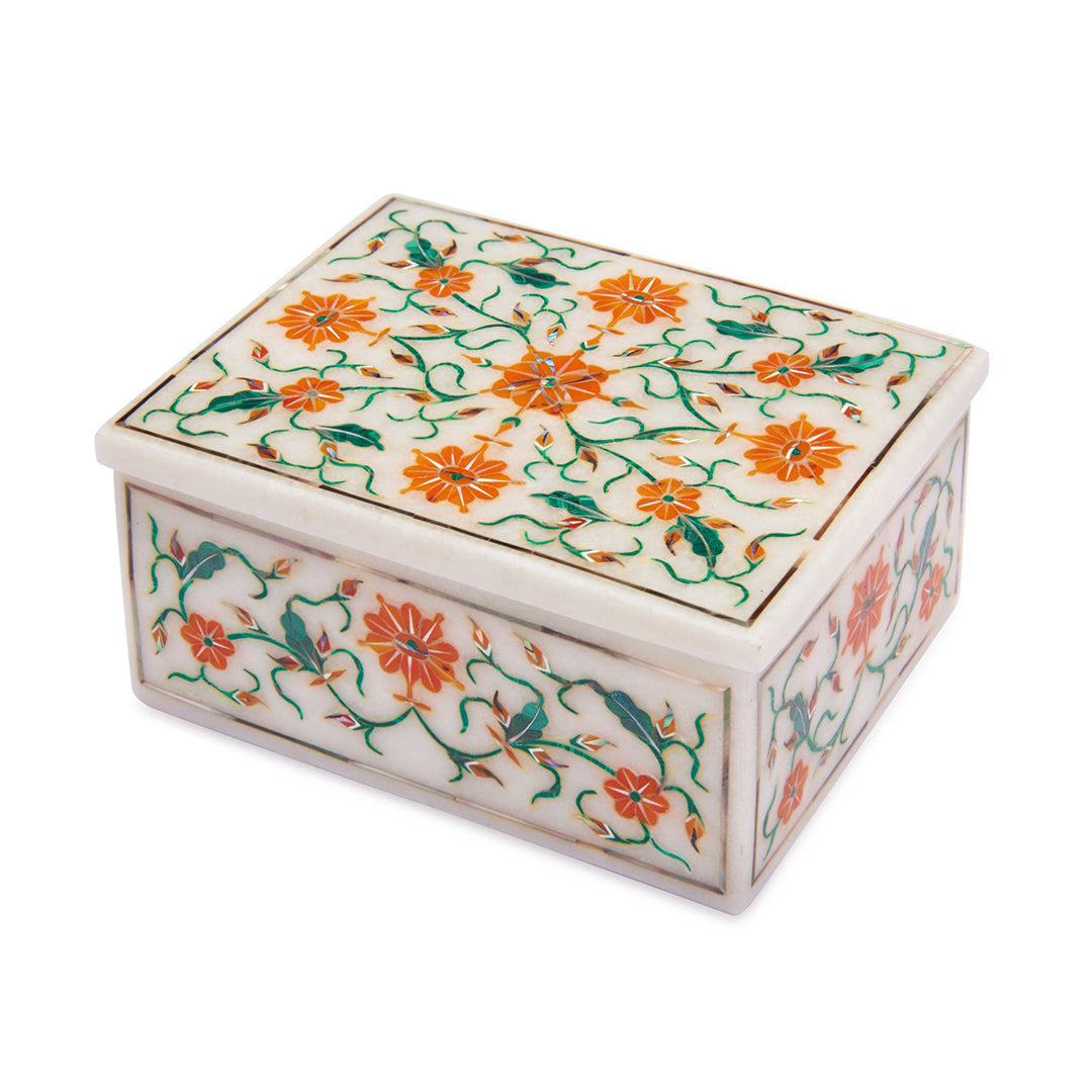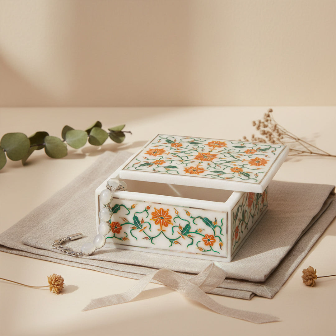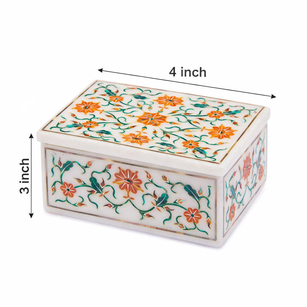 Bring heritage craftsmanship into your space with this Natural White Marble Inlay Jewellery Box, meticulously handcrafted by skilled artisans. The box showcases a vibrant floral motif created using semi-precious stones set into polished marble, making every piece unique. Its compact yet sturdy form offers safe storage for rings, earrings, pendants, or keepsakes while enhancing the aesthetic of your vanity, console, or bedside table. The lift-off lid ensures easy access while maintaining a clean, minimal silhouette. This is not just storage — it is functional art that elevates everyday organization into a luxury experience.