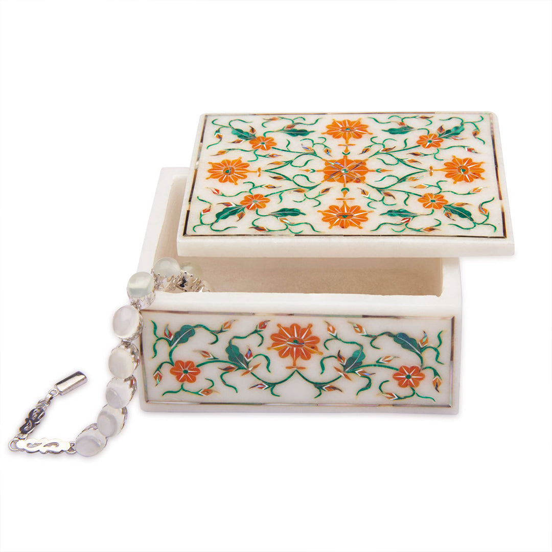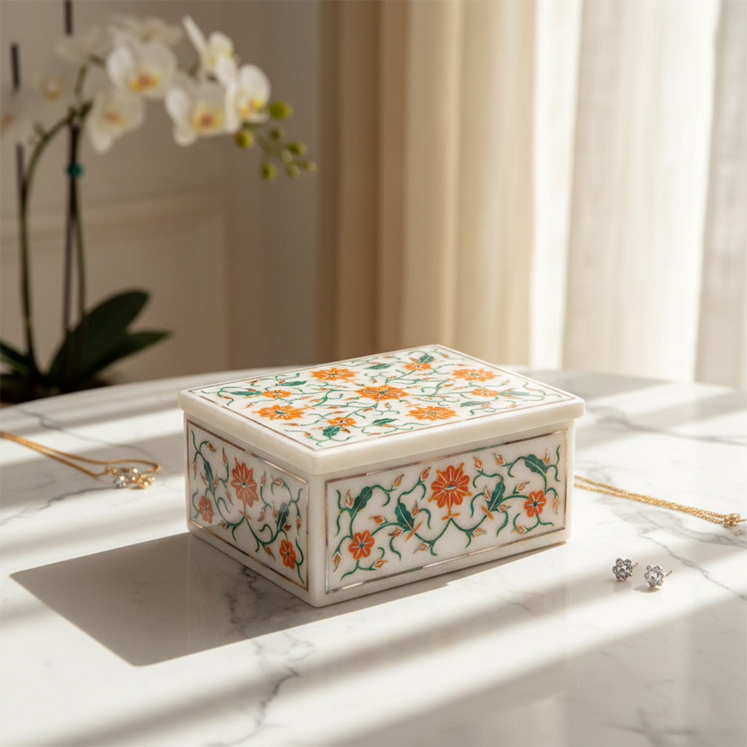 Handcrafted White Marble Inlay Jewellery Box – Floral Semi-Precious Stone Storage Case with Lid