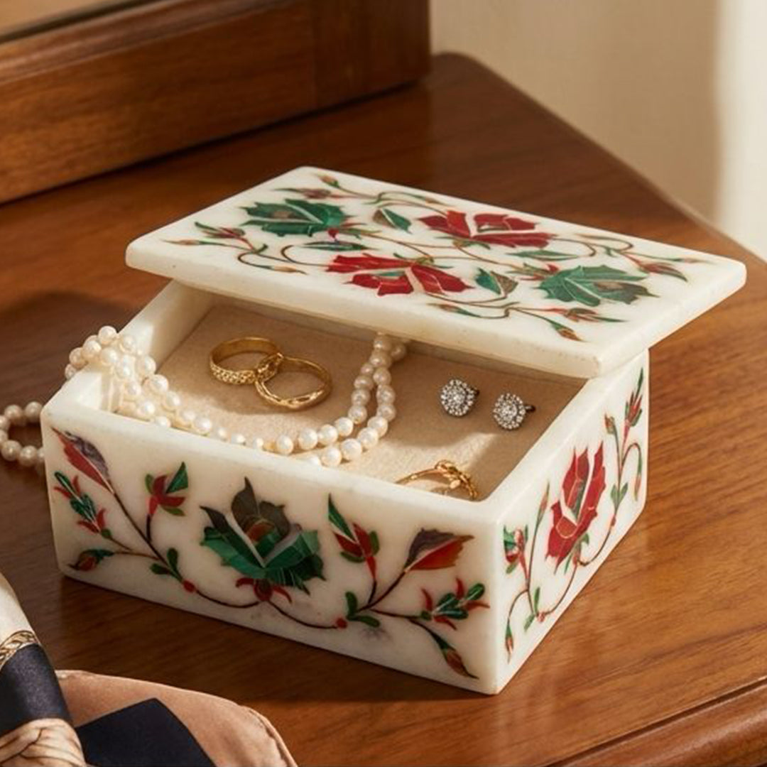 White marble floral inlay jewelry box storing pearls and rings, artisan handmade box