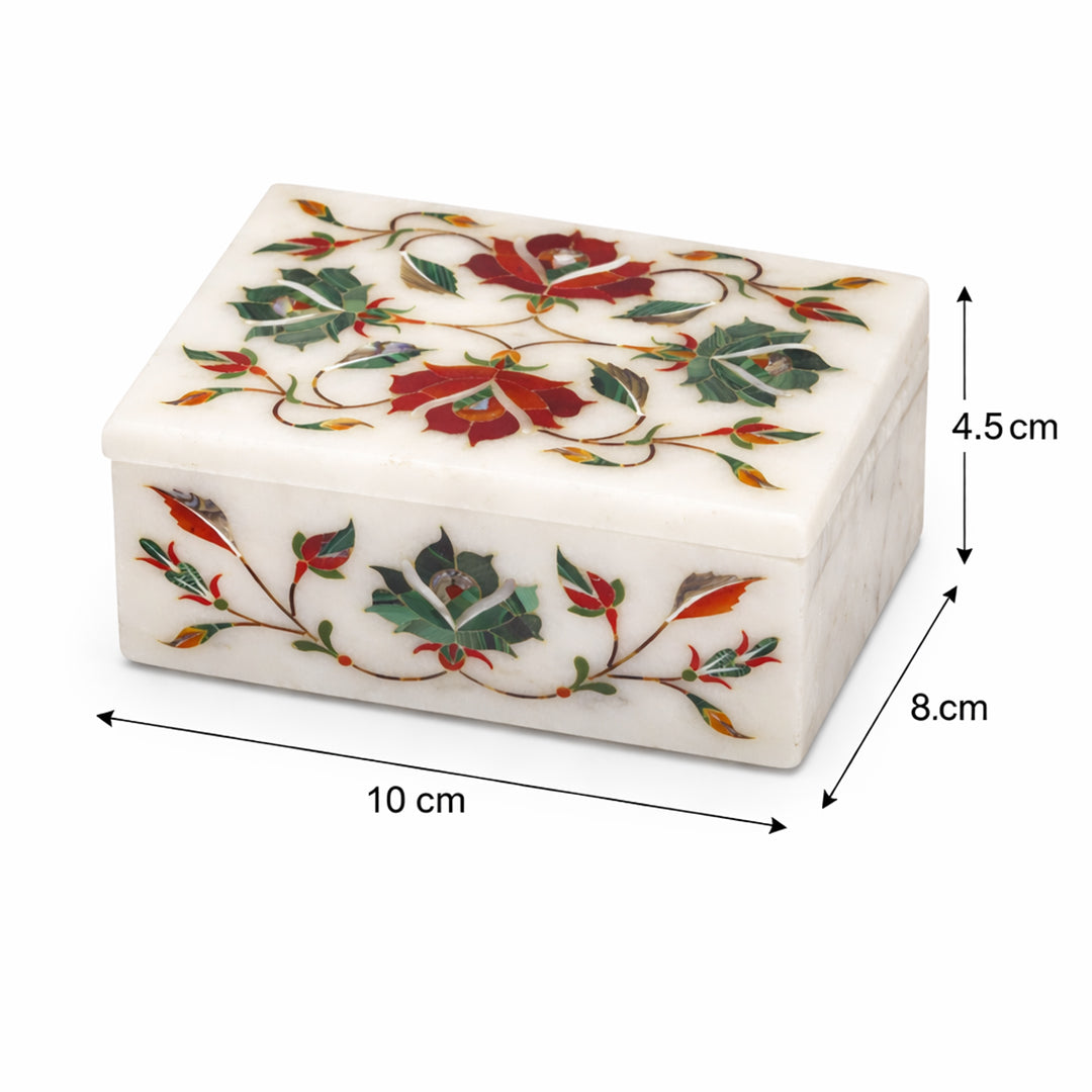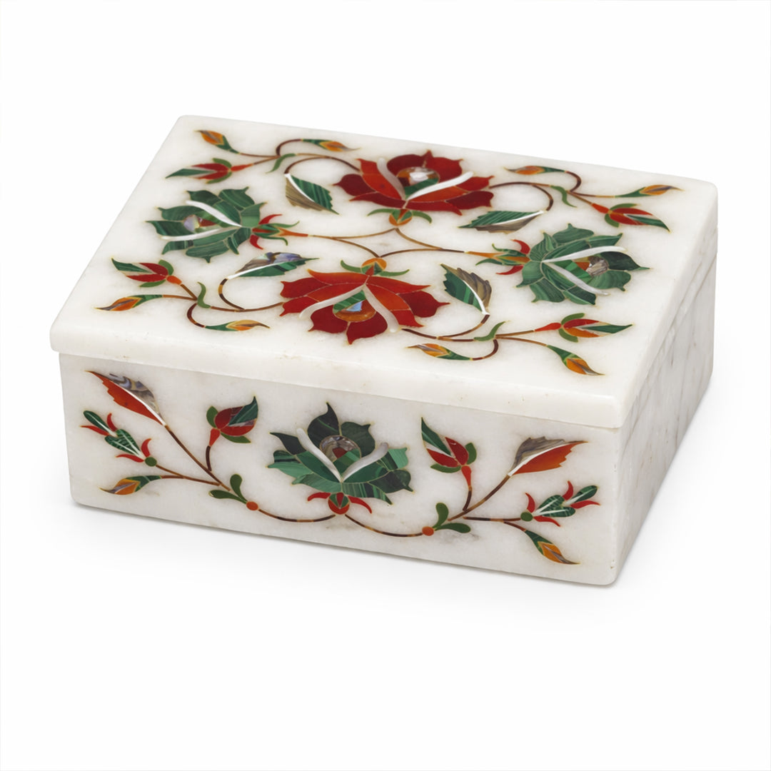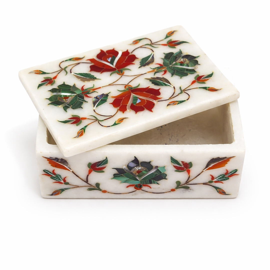 Handcrafted white marble box with colorful floral stone inlay, elegant home decor accent