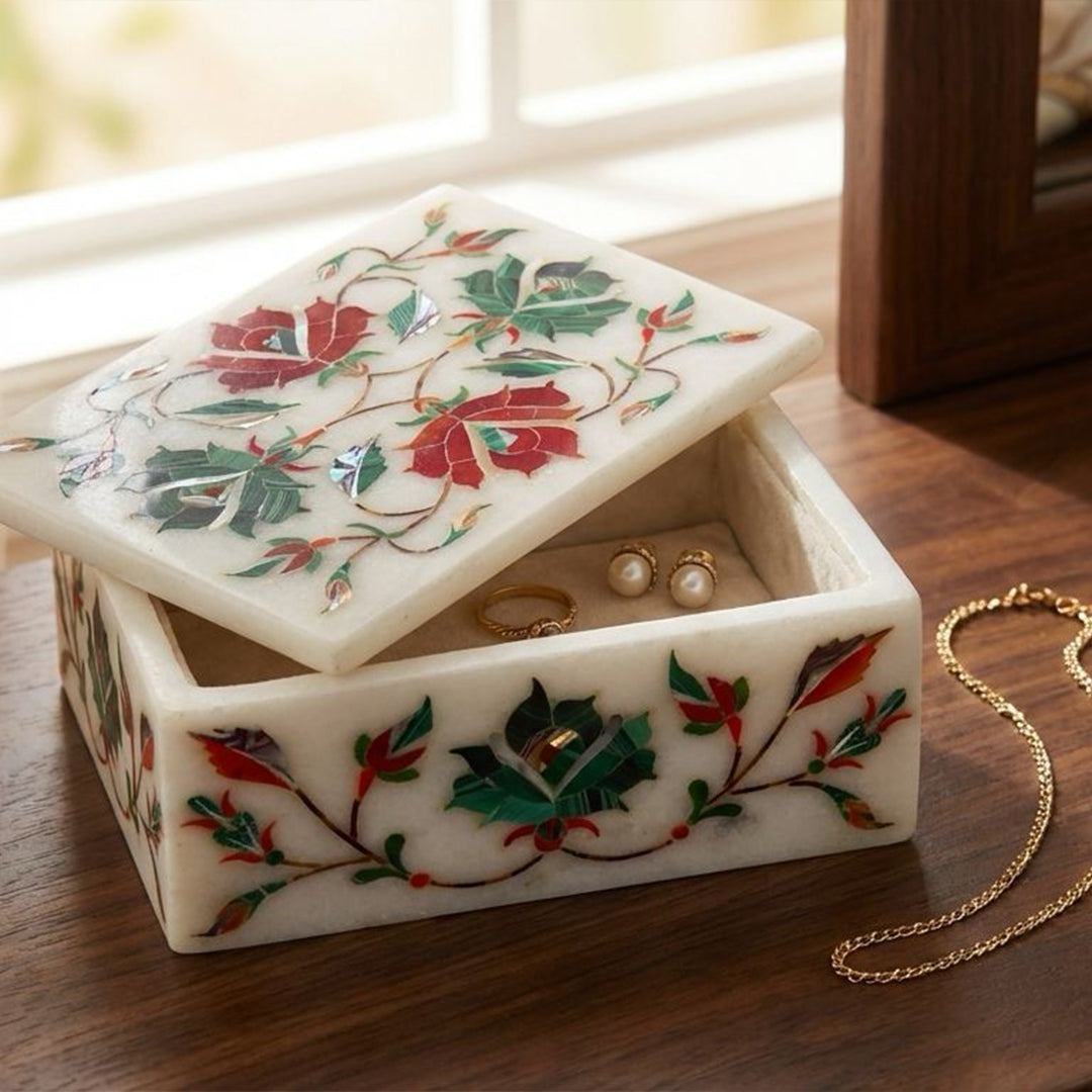 This handcrafted marble inlay jewelry box brings the quiet elegance of Mughal artistry into your home. Made from natural white marble and adorned with flowers hand-inlaid using Carnelian, Malachite, Abalone Shell, and Mother of Pearl, it carries the warmth, detail, and heritage of traditional Taj Mahal–style craftsmanship.