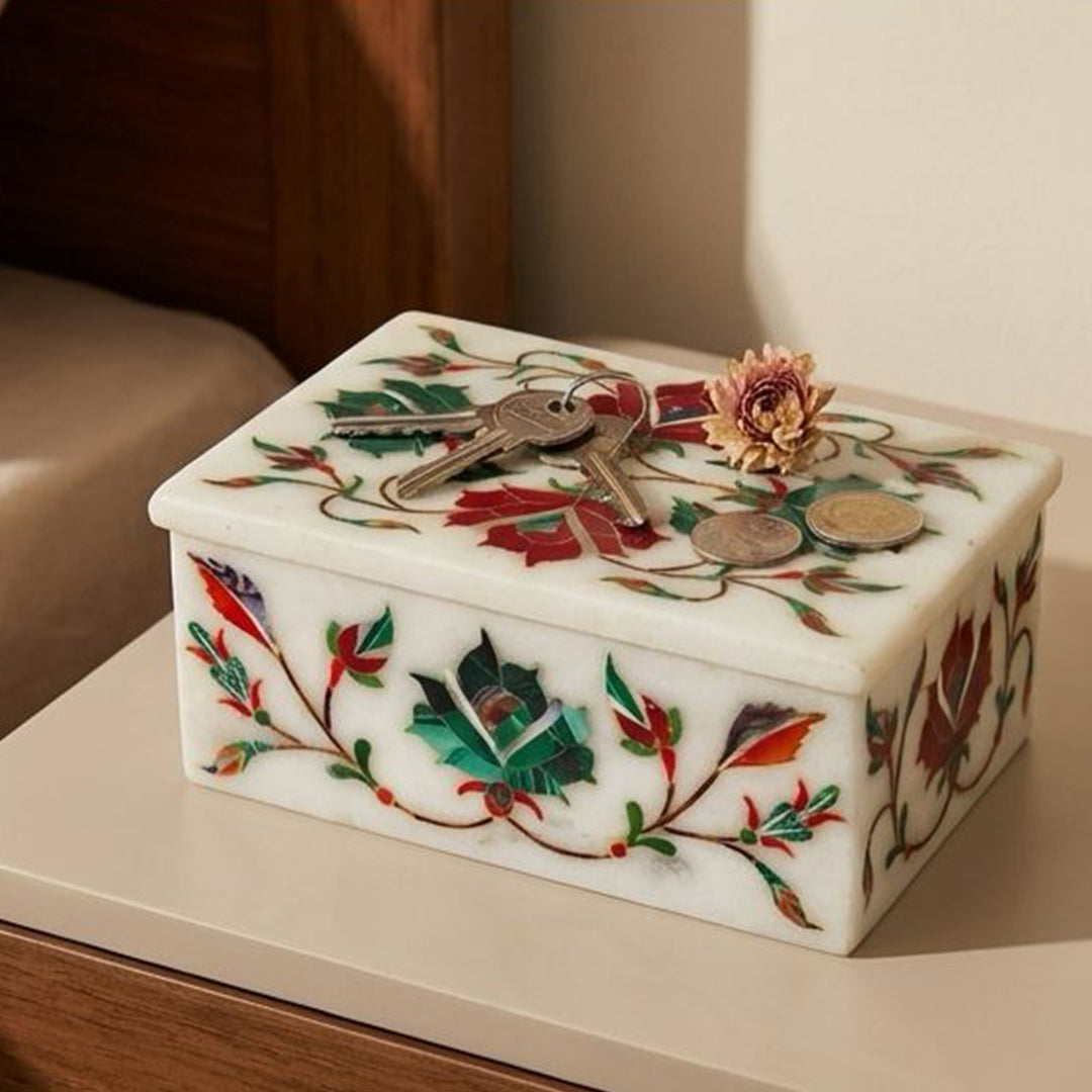 White marble inlay box used as catchall for keys and coins, decorative storage box