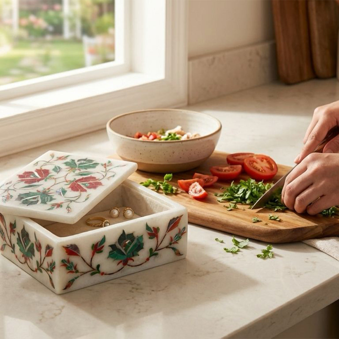 Decorative marble inlay box on kitchen counter, versatile handcrafted storage box