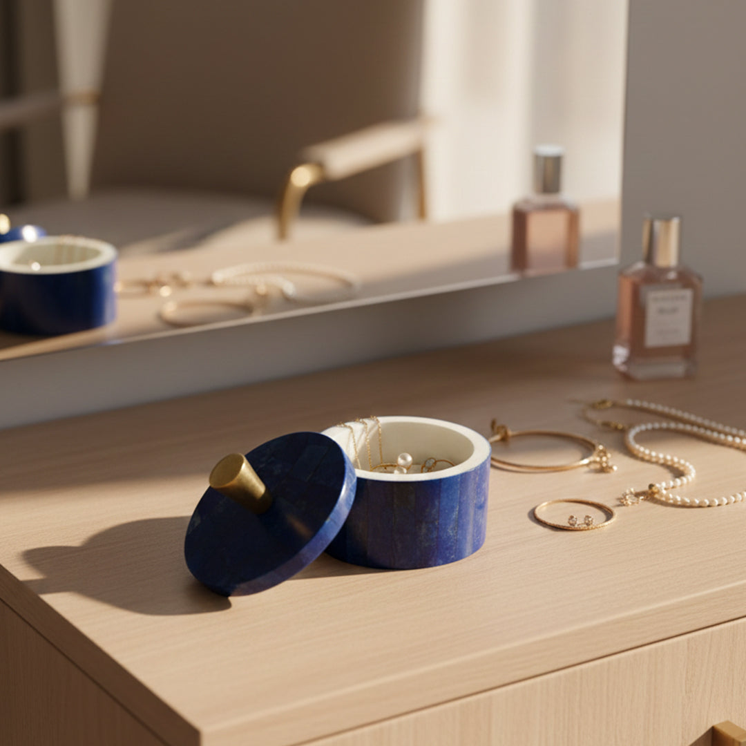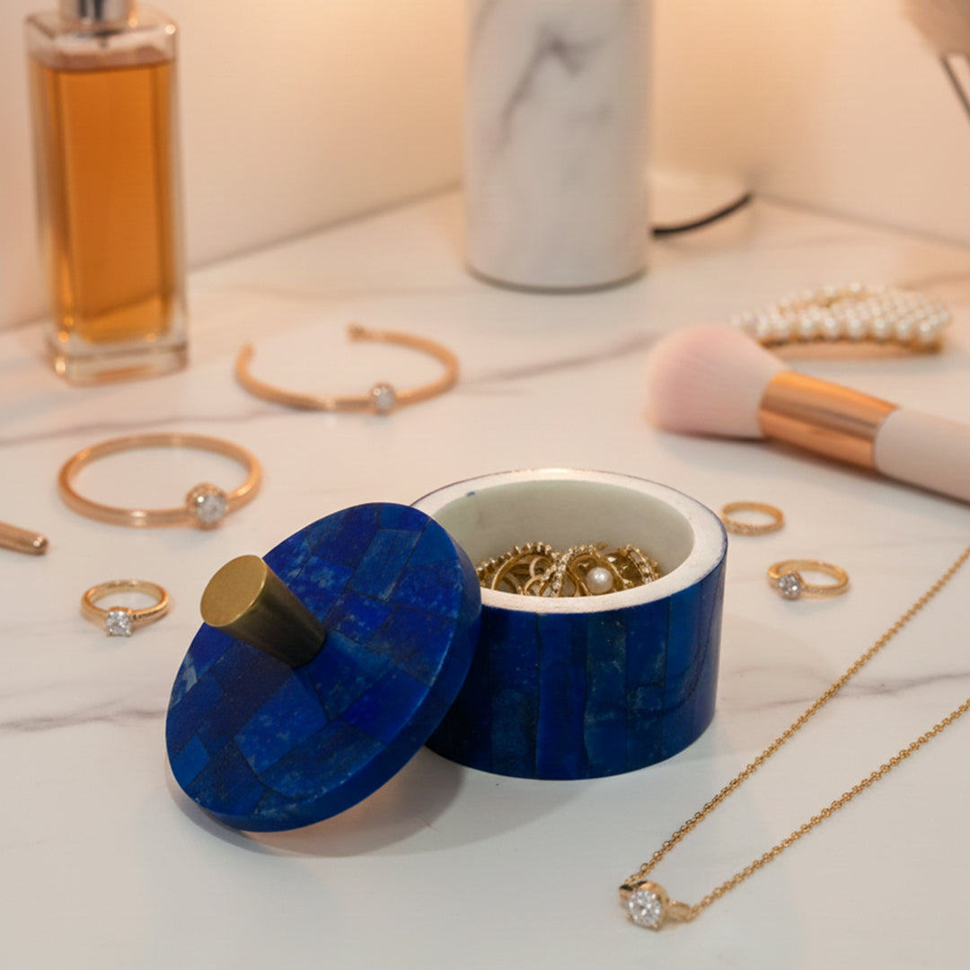 The Sangemarmar Lapis Lazuli Jewelry Box is crafted in marble and wrapped in a semi-precious lapis overlay, giving it a rich blue finish with natural depth and character. Topped with a brass knob, it opens smoothly and closes with a satisfying fit—designed to feel solid, not delicate.