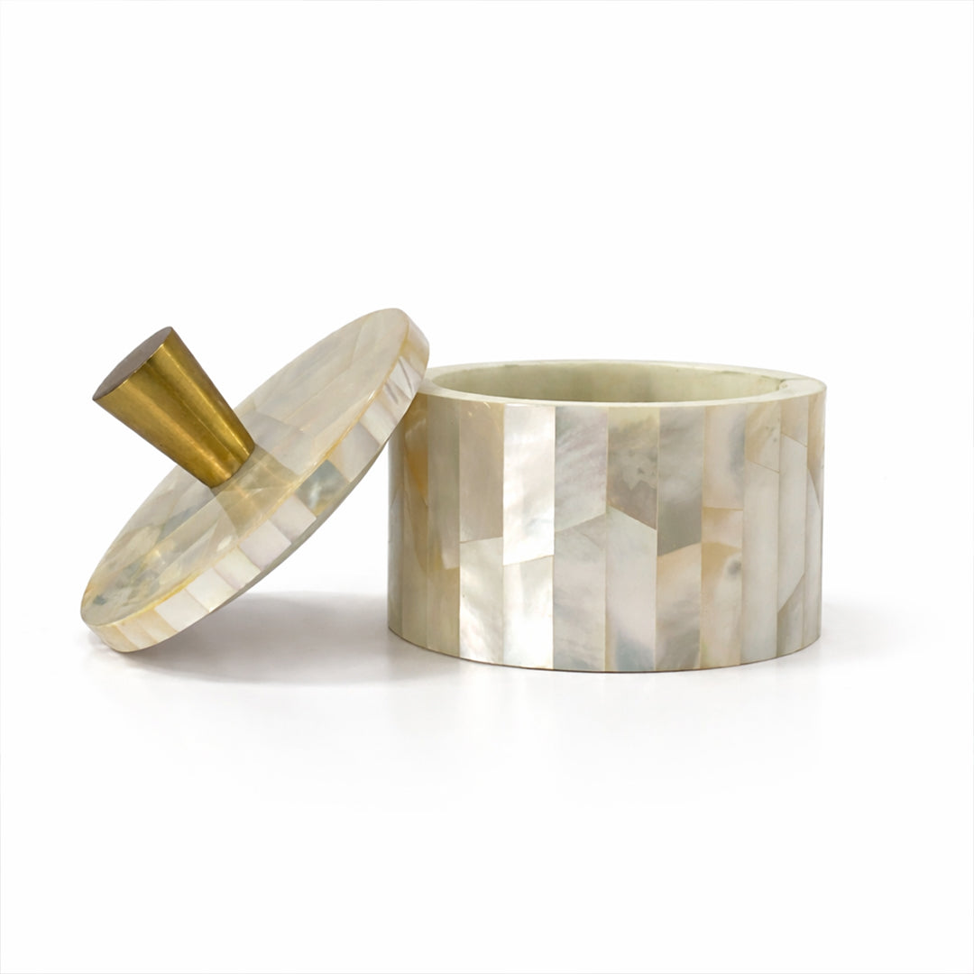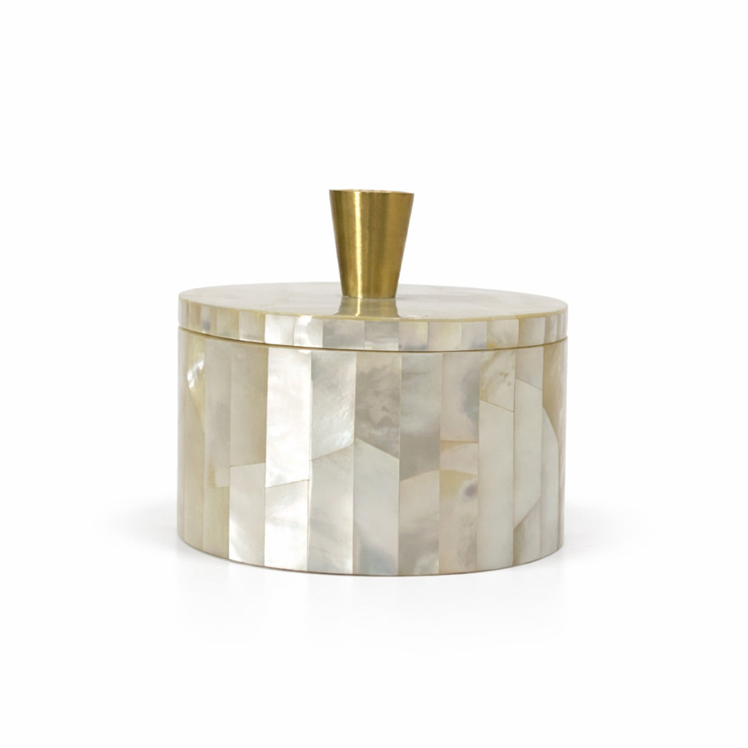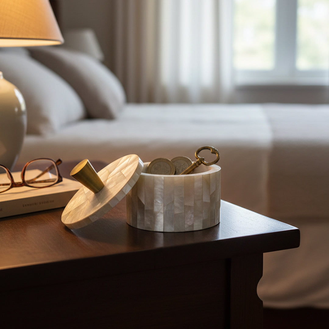 This handcrafted jewelry box is made from natural white marble and meticulously overlaid with Mother of Pearl, finished with a solid brass knob that adds warmth and contrast to the stone surface.