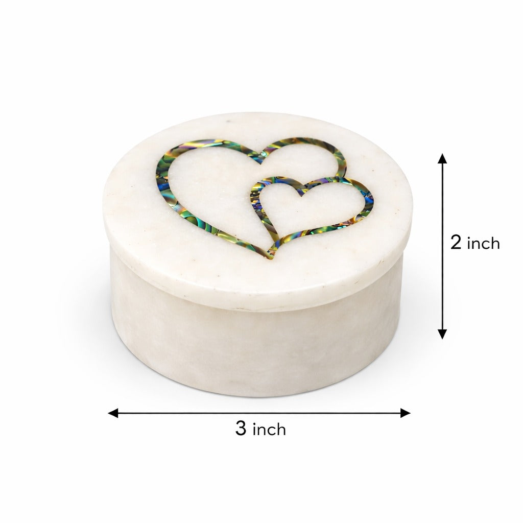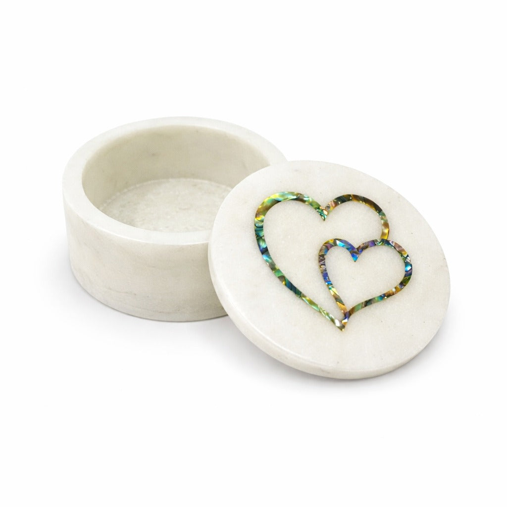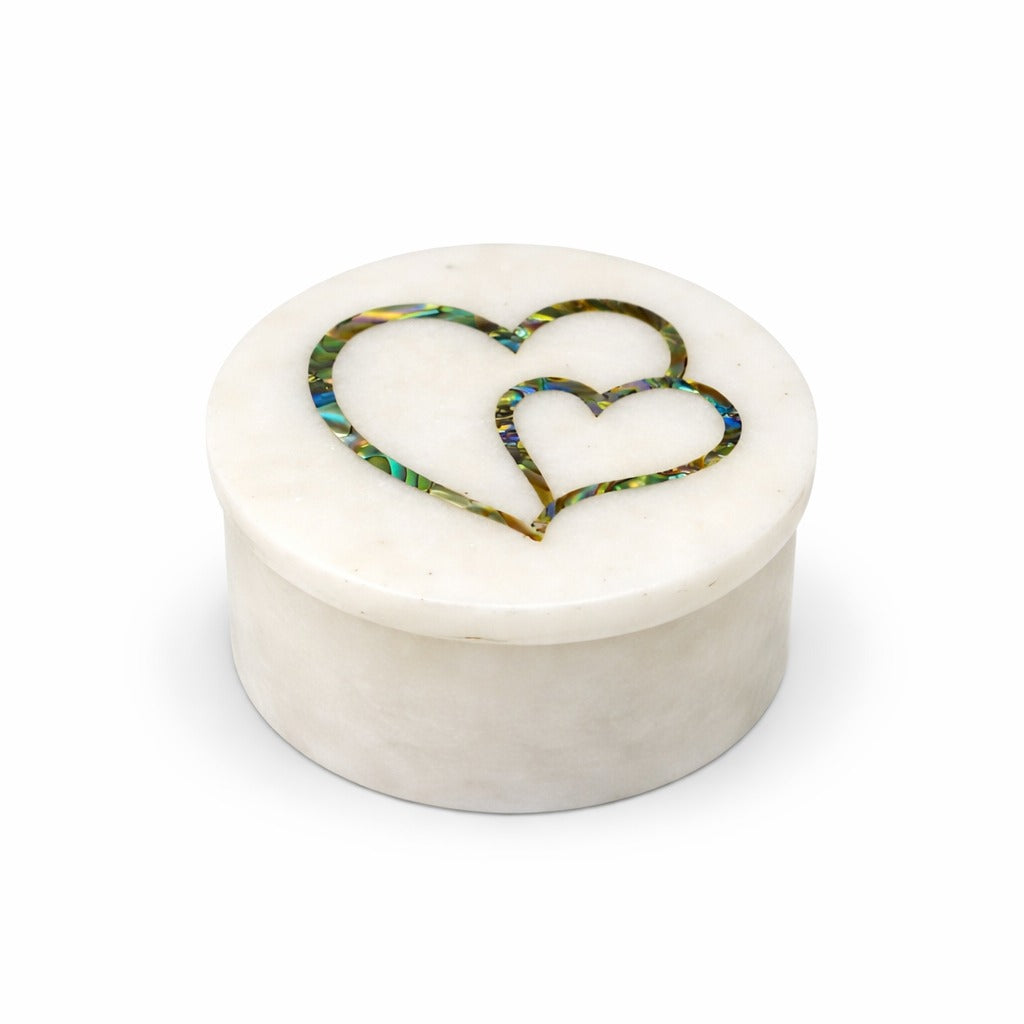 Celebrate love with this handmade white marble ring holder, thoughtfully designed for Valentine’s Day and meaningful gifting. Crafted from solid natural white marble, each piece carries subtle natural veining, making every ring box one of a kind. The lid is adorned with a hand-inlaid abalone shell heart design, known for its natural iridescence and depth of color. The smooth, hand-polished surface adds a refined, luxurious feel while protecting delicate jewelry. Compact yet substantial, this ring holder is ideal for engagement rings, wedding bands, promise rings, or small keepsakes. Whether styled on a bedside table, vanity, or dresser, it blends beautifully into modern, minimal, and luxury interiors. This is not mass-produced décor—this is a keepsake made to last.