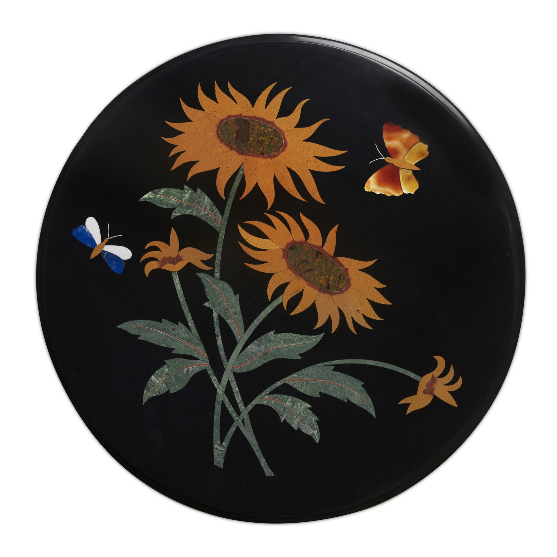Handcrafted Black Marble Sunflower Inlay Table | Semi-Precious Stone Pietra Dura | 24” Round