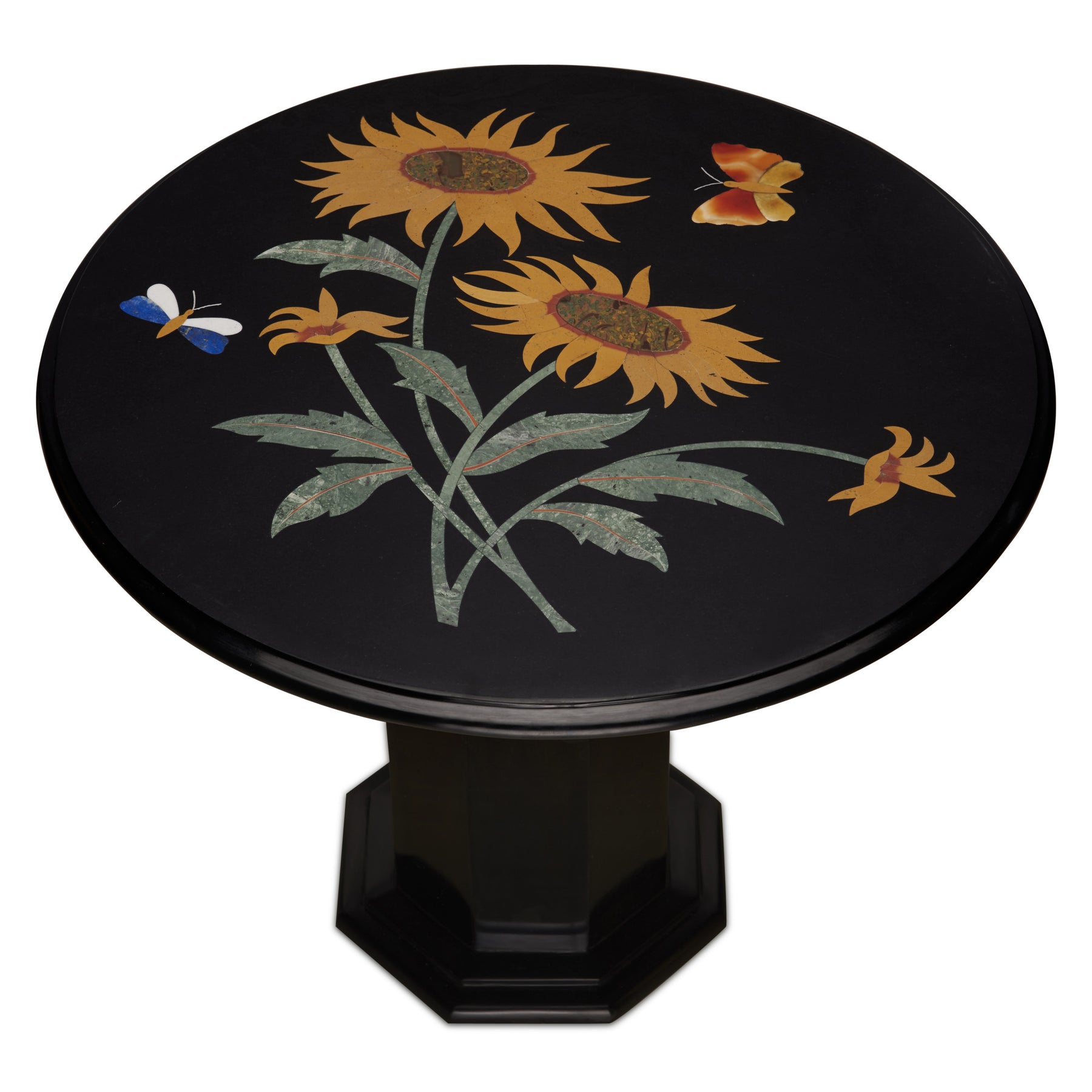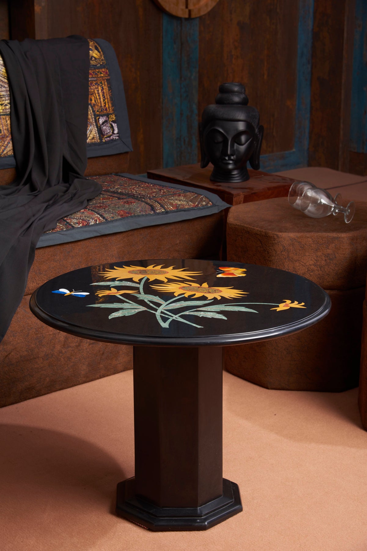 This handcrafted black marble table is defined by its radiant sunflower-inspired inlay, meticulously composed using hand-cut semi-precious stones and traditional pietra dura craftsmanship. Each petal is individually shaped and set to form a striking circular bloom that feels both architectural and organic.
