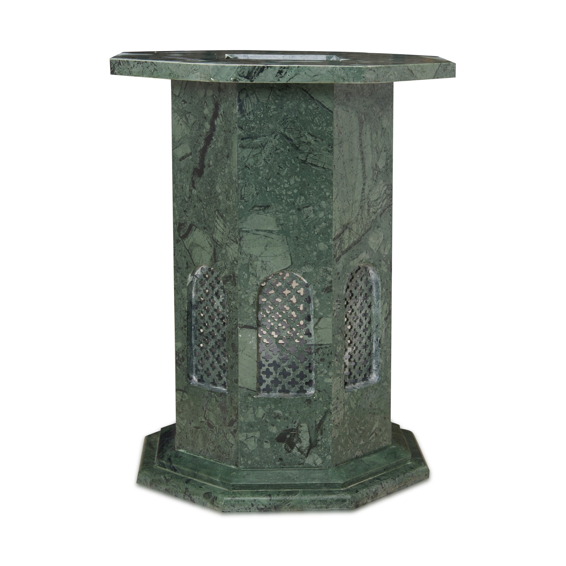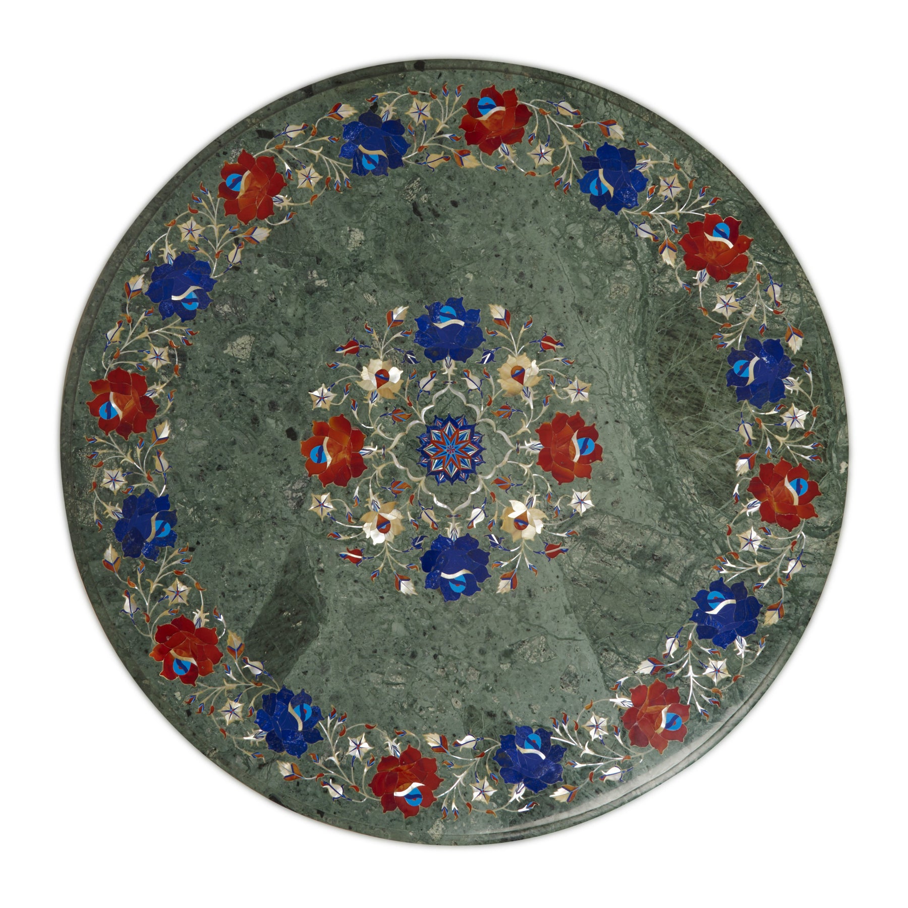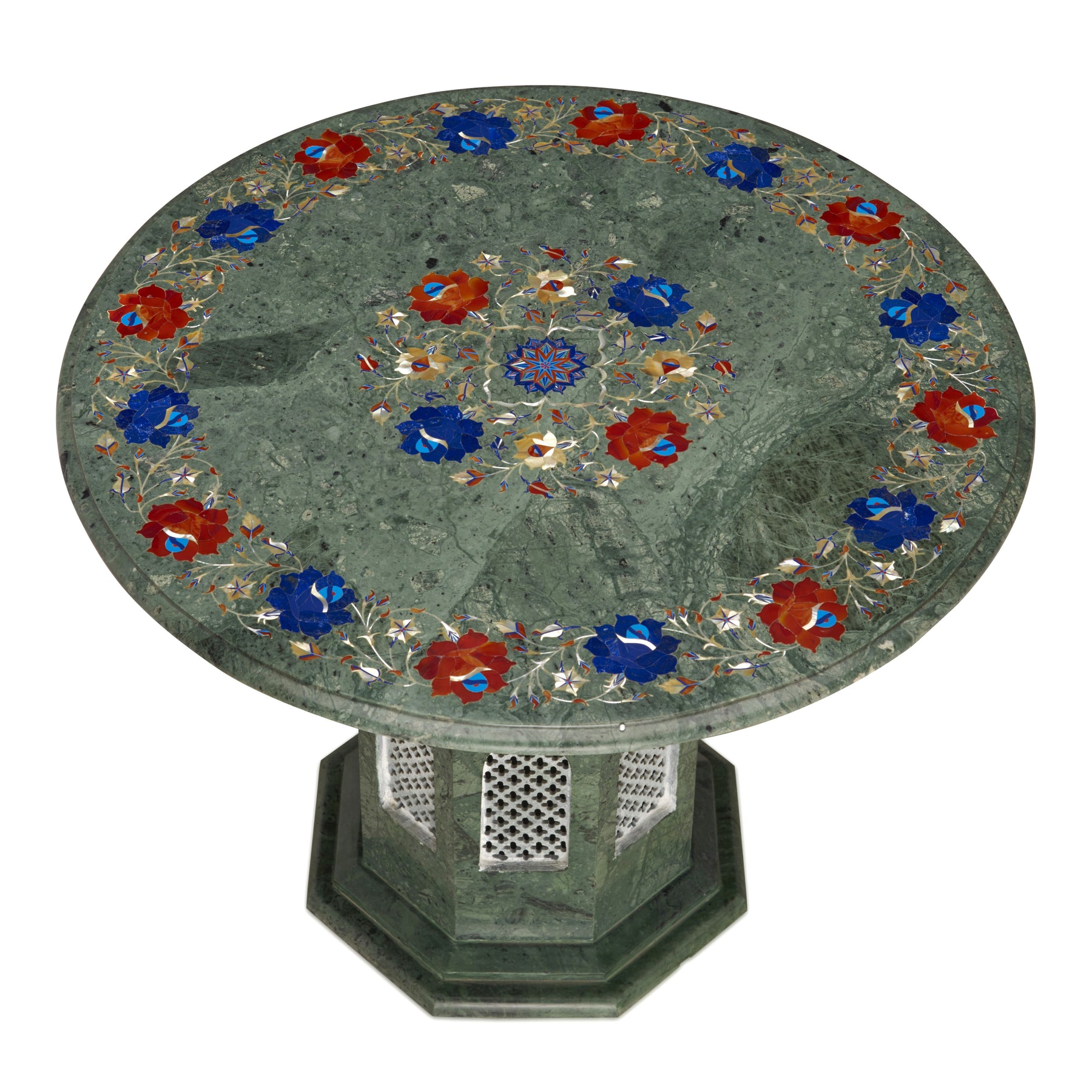 This round green marble inlay table is handcrafted using the historic pietra dura technique—an art form once reserved for palaces and royal architecture. Set against richly toned green marble, hand-cut lapis lazuli and carnelian form a balanced floral composition that feels architectural, intentional, and enduring.Green marble is prized in luxury interiors for its grounding presence and natural movement. Lapis introduces depth and visual calm, while carnelian adds warmth and contrast—creating a palette that works effortlessly across classic, transitional, and modern luxury spaces. Available as a tabletop alone or paired with a matching pedestal stand, this piece functions equally well as an accent table, side table, or sculptural focal element.