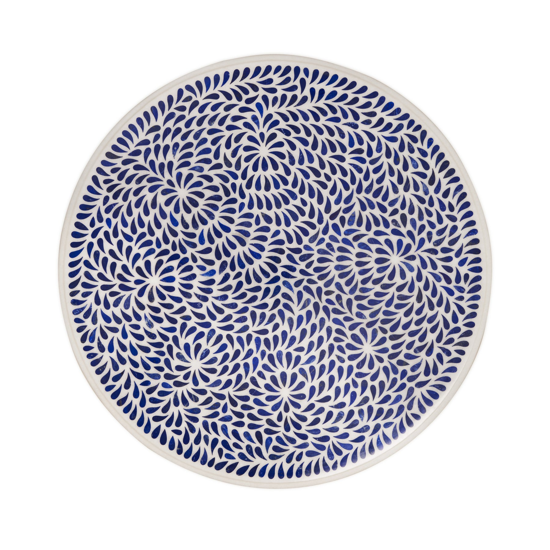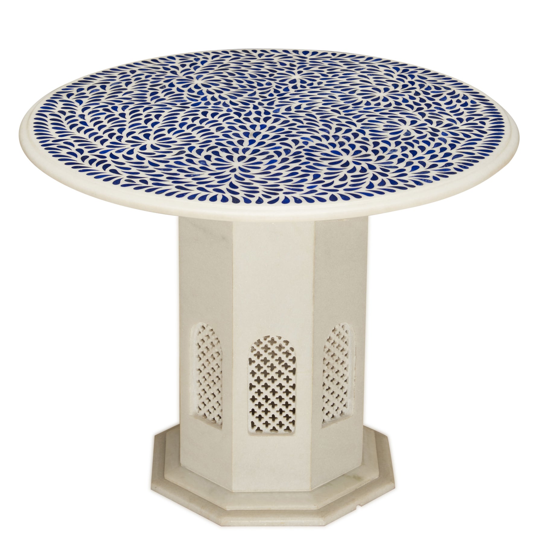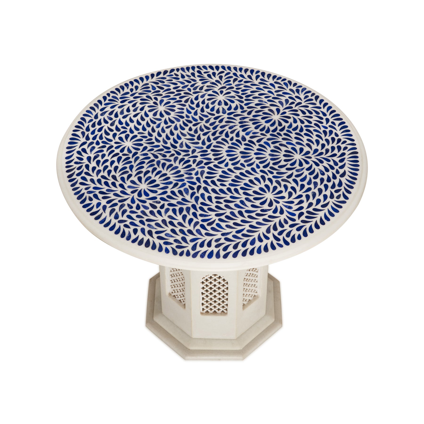 The round tabletop features an intricate tear-drop floral pattern, offering rich contrast between crisp white marble and deep blue lapis. Each table is made by skilled artisans, making every piece slightly unique in character and detail.
