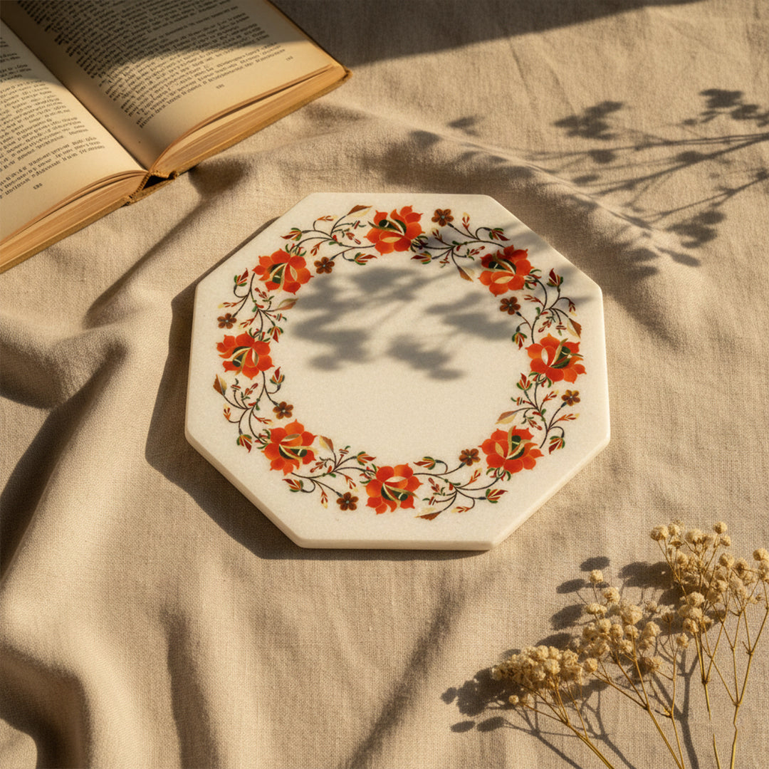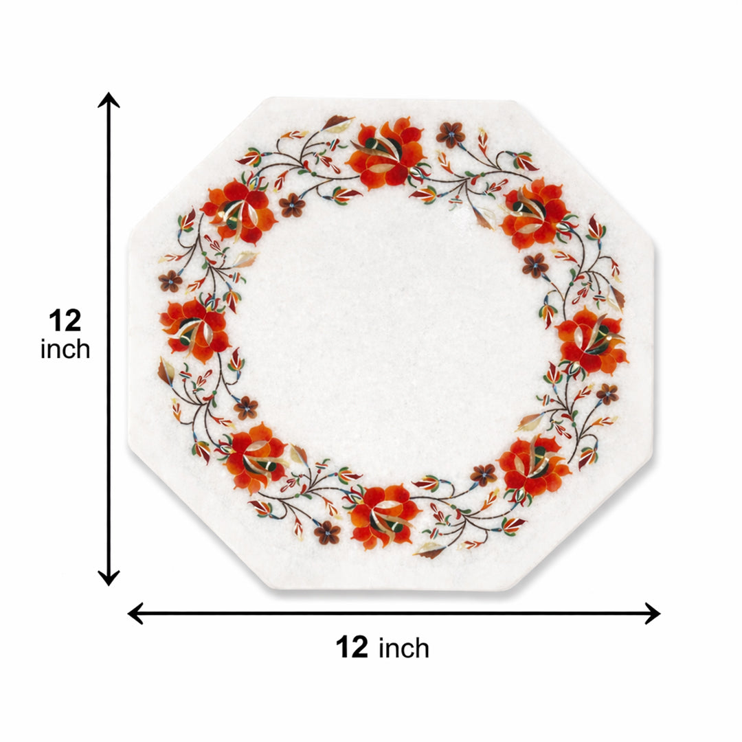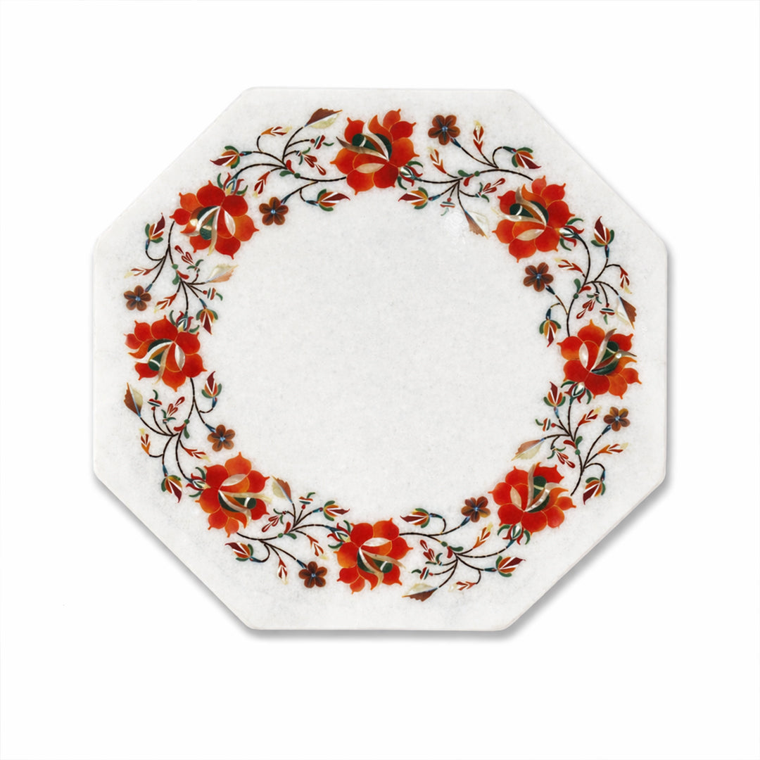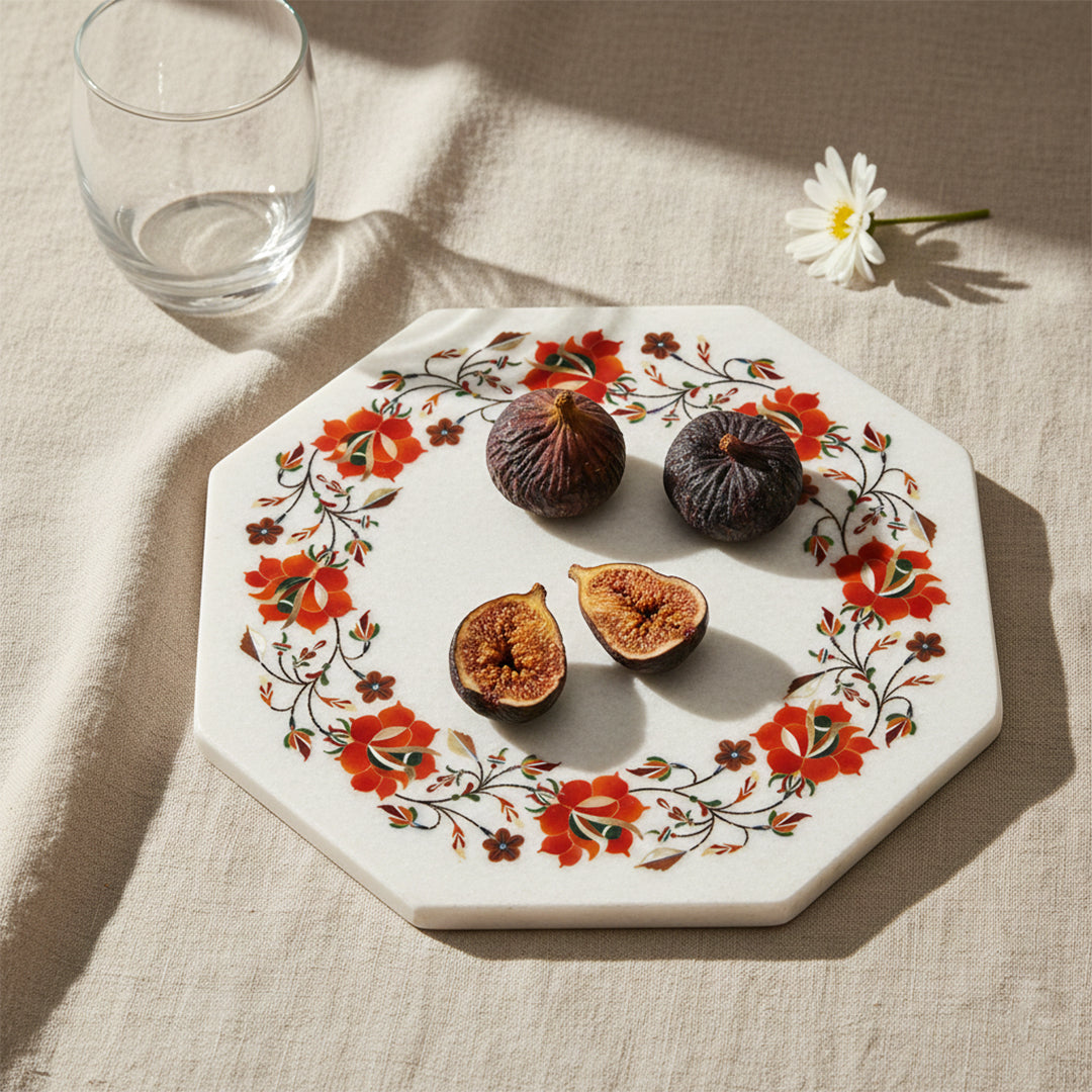 Handcrafted White Marble Octagon Platter with Carnelian & Coral Inlay