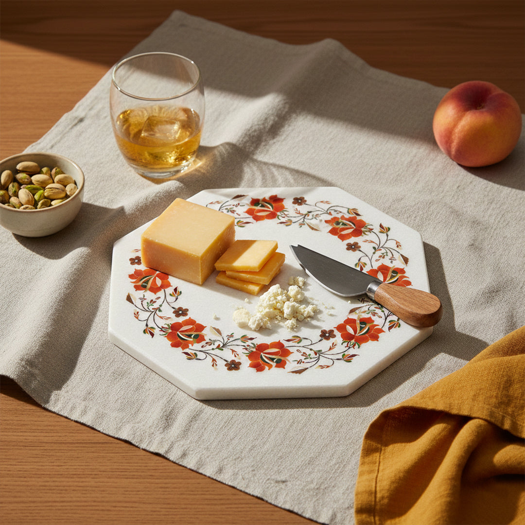This handcrafted white marble octagon platter is a refined blend of traditional Indian craftsmanship and modern luxury. Expertly made in Agra, India, it features intricate hand-cut Carnelian and Coral stone inlay, arranged in a delicate floral pattern that adds warmth and character to natural marble.
