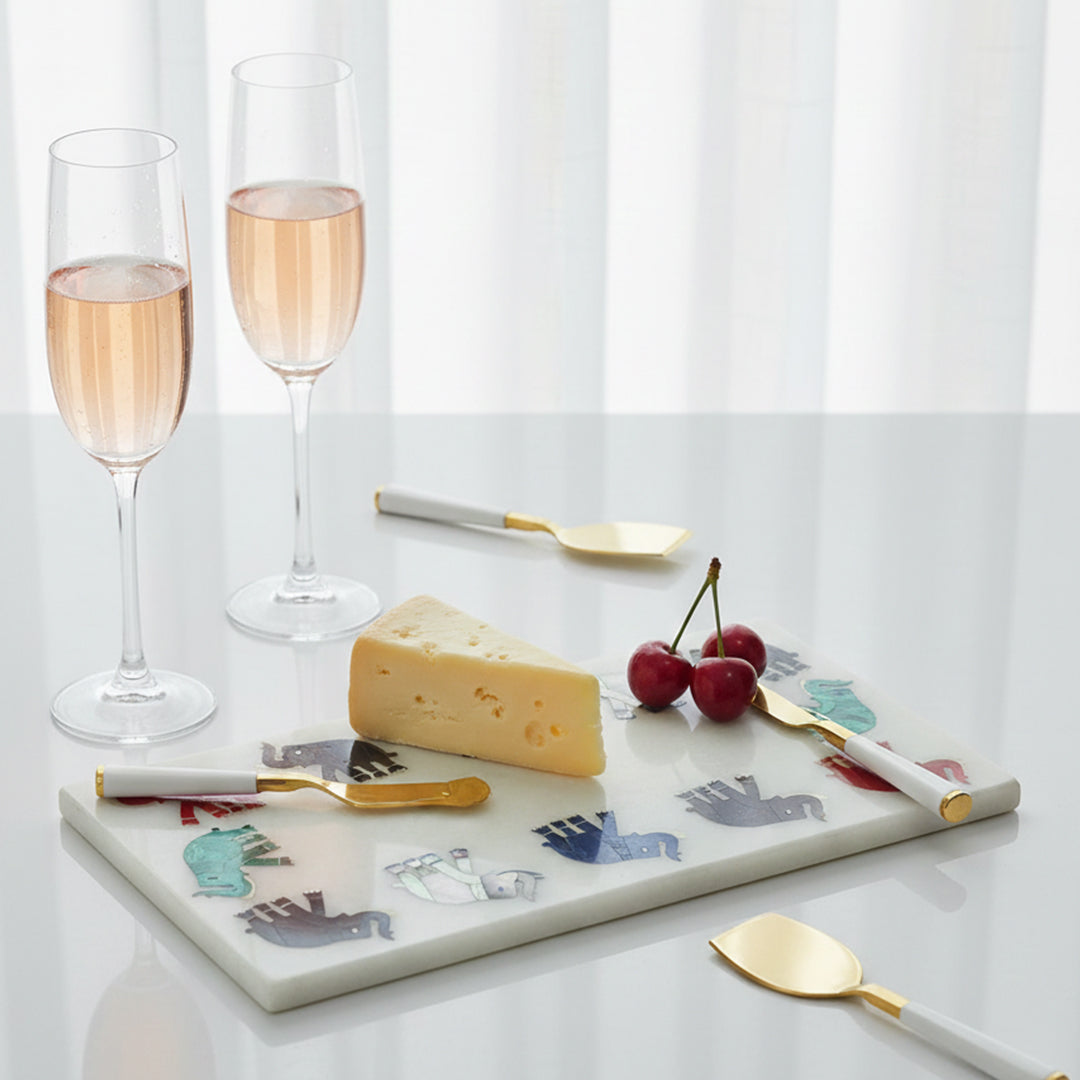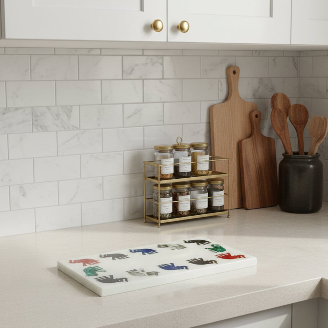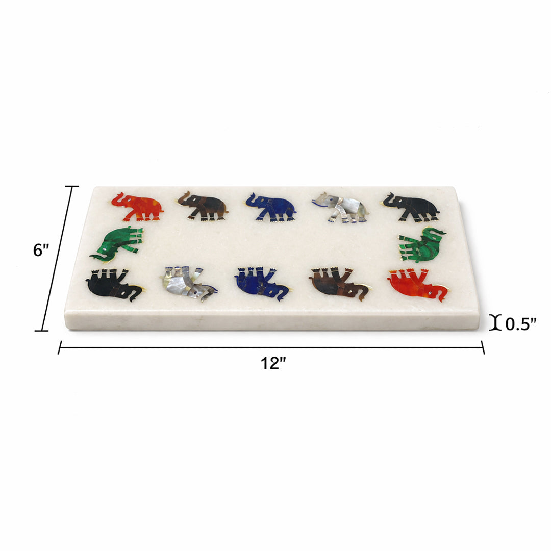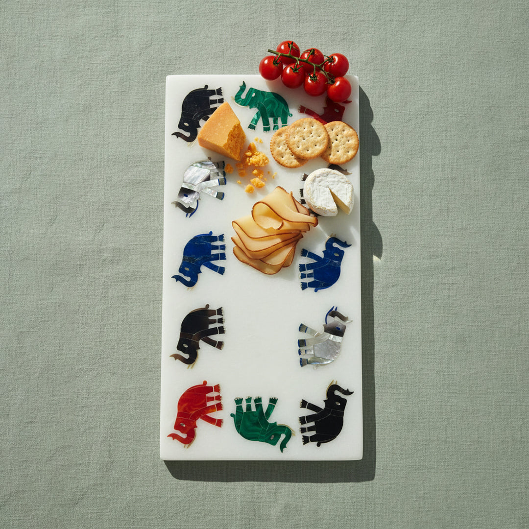 Bring timeless artistry to your table with this handcrafted white marble cheese board, beautifully adorned with an engraved elephant gemstone inlay pattern. Each elephant motif is meticulously created using natural semi-precious stones, transforming a functional serving piece into a work of art.