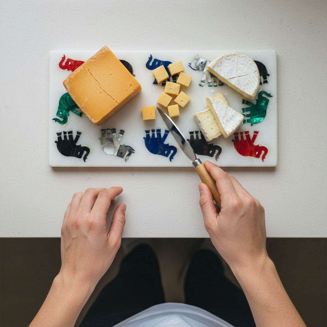 Marble Cheese Board with Elephant Inlay – Handcrafted Gemstone Serving Platter for Home Decor & Gifts