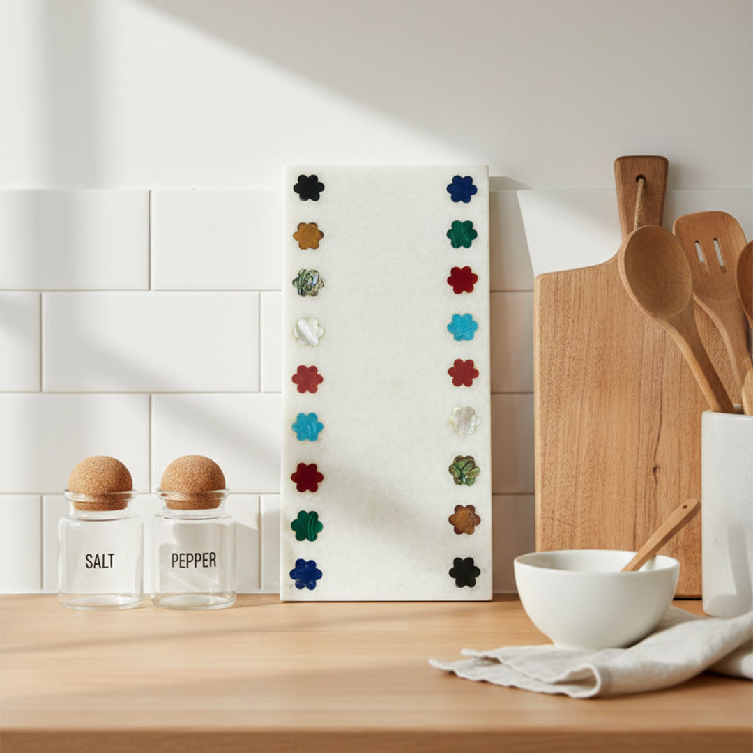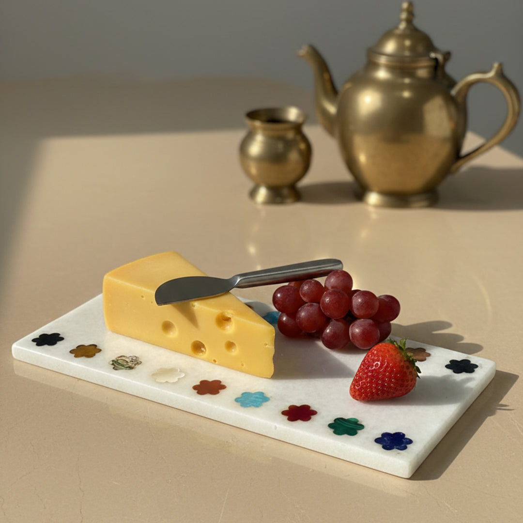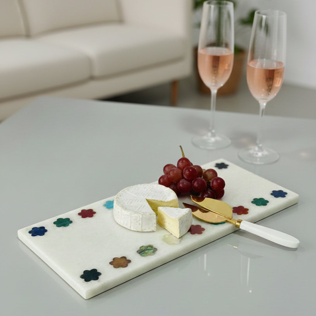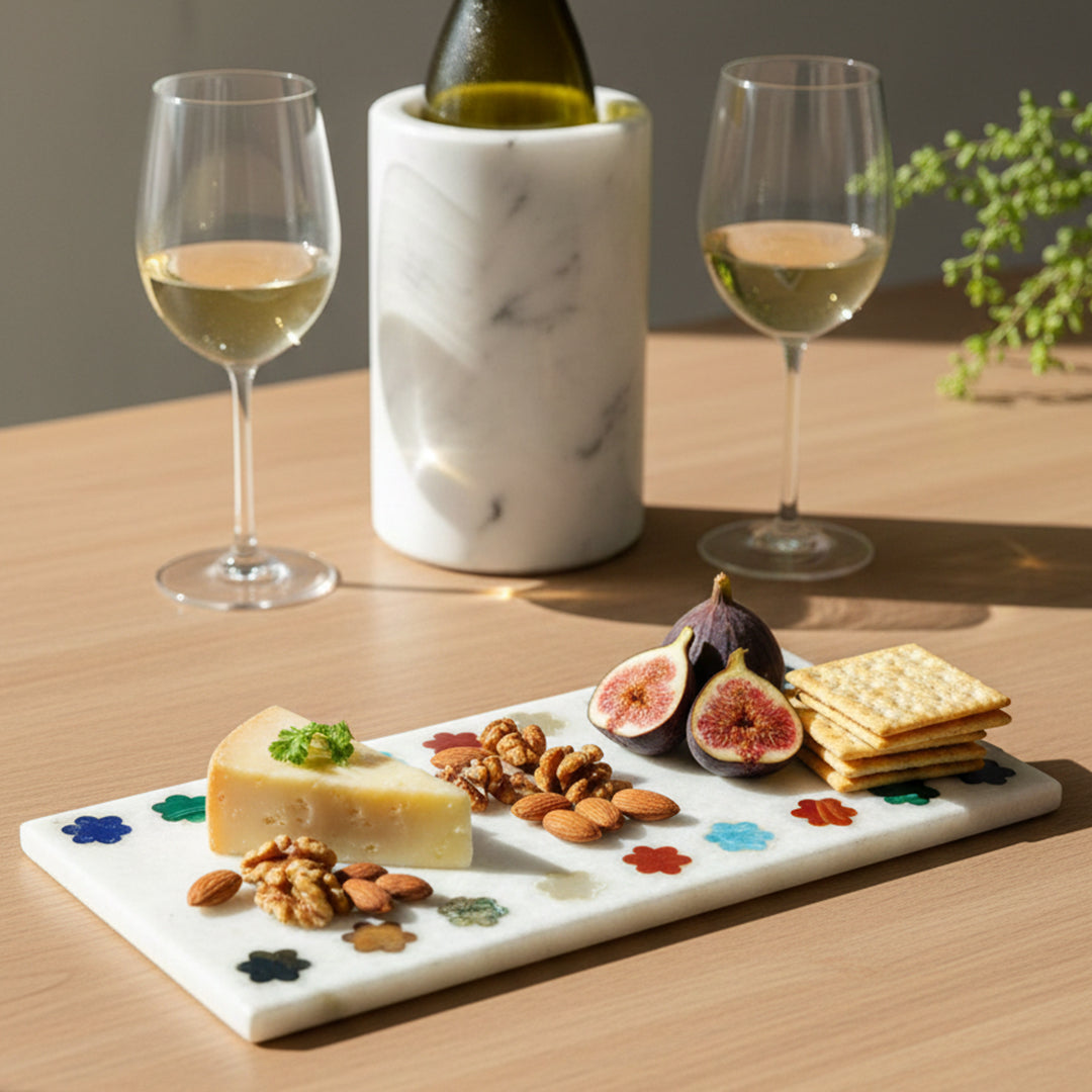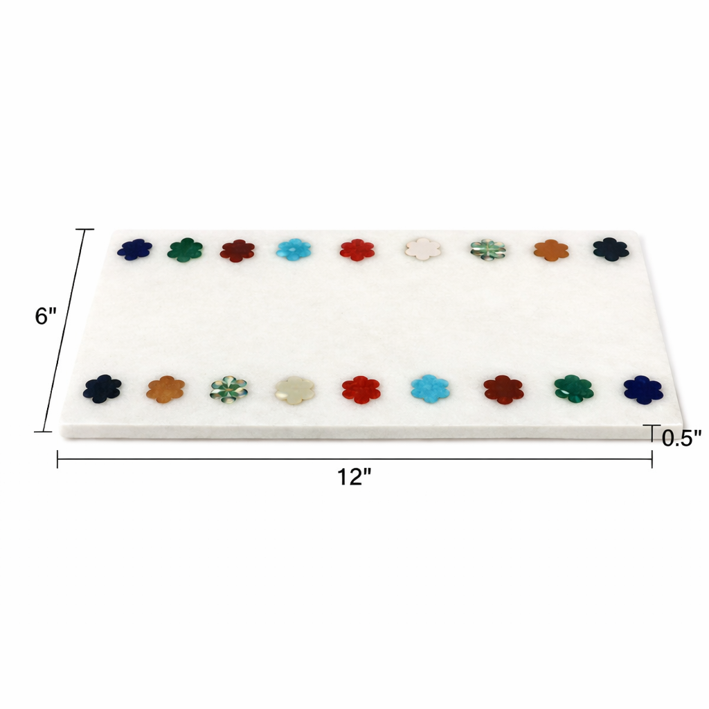 polished white marble tray finished with a semi-precious flower inlay design—created to organize beautifully, serve effortlessly, and make any surface look intentionally styled.