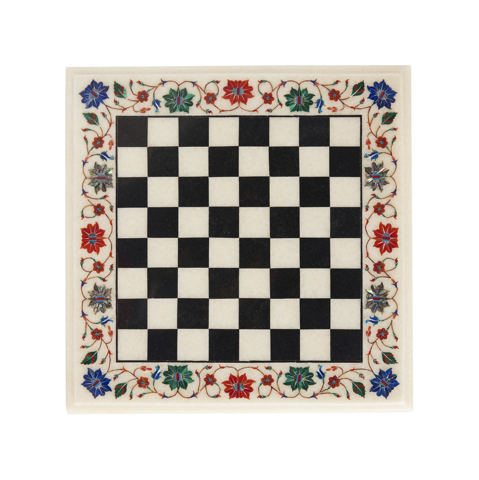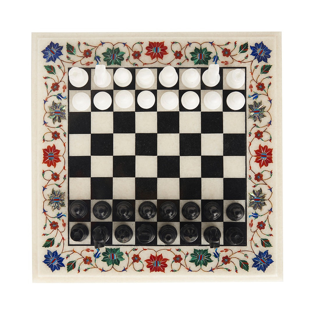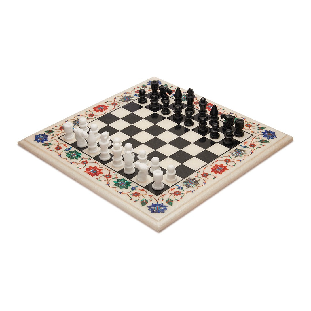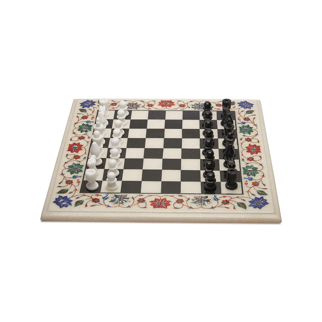 This Luxury Handcrafted Marble Chess Set brings together intellectual play and decorative artistry in its most refined form. Carefully handcrafted in Agra, India, this piece reflects the legacy of Mughal marble inlay craftsmanship admired around the world. The 15-inch white marble board is adorned with rich multicolor floral inlay, created using carefully hand-cut semi-precious stones. Each motif is placed with precision, forming a vibrant border that transforms the chess board into a work of art. Paired with ornamental metal chess pieces in elegant gold and dark tones, the set offers a striking contrast against the classic black-and-white marble checks. The weight and finish of the board provide a grounded, luxurious playing experience while also making it an exceptional décor centerpiece. Perfect for collectors, chess enthusiasts, and luxury interiors, this chess set is designed to be admired, played, and passed on.