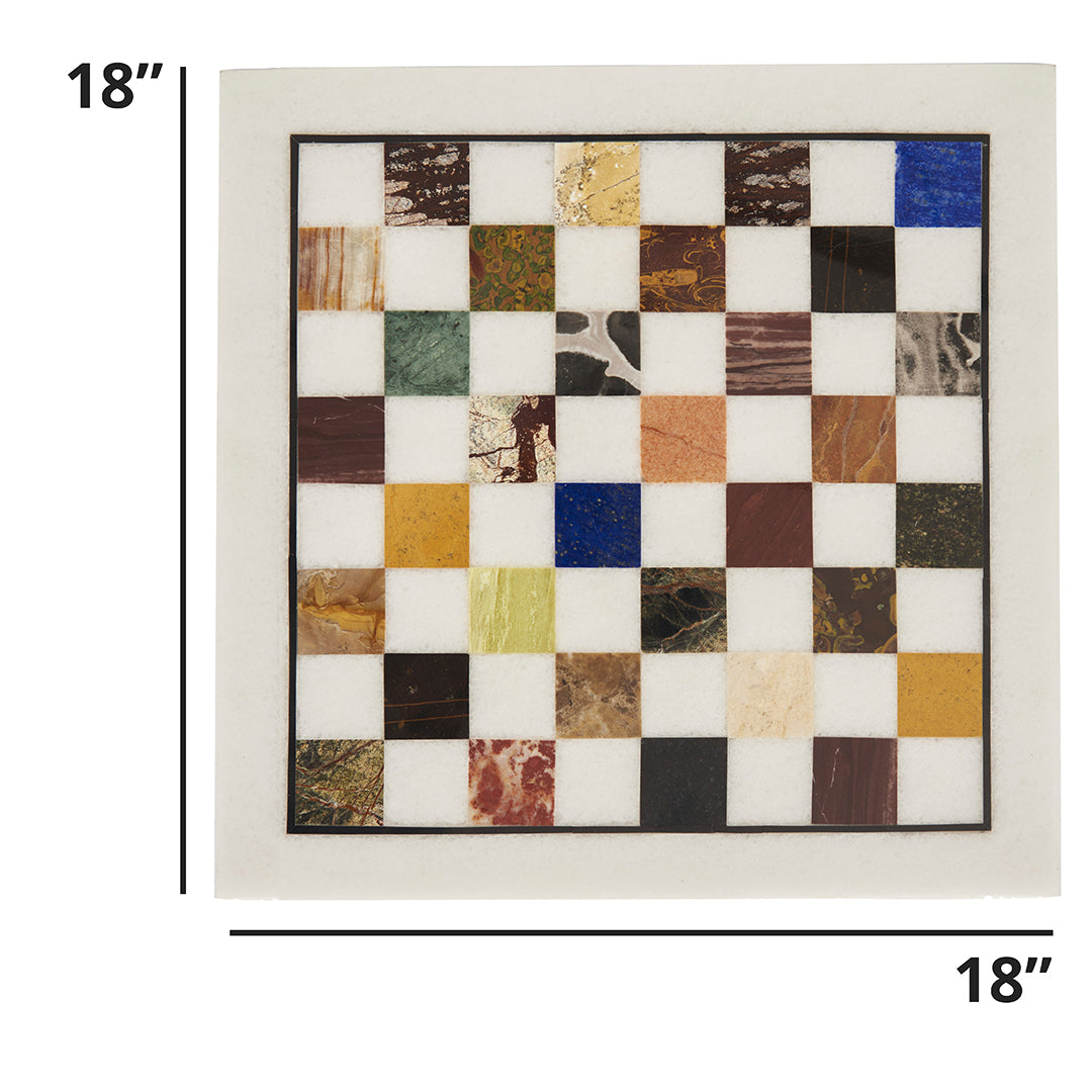 This luxury marble chess board is handcrafted from solid white marble, featuring meticulously placed multi semi-precious stone inlay checks. Designed as a refined tabletop statement, it blends traditional craftsmanship with contemporary luxury. Each board is carefully cut, inlaid, and hand-polished by skilled artisans, ensuring precise detailing, rich contrast, and a smooth, premium finish. The natural marble base gives the board weight, durability, and a sense of permanence — making it equally suited for play, display, or interior styling. This listing includes the chess board only. Chess pieces are not included, allowing you to pair the board with pieces of your choice.