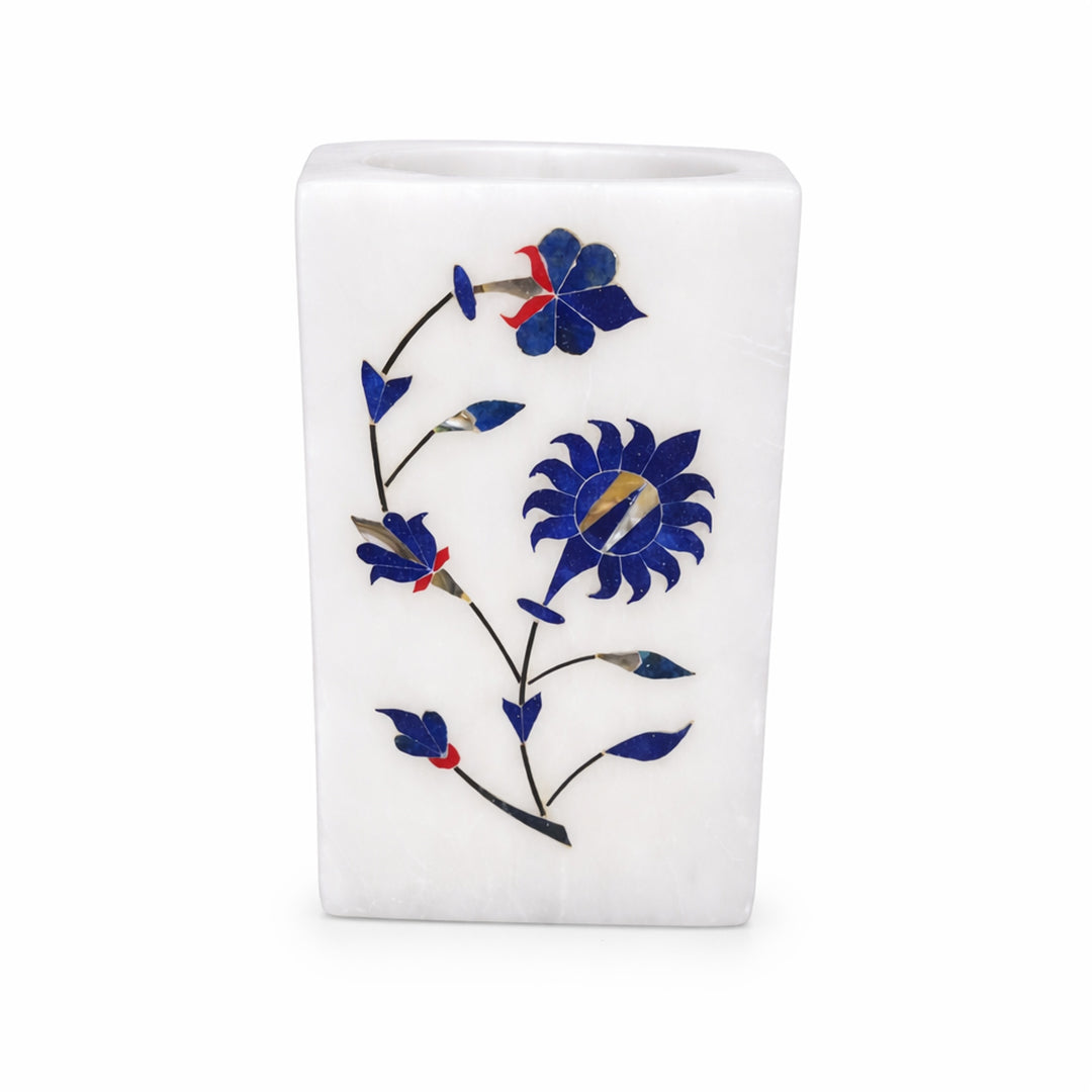 Handcrafted Alabaster Candle Holder with Lapis Lazuli Inlay – Pietra Dura Marble Vanity & Pen Holder