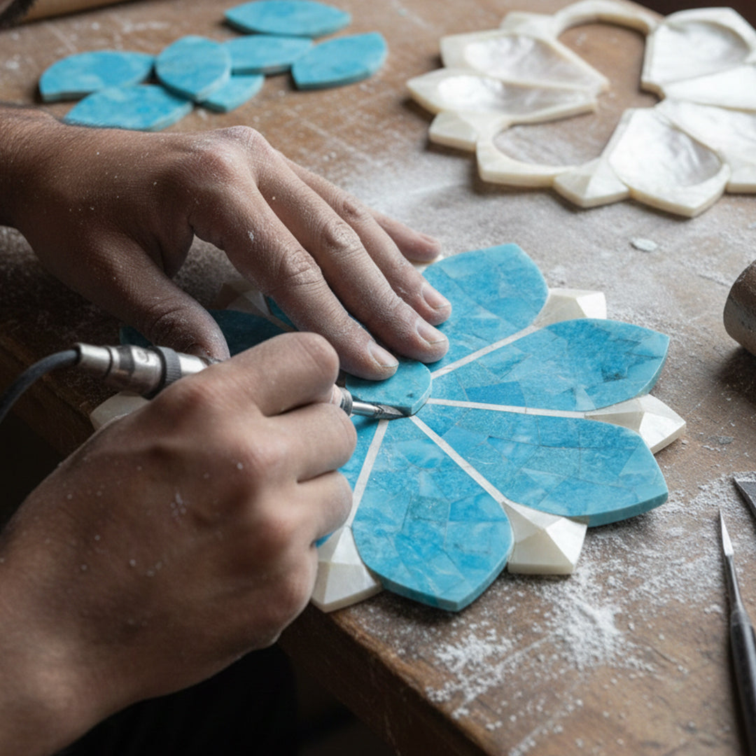 The Sangemarmar Marble Overlay Bowl is handmade from solid marble and finished with a semi-precious overlay of turquoise and mother of pearl—bringing color, light play, and surface depth you can’t get from ordinary finishes.