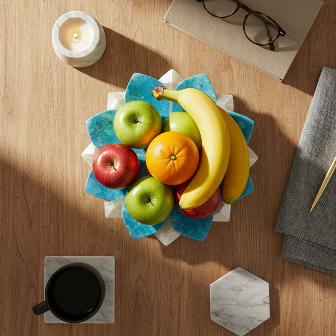 This bowl is made for customers who want fewer objects—but better ones: real marble, semi-precious overlay work, and a finish that holds its value in both look and use.