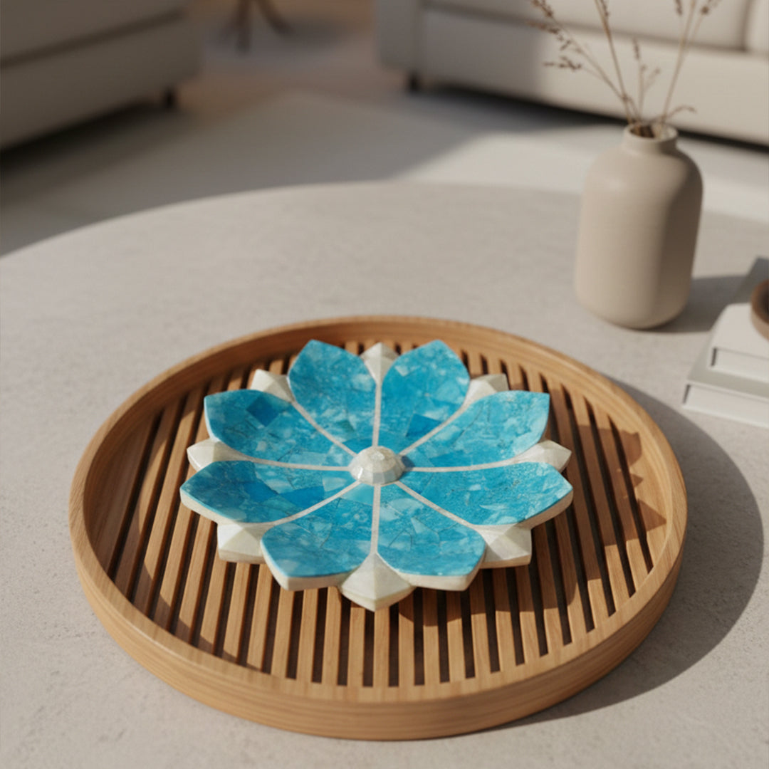 A polished marble bowl finished with turquoise and mother of pearl overlay—designed to sit beautifully on a table even when empty. The kind of piece that makes your space look finished, instantly.