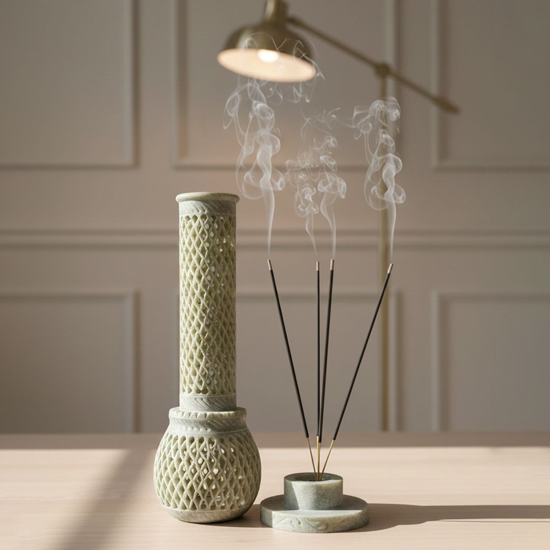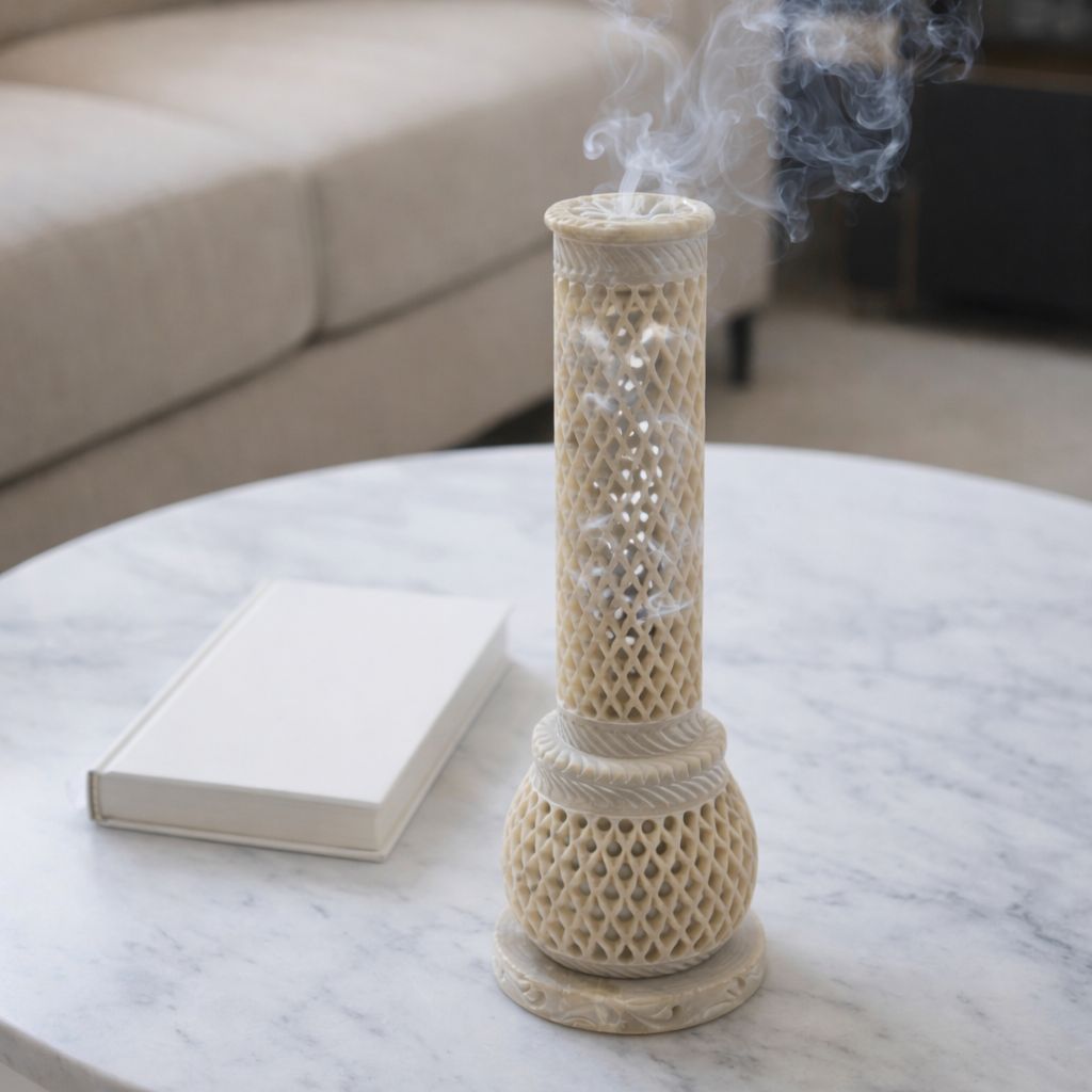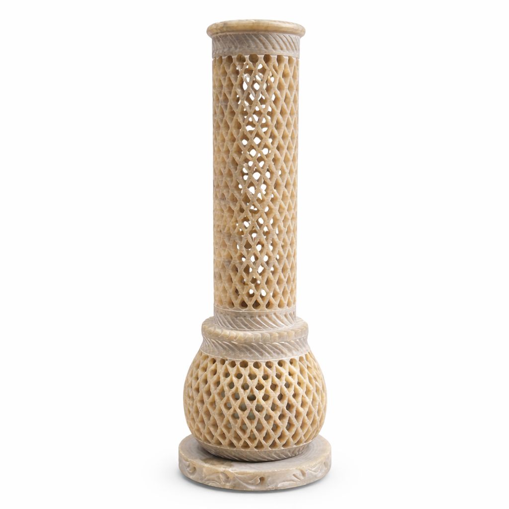 Bring a sense of calm and tradition to your space with this hand-carved soapstone incense holder, featuring intricate jaali (lattice) carving. Its tall, elegant form allows incense smoke to rise gently through the pierced stone, creating a soft, meditative atmosphere while keeping ash neatly contained.