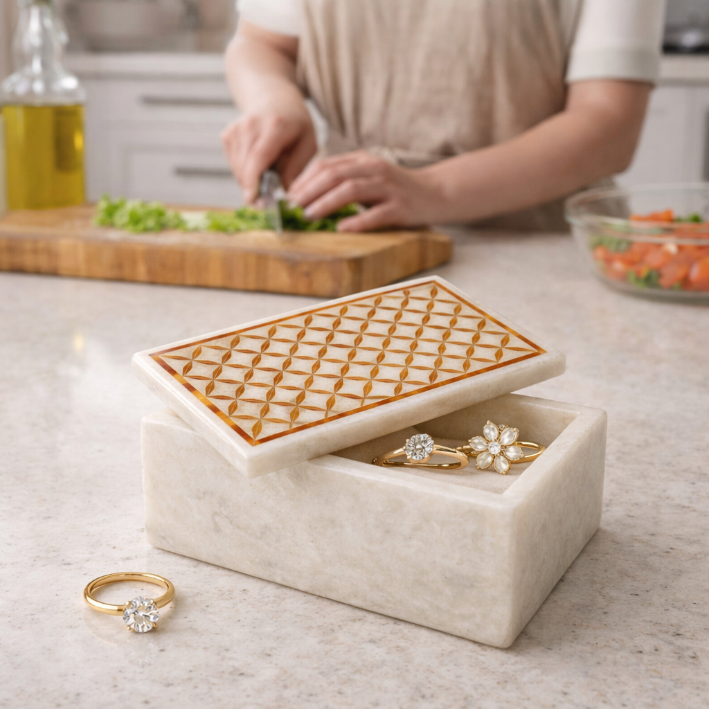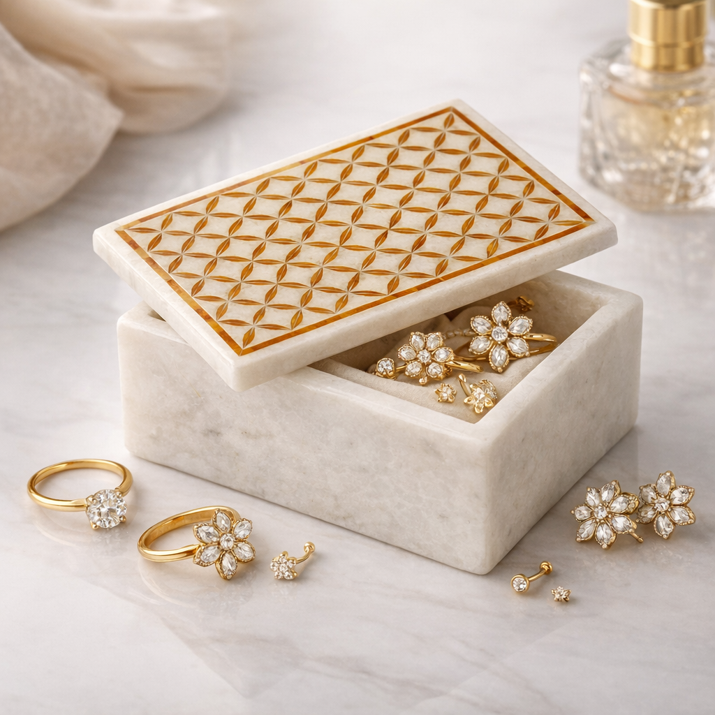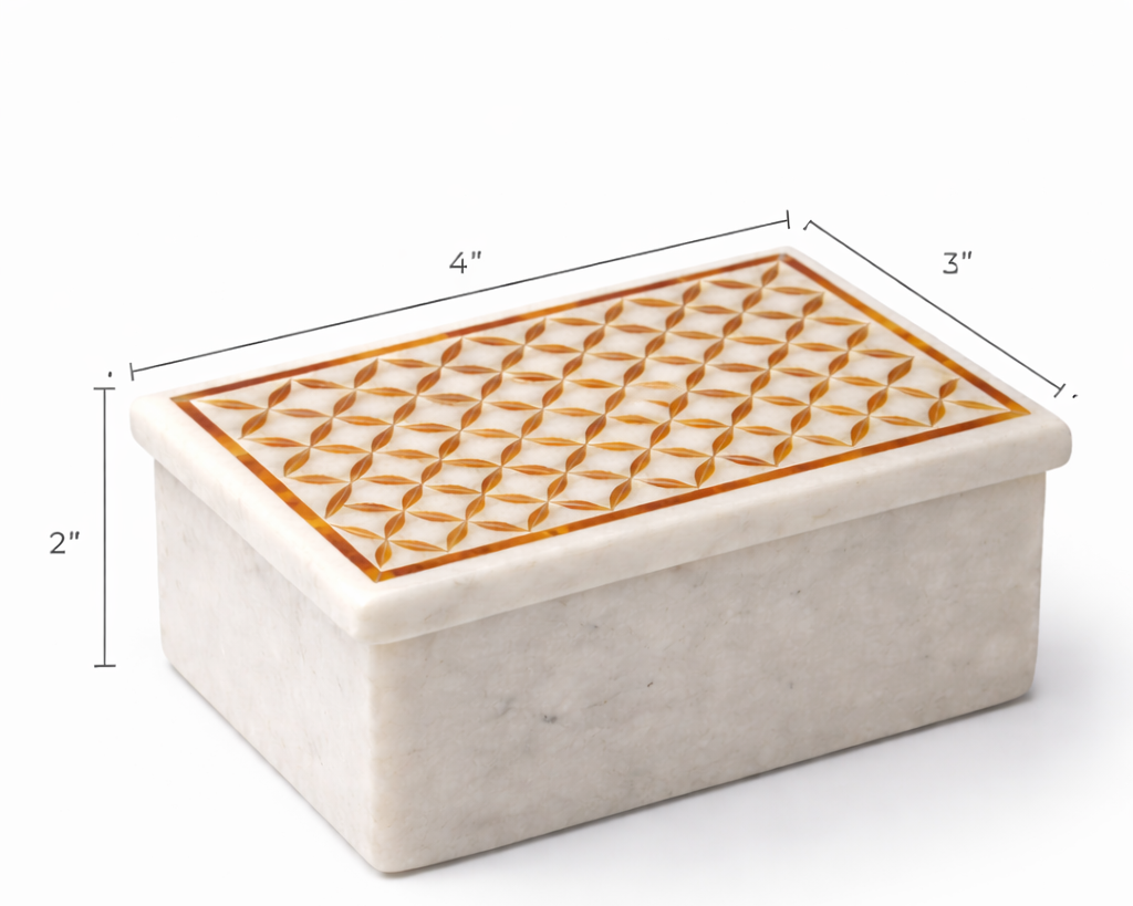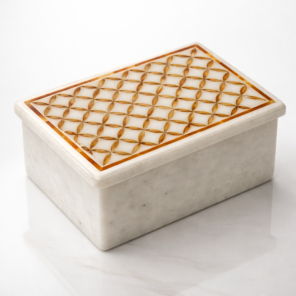 Handmade White Marble Jewelry Box with Geometric Inlay & Carnelian Accent