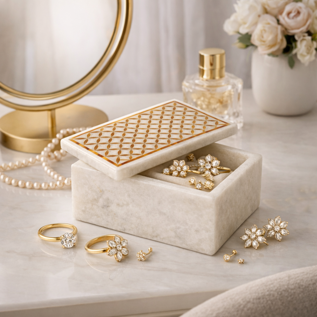 This handcrafted white marble jewelry box is a timeless blend of natural stone, fine craftsmanship, and subtle luxury. Featuring a beautifully engraved geometric pattern on the lid, highlighted with a warm carnelian gemstone accent, this box is designed to hold your most treasured pieces with elegance and care.