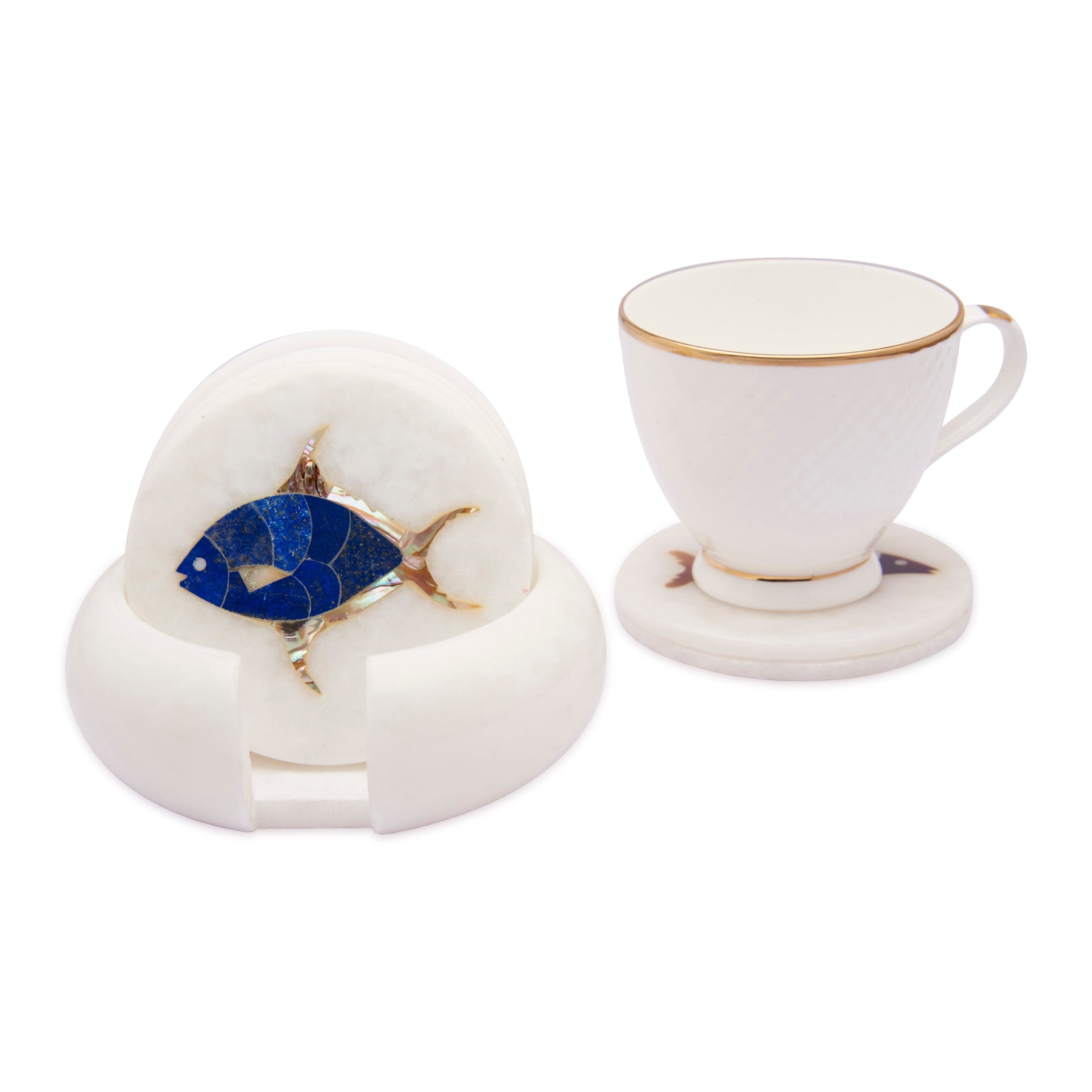 White Marble Coaster Set with Aquatic Inlay – an artistic blend of marine beauty and craftsmanship. Each of the 6 coasters, along with a matching holder, is handcrafted from premium white marble and adorned with vibrant fish motifs made using semi-precious gemstone inlay. Created by skilled artisans in Agra, India, using the traditional Pietra Dura technique, this set captures the lively essence of aquatic life through colorful stones like malachite, lapis lazuli, carnelian, abalone shell, and mother of pearl. Perfect for adding elegance and color to your coffee table or dining setup.