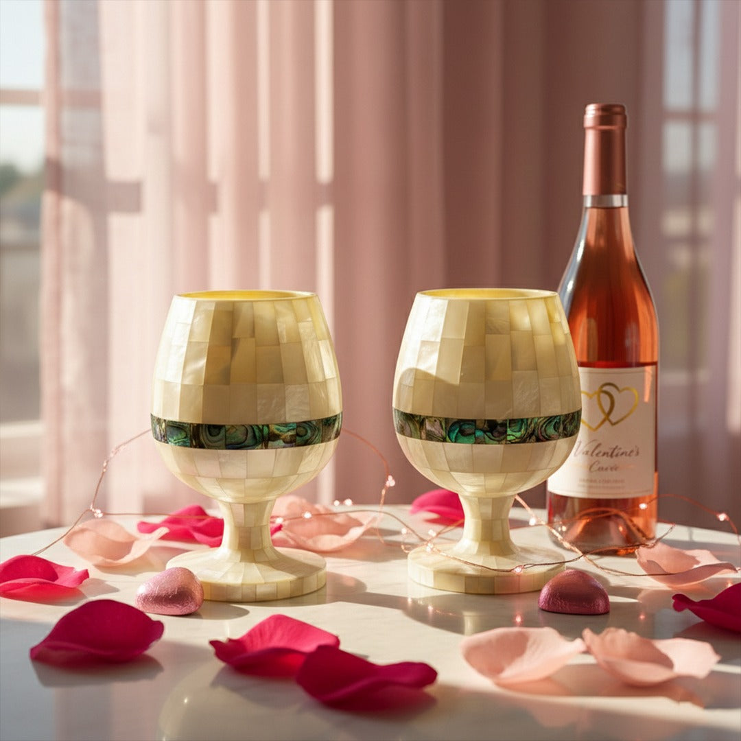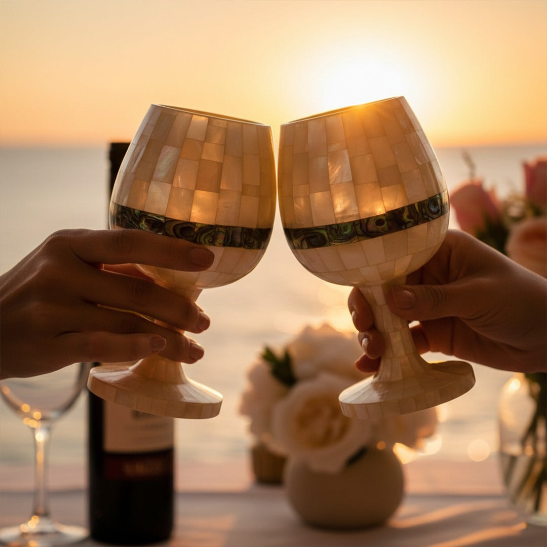 Elevate your wine ritual with this handcrafted marble wine goblet holder, designed as both a functional wine accessory and a luxury décor accent. Sculpted from natural white marble and meticulously finished with Mother of Pearl and abalone shell overlay, each piece reflects artisanal precision and timeless elegance. Unlike ordinary wine glasses, this piece is crafted entirely by hand, with carefully layered shell overlays that create a luminous mosaic surface. The iridescent abalone band adds subtle color play, making it a striking centerpiece for dining tables, bar carts, wine displays, or luxury gifting. Solid, weighty, and beautifully balanced, this marble wine holder is ideal for slow evenings, curated gatherings, and interiors that value handcrafted detail over mass production.