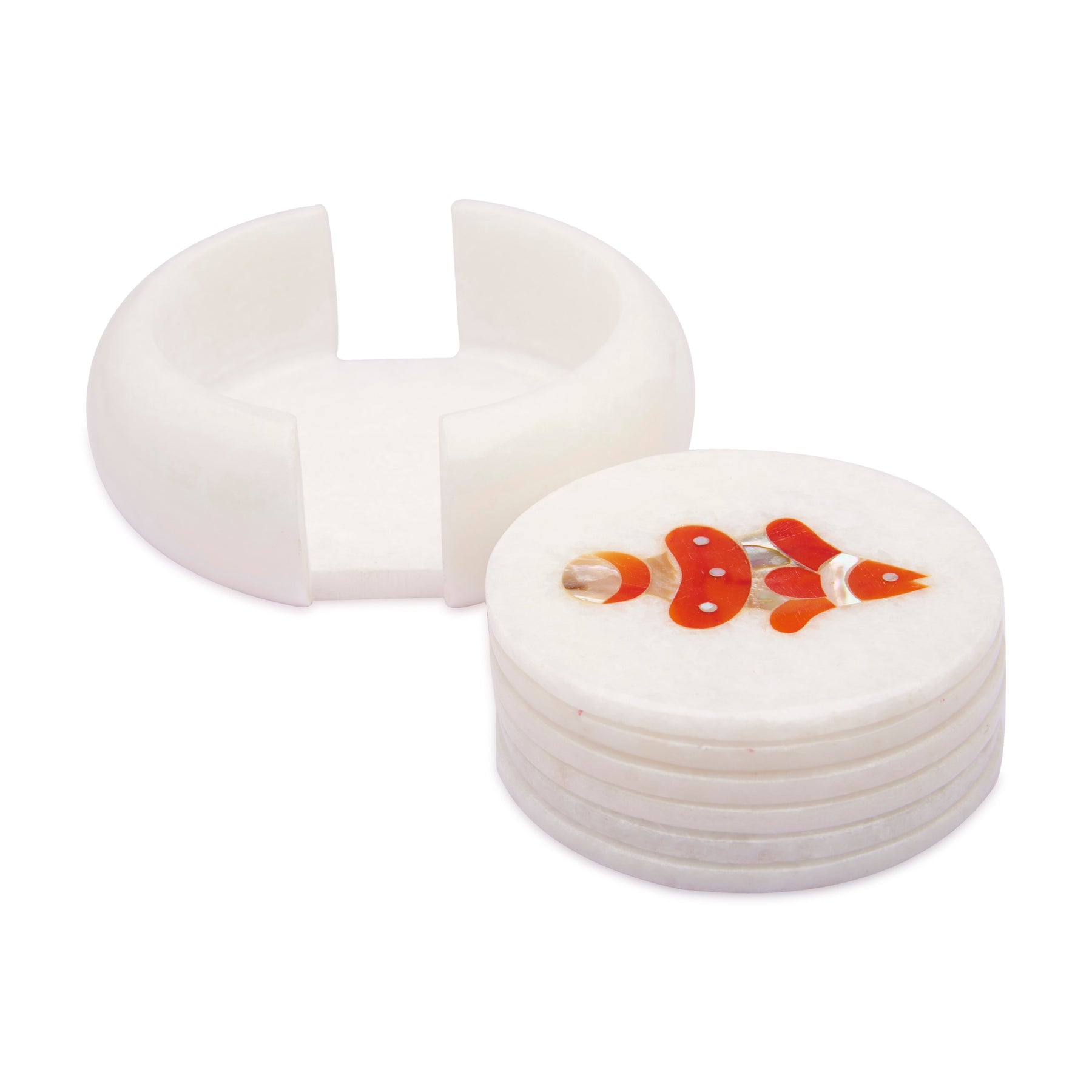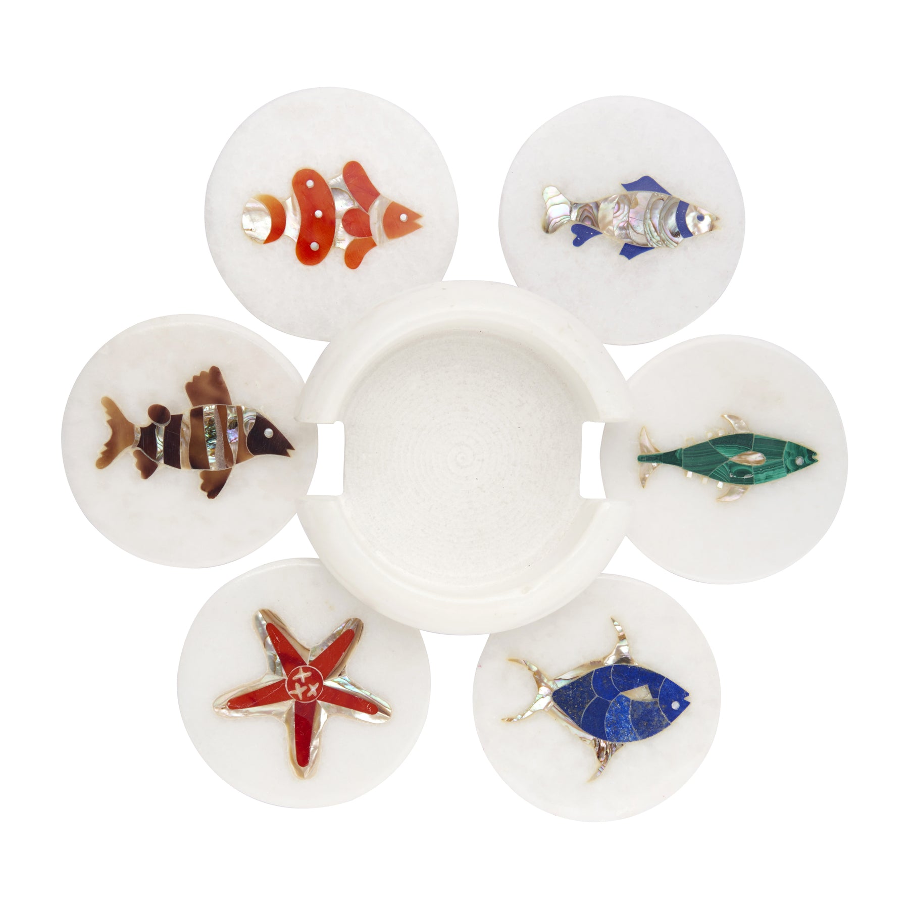 White Marble Coaster Set with Aquatic Inlay – an artistic blend of marine beauty and craftsmanship. Each of the 6 coasters, along with a matching holder, is handcrafted from premium white marble and adorned with vibrant fish motifs made using semi-precious gemstone inlay. Created by skilled artisans in Agra, India, using the traditional Pietra Dura technique, this set captures the lively essence of aquatic life through colorful stones like malachite, lapis lazuli, carnelian, abalone shell, and mother of pearl. Perfect for adding elegance and color to your coffee table or dining setup.