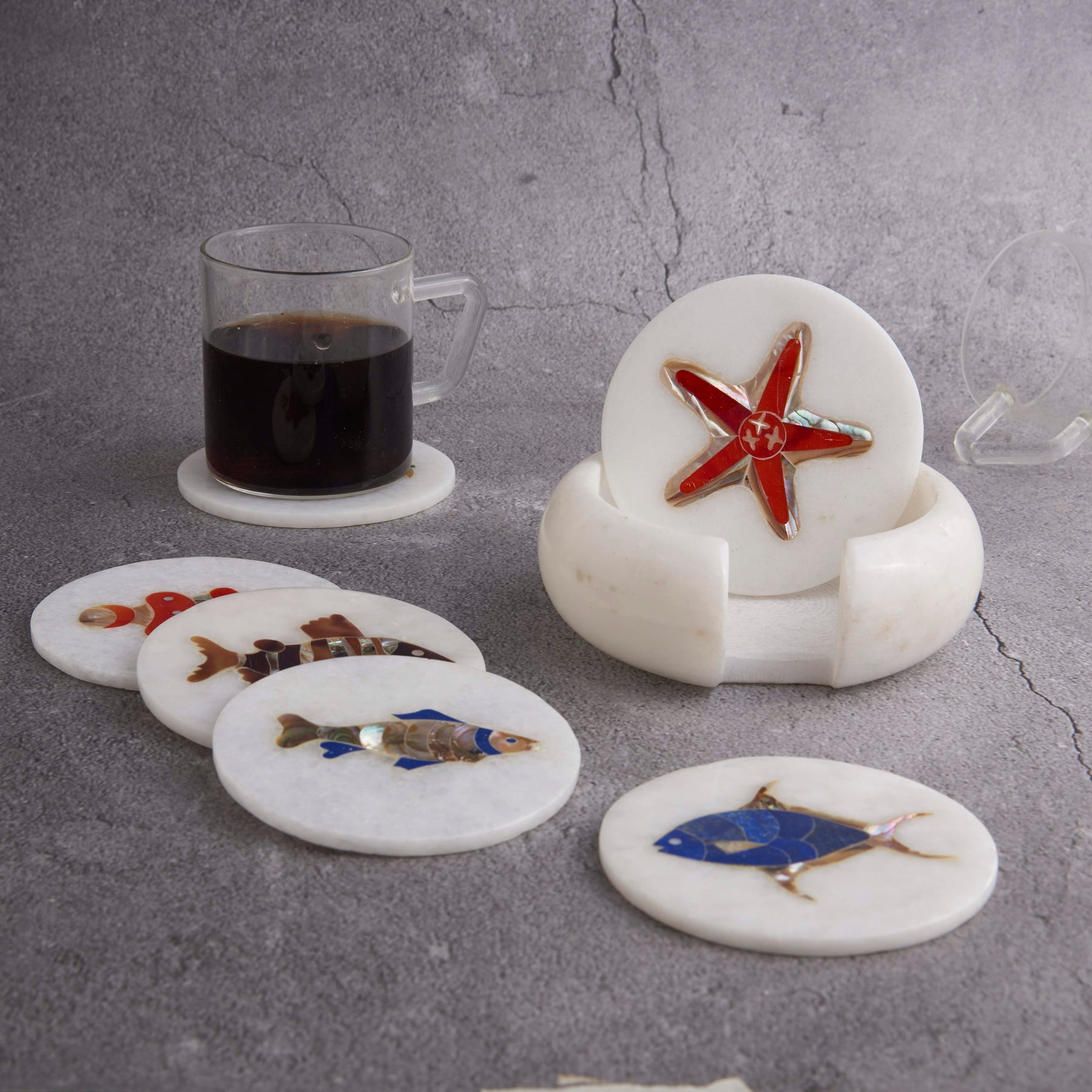 White Marble Coaster Set with Multi Color Gemstone Inlay Aquatic Art, Coasters for Coffee Table and Living Room