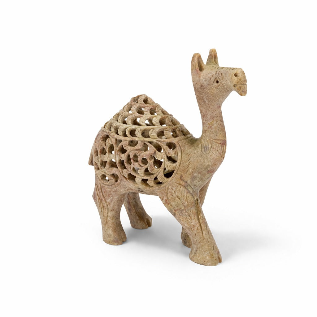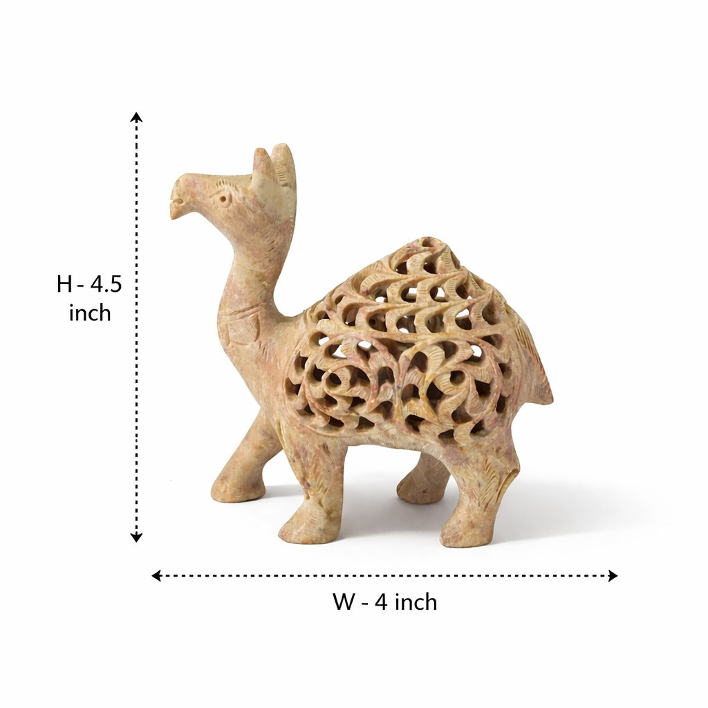 Bring home a symbol of strength, heritage, and timeless craftsmanship with this hand-carved sandstone camel figurine. Designed with intricate lattice under-cut artistry, it’s a perfect blend of traditional skill and modern decor elegance.