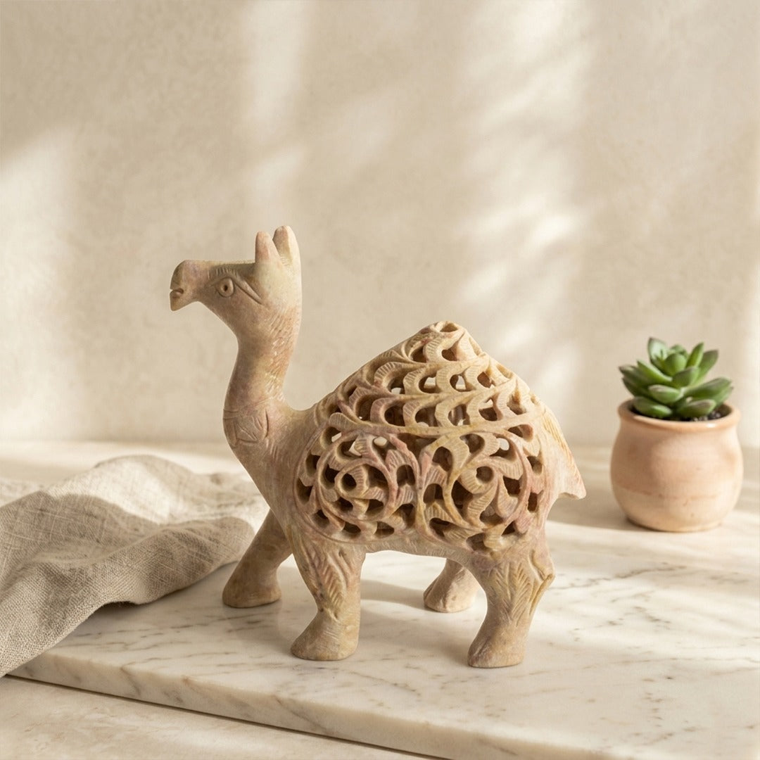 Inspired by the majestic desert camel, this sculpture represents resilience, stability, and cultural richness. Its elegant form and detailed carving make it a standout decor piece.