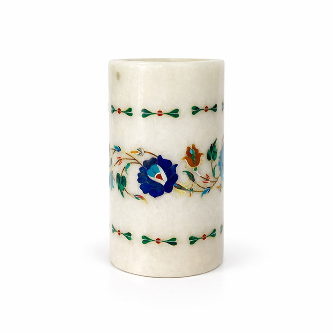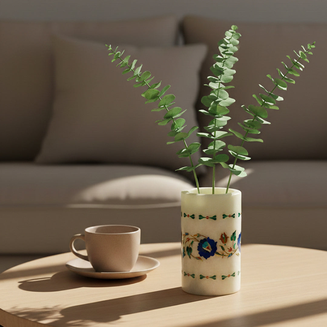 Handmade Marble Floral Inlay Vase | Natural Marble with Semi-Precious Stone Inlay