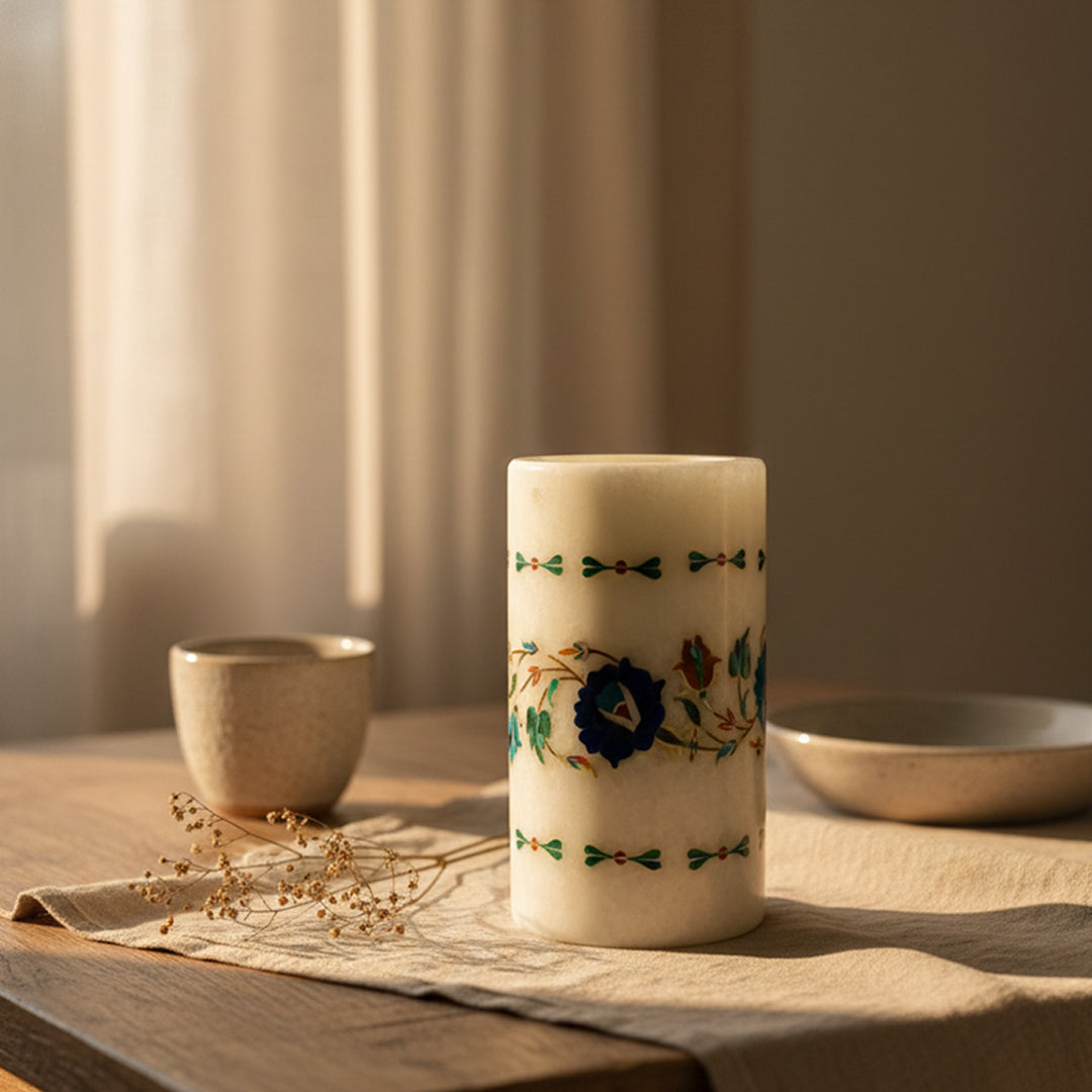Bring timeless elegance into your space with this Handmade Marble Floral Inlay Vase, crafted from natural marble and adorned with intricate multi semi-precious stone inlay work. Each floral motif is carefully hand-set, creating a refined surface that reflects light beautifully while showcasing true artisanal craftsmanship.