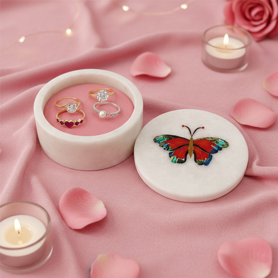 Bring timeless craftsmanship to your vanity or dresser with this Handcrafted White Marble Butterfly Jewelry Box. Made from natural white marble and detailed with semi-precious stone inlay, each box is individually carved and polished by artisans. The butterfly motif on the lid adds a touch of color and artistic charm, making this piece both functional storage and decorative art. Its compact round shape makes it ideal for rings, earrings, pendants, and small keepsakes without occupying much space.